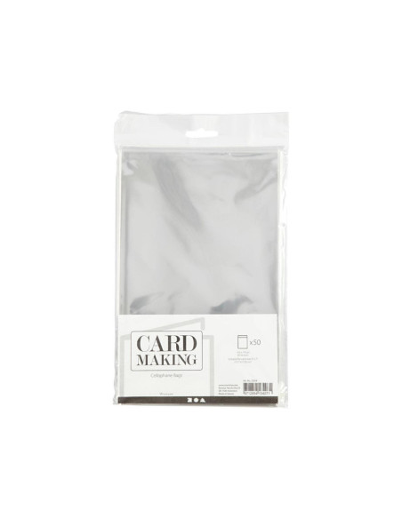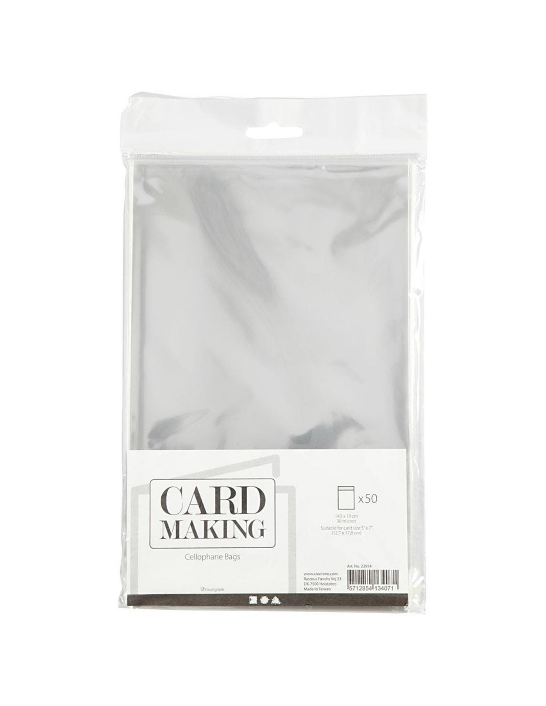 Cellofaan Zakjes, 50 stuks, buitenmaat is 14,5x19 cm. Geschikt voor kaarten met formaat 12,7x17,8 cm, dikte cellofaan is 30 micron.