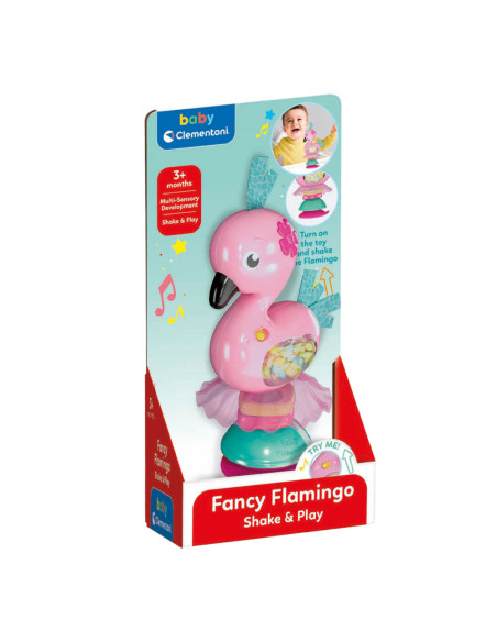 Een leuke rammelaar in de vorm van een flamingo om het kind bezig te houden, ook tijdens het eten. Door de rammelaar te bewegen hoort het kind leuke melodietjes en geluidseffecten, terwijl de gekleurde ballen en hangers de aandacht van het kind trekken en de tactiele waarneming stimuleren. Met een handige zuignap om de rammelaar op tafel of op de kinderstoel te zetten tijdens het eten. Ontdek alle elektronische rammelaars van de lijn Baby Clementoni Speelgoed geschikt vanaf 3 maanden.