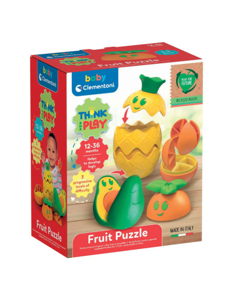 Drie kleurrijke vruchten van gerecycled plastic om de geest te voeden en het logisch denkvermogen van kleine kinderen te stimuleren! Hoogwaardig, ecologisch verantwoord speelgoed met een elegant, Italiaans ontwerp. Het in elkaar zetten van de vruchten stimuleert het logisch denkvermogen met steeds moeilijkere spelvarianten, om kinderen tijdens hun groei te begeleiden bij de ontwikkeling van hun vaardigheden. De avocado gaat open en heeft een pit om weg te halen en terug te plaatsen. De ananas bestaat uit stapelbare elementen. De sinaasappel heeft 4 parten om weg te halen en weer terug te plaatsen. Elke vrucht stimuleert verschillende handvaardigheden en diverse zintuiglijke ervaringen dankzij de texturen.