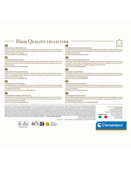 De meest aansprekende afbeeldingen, de grootste verscheidenheid aan formaten en de kenmerkende Clementoni-kwaliteit voor een reeks die overal de gouden standaard is voor liefhebbers van puzzels. Clementoni houdt altijd rekening met het milieu en maakt daarom veelvuldig gebruik van gerecyclede materialen, waarbij gebruik van vervuilende onderdelen wordt vermeden. Gemaakt in Italië.