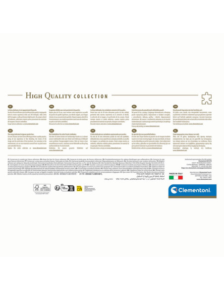 De meest aansprekende afbeeldingen, de grootste verscheidenheid aan formaten en de kenmerkende Clementoni-kwaliteit voor een reeks die overal de gouden standaard is voor liefhebbers van puzzels. Clementoni houdt altijd rekening met het milieu en maakt daarom veelvuldig gebruik van gerecyclede materialen, waarbij gebruik van vervuilende onderdelen wordt vermeden. Gemaakt in Italië.