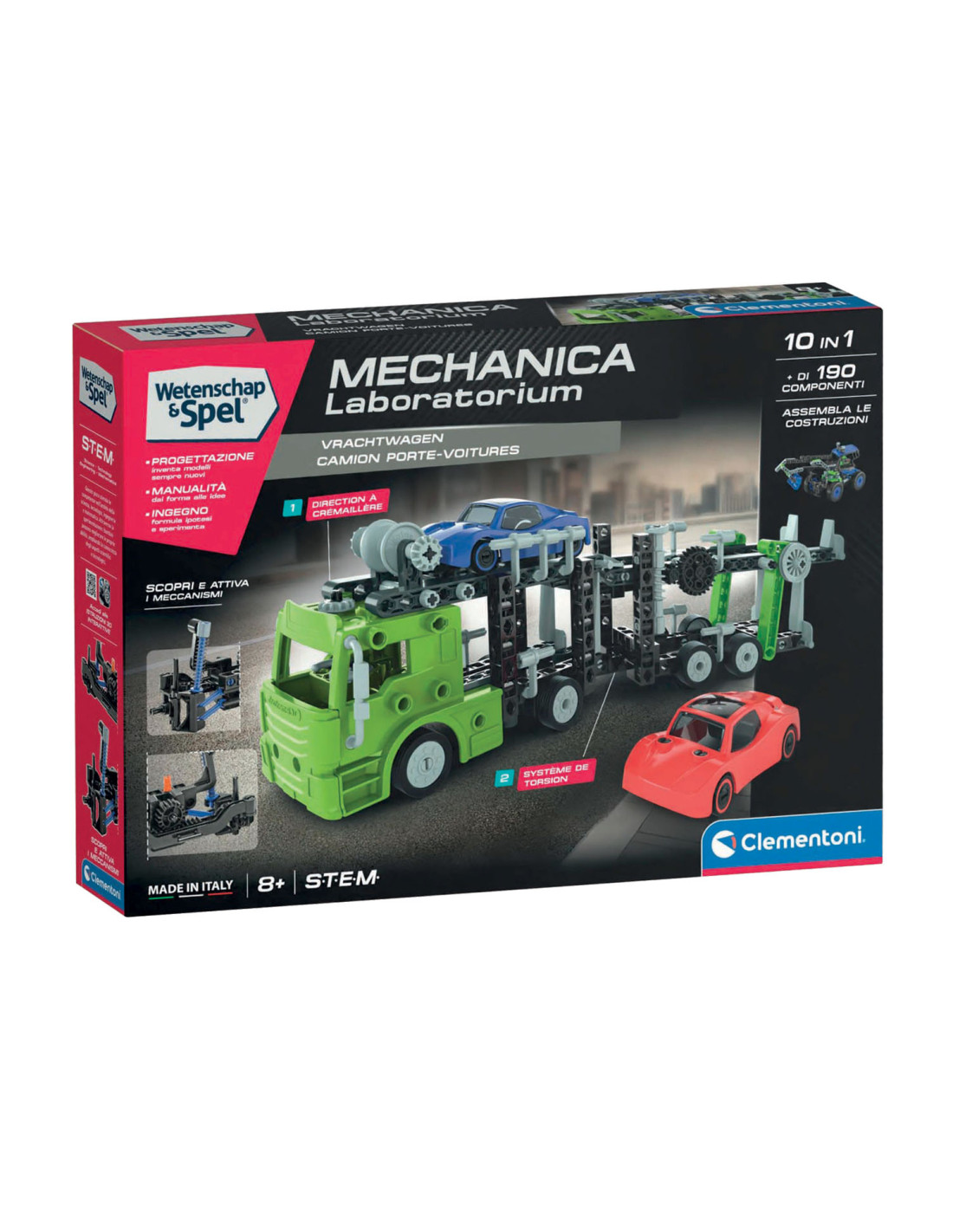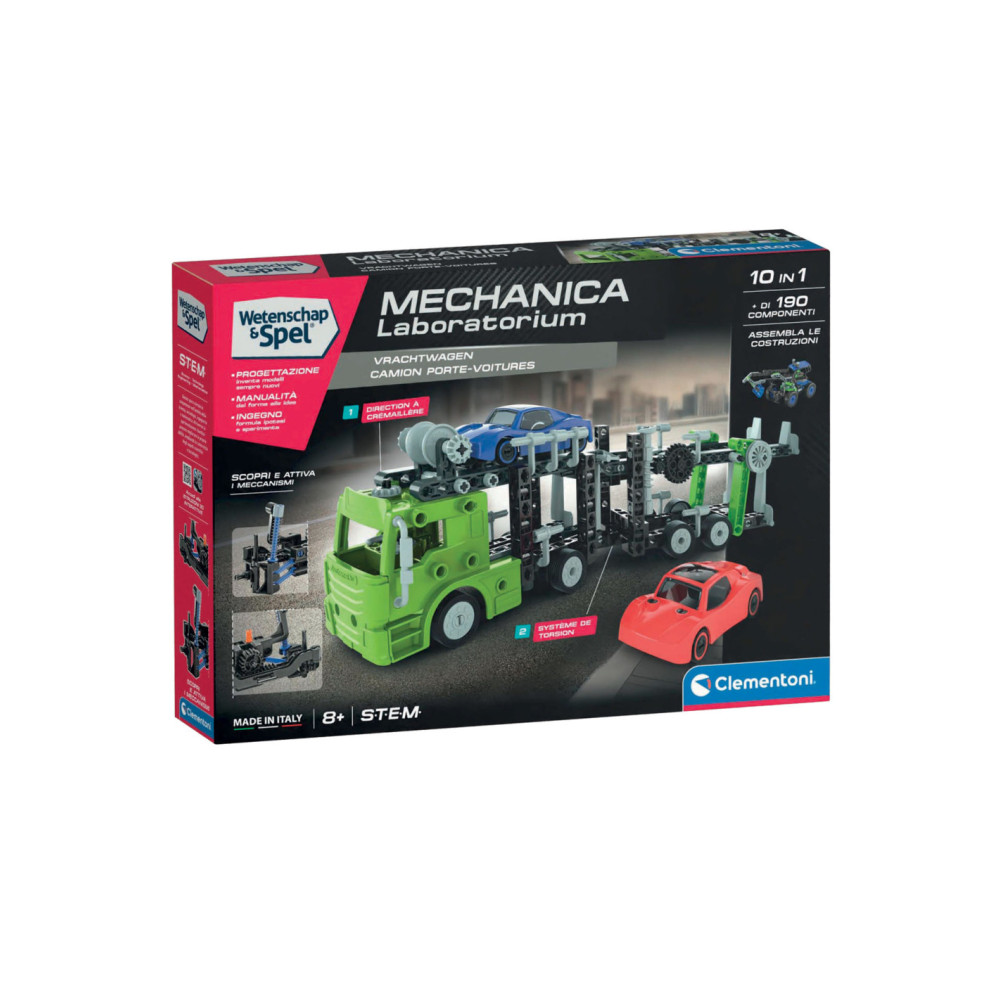 Een fantastische set om een autotransporter te bouwen. Kinderen kunnen op verschillende manieren met de autotransporter spelen dankzij de twee autootjes in de set die in elkaar gezet moeten worden. Er zijn veel bewegingen mogelijk om de mechanica van de autotransporter te leren kennen: de bovenste oprijplaat die omlaag gaat, het stuursysteem en de verstelbare wanden aan de achterkant. Door verschillende onderdelen te monteren testen kinderen hun ideeën uit en controleren ze concreet of de gevonden oplossingen al of niet werken. Made in Italy.