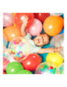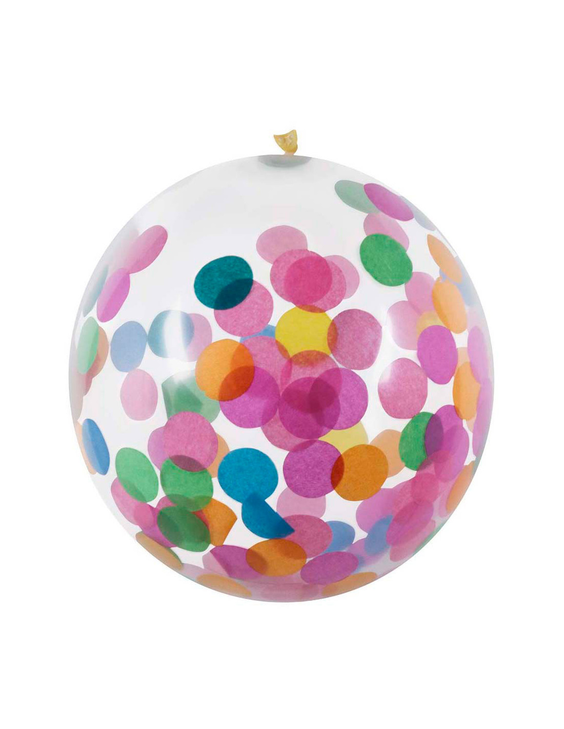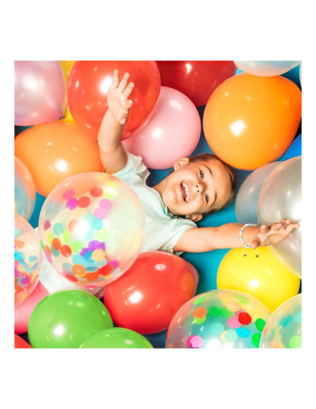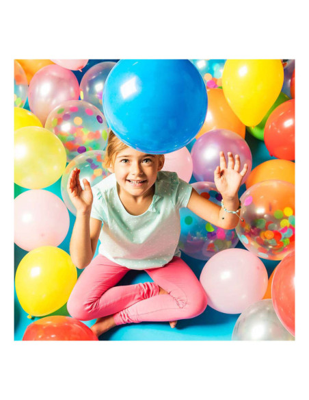 Set van 5 transparante latexballonnen met kleurrijke confetti, diameter 30 cm. Geschikt vanaf 8 jaar.