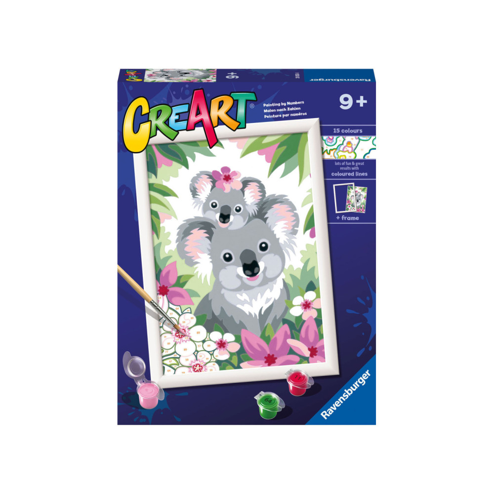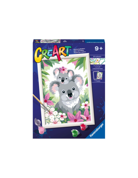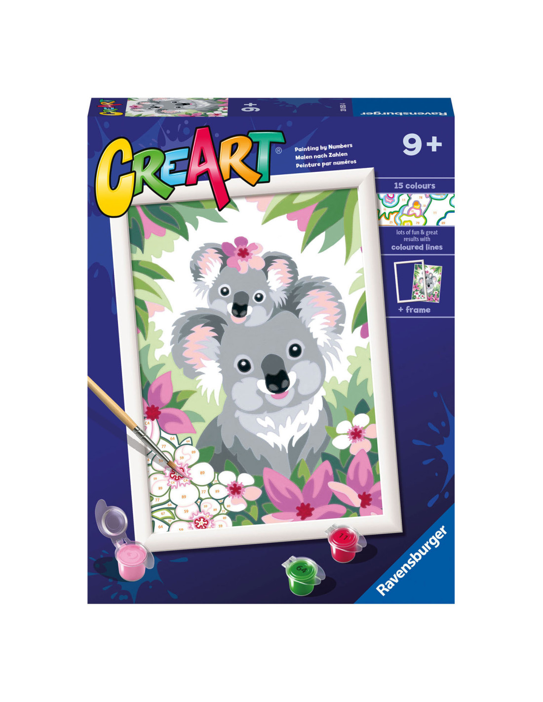 Schilder het kunstwerk CreArt Koala Cuties!Schilderen op nummer van Ravensburger - iedereen kan schilderen! Dankzij de eenvoudige schildertechniek van schilderen op nummer is het kinderlijk eenvoudig de kunstenaar in jezelf wakker te maken! Dankzij de duidelijke schildervakjes met gekleurde buitenlijnen ontstaat een klein en prachtig kunstwerk van x . De fijnere kleurnuanceringen zorgen voor een elegant kleurverloop en schaduwspel. Uitpakken en aan de slag, met de afbeelding van Koala Cuties!Iedereen Kan Schilderen! De schilderset bevat hoogwaardig materiaal: acrylverf op waterbasis in hersluitbare potjes, schilderpaneel en penseel. De verschillende series zijn verdeeld in verschillende moeilijkheidsniveaus: eenvoudig met weinig maar grote schildervlakken voor de kleinsten tot heel geraffineerd met veel kleine vakjes voor geroutineerde schilders.