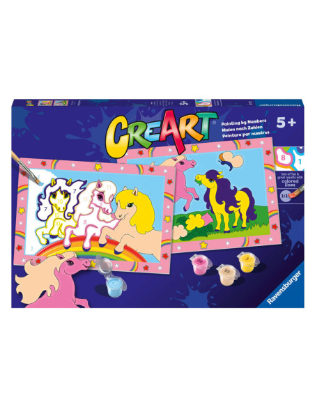 Schilder het kunstwerk CreArt Prancing Ponies!Schilderen op nummer van Ravensburger - iedereen kan schilderen! Dankzij de eenvoudige schildertechniek van schilderen op nummer is het kinderlijk eenvoudig de kunstenaar in jezelf wakker te maken! Dankzij de duidelijke schildervakjes met gekleurde buitenlijnen ontstaat een klein en prachtig kunstwerk van x . De fijnere kleurnuanceringen zorgen voor een elegant kleurverloop en schaduwspel. Uitpakken en aan de slag, met de afbeelding van Prancing Ponies!Iedereen Kan Schilderen! De schilderset bevat hoogwaardig materiaal: acrylverf op waterbasis in hersluitbare potjes, schilderpaneel en penseel. De verschillende series zijn verdeeld in verschillende moeilijkheidsniveaus: eenvoudig met weinig maar grote schildervlakken voor de kleinsten tot heel geraffineerd met veel kleine vakjes voor geroutineerde schilders.