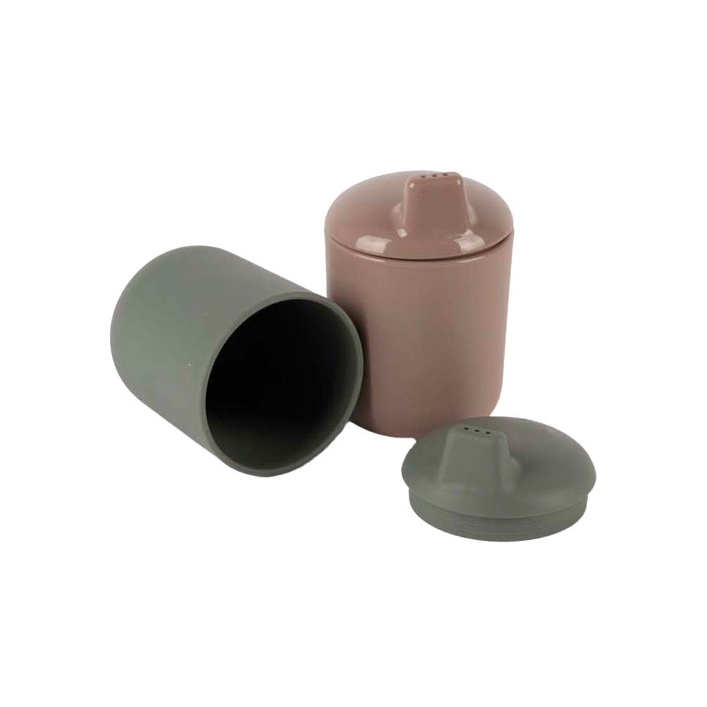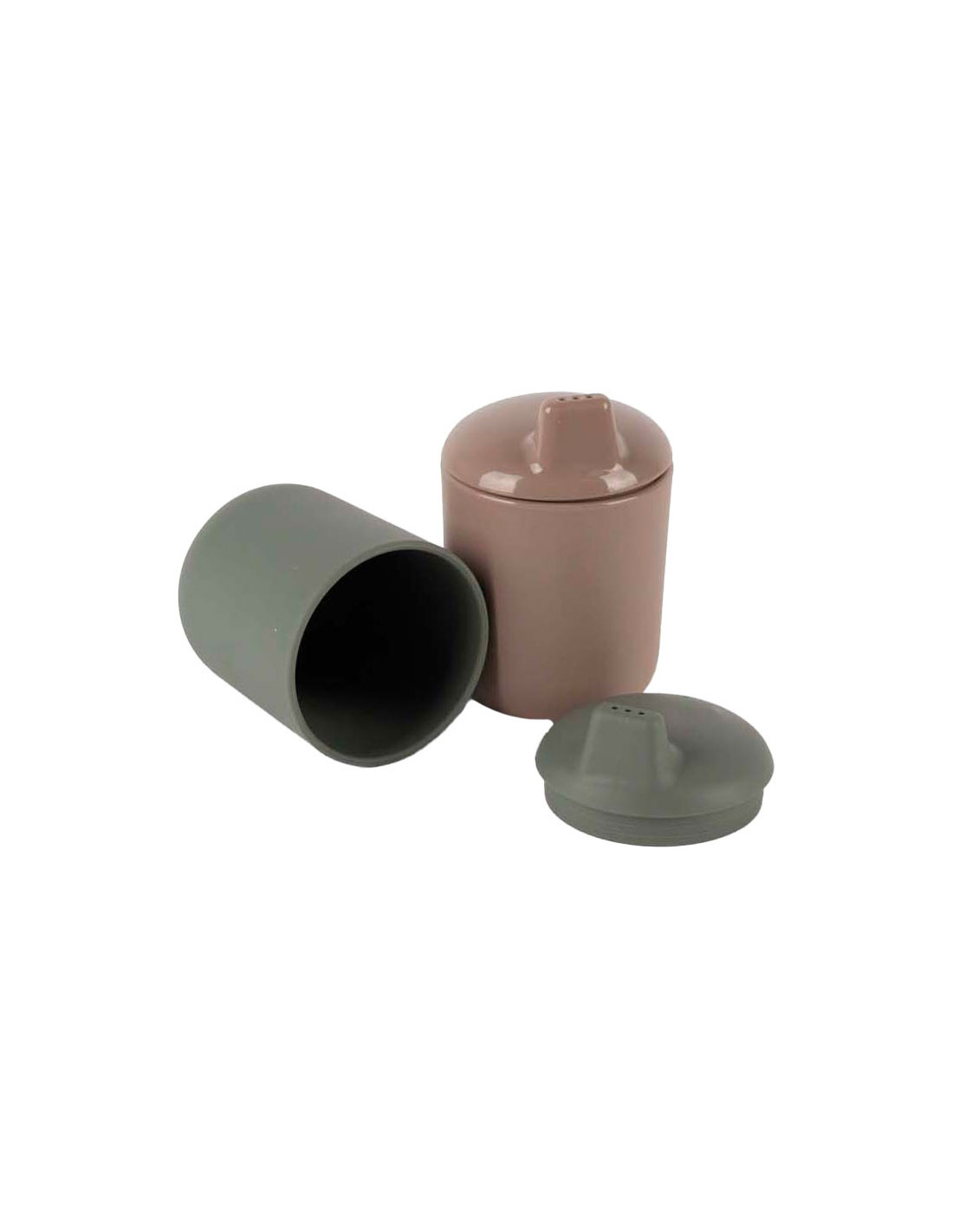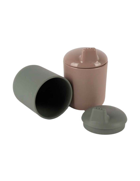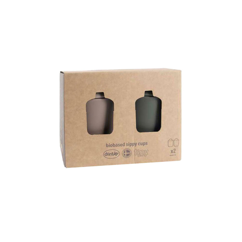 Dantoy anti-knoei drinkbekers mokka/olijfgroen, 2-delig. Gemaakt van BIOplastic (suikerriet), ca. 14 × 11 × 7 cm. Vanaf 6 maanden, vaatwasserbestendig en voedselveilig.