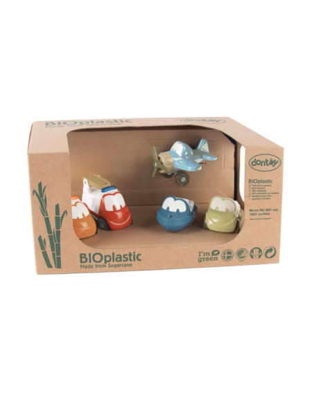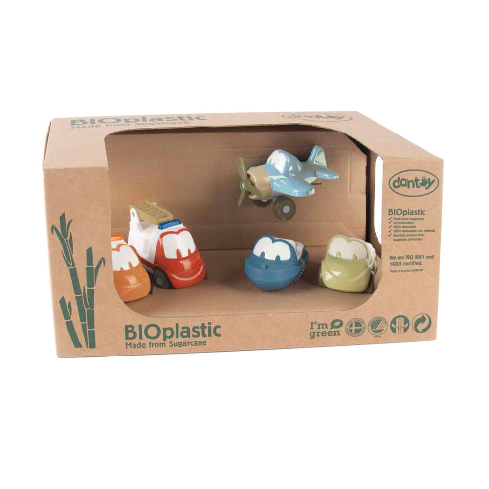 Dantoy voertuigenset met 3 auto’s, 1 boot en 1 vliegtuig, gemaakt van BIOplastic (suikerriet). Stevig, handzaam en vrij van schadelijke stoffen, geschikt voor kinderen vanaf 2 jaar.