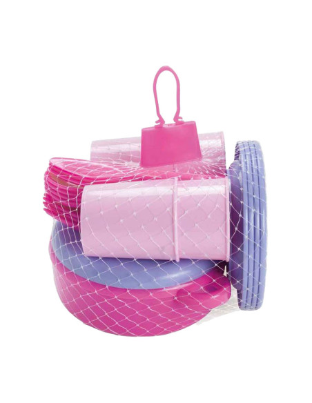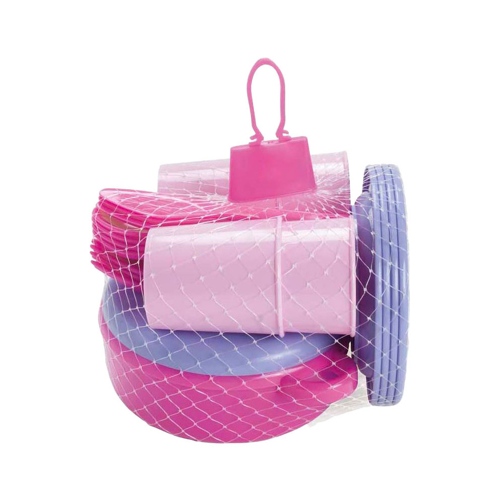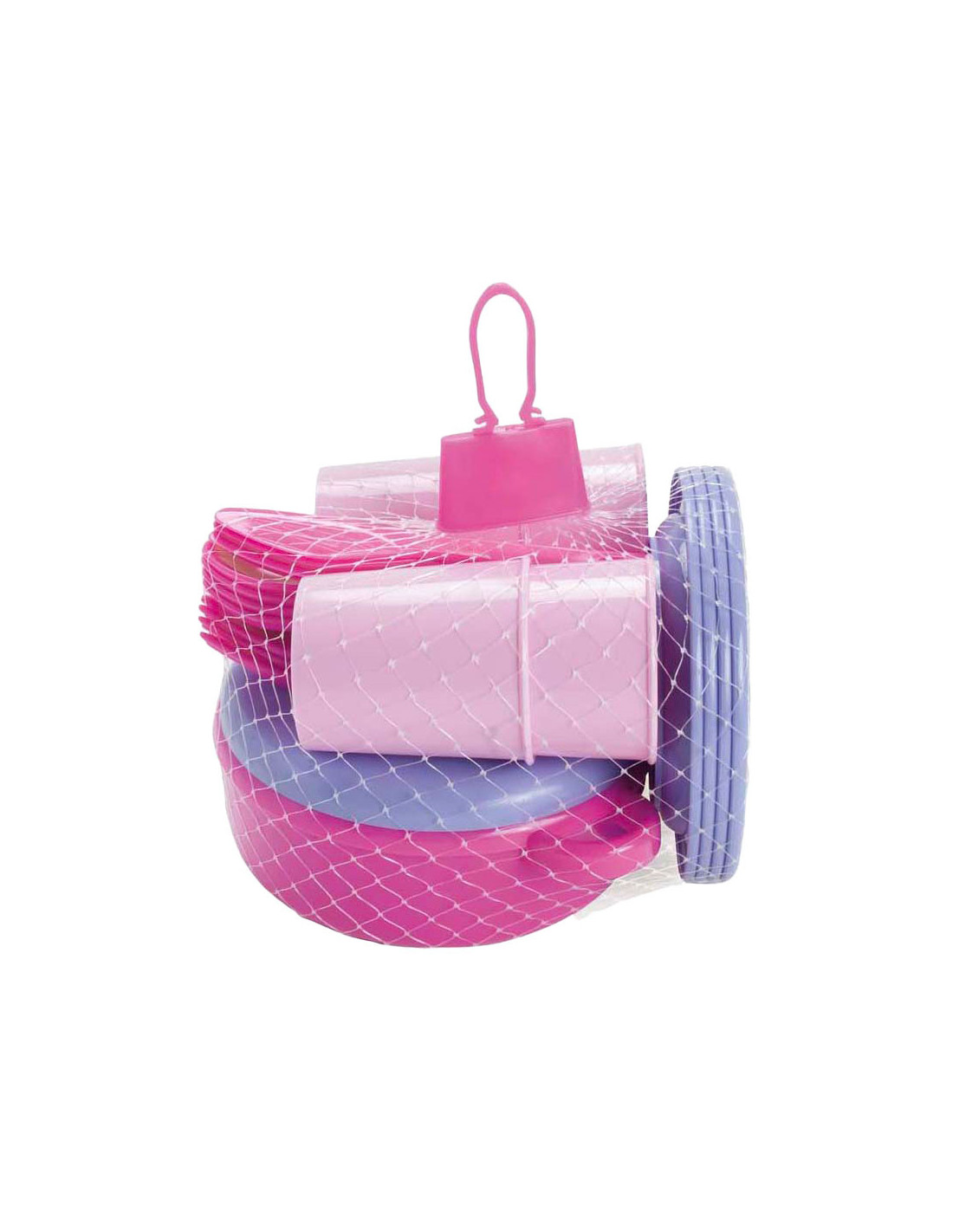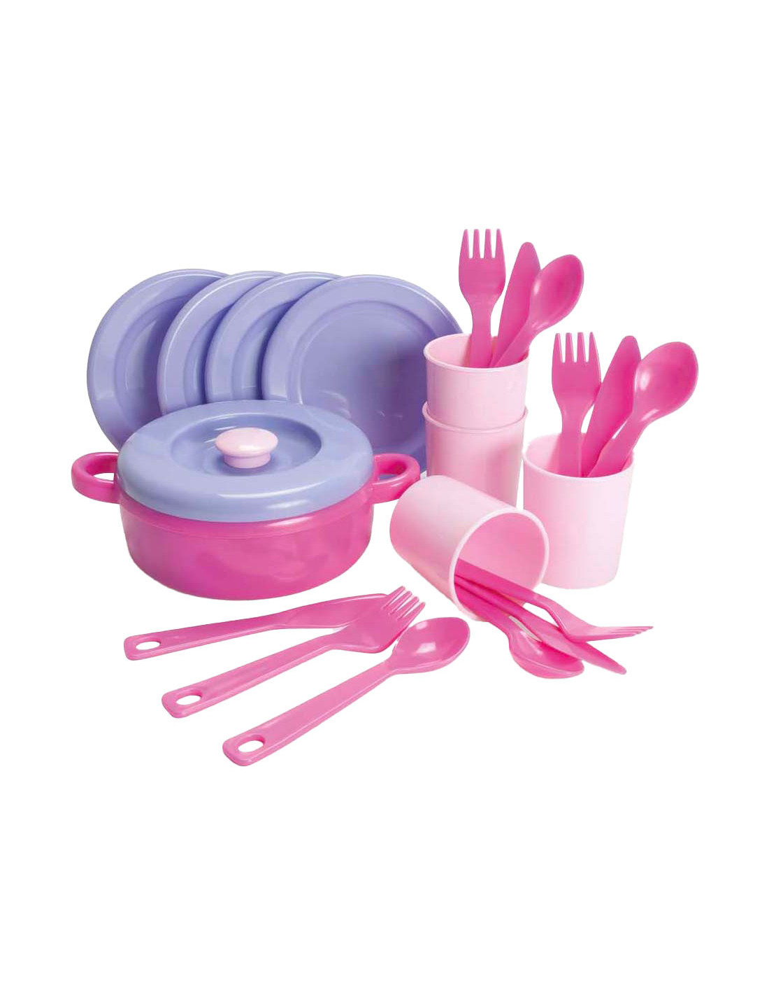 Dantoy eetservies in roze en lila pastelkleuren, 22-delig, met borden, bekers, bestek en schalen. Lichtgewicht, stevig en vrij van PVC en ftalaten, geschikt voor kinderen vanaf 2 jaar.