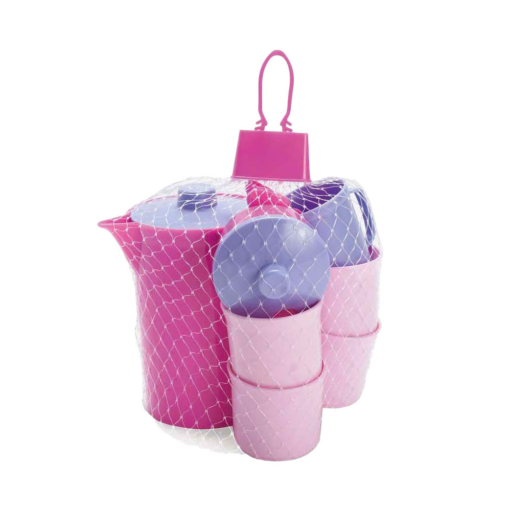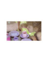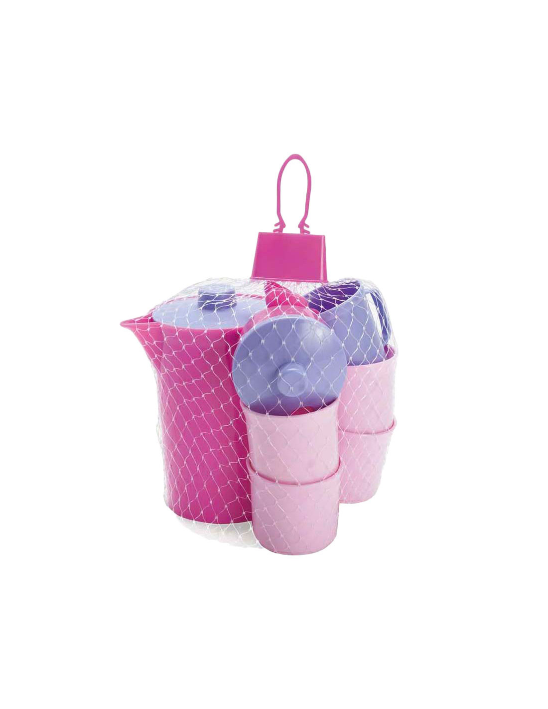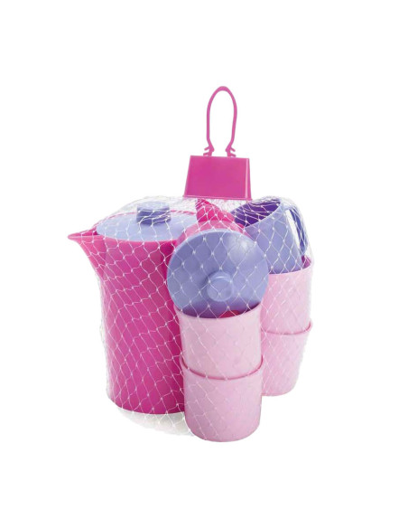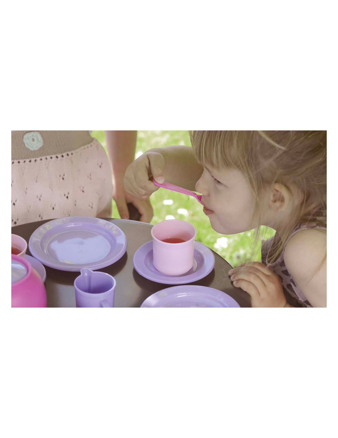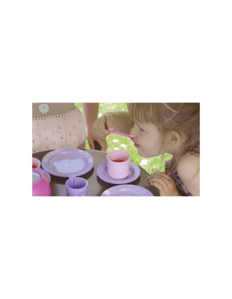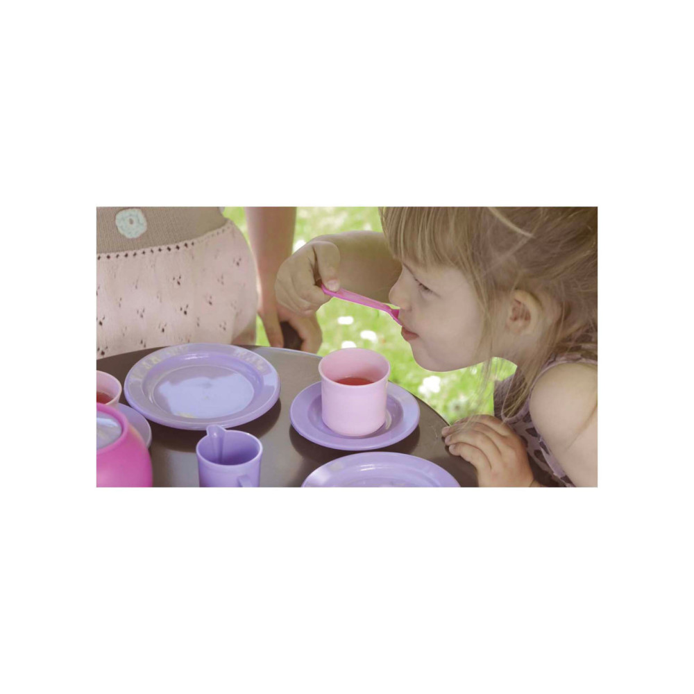Dantoy koffieset in roze en lila tinten, 17-delig, met kopjes, schoteltjes en accessoires. Lichtgewicht, stevig en vrij van PVC en ftalaten, geschikt voor kinderen vanaf 2 jaar.