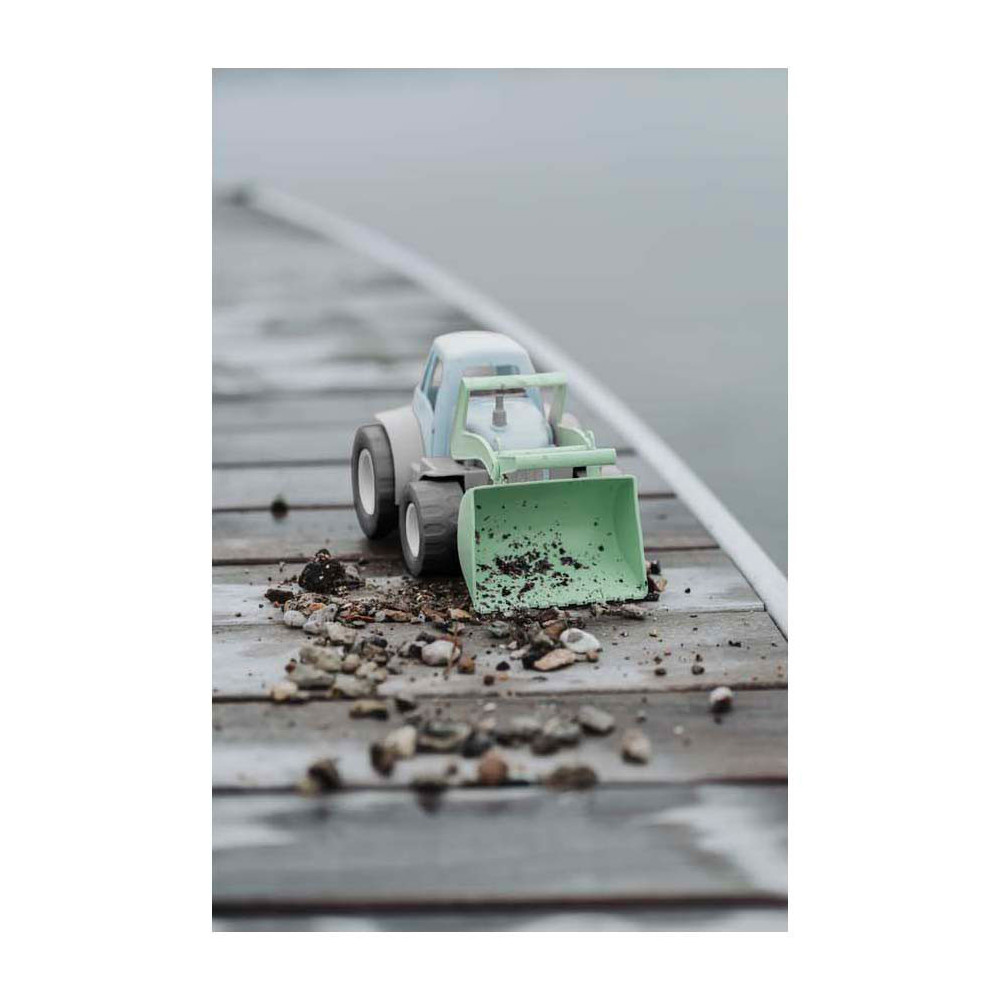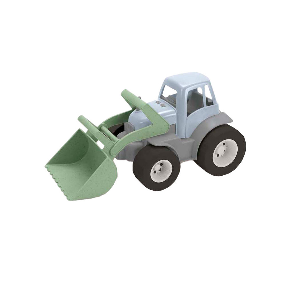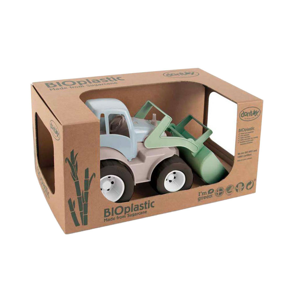 Dantoy tractor met voorlader van ca. 30 cm lang in pastel groen, blauw en grijs. Gemaakt van BIOplastic (suikerriet), stevig, makkelijk te besturen en vrij van schadelijke stoffen, geschikt voor kinderen vanaf 2 jaar.