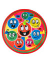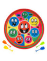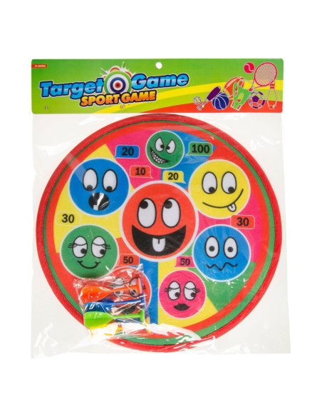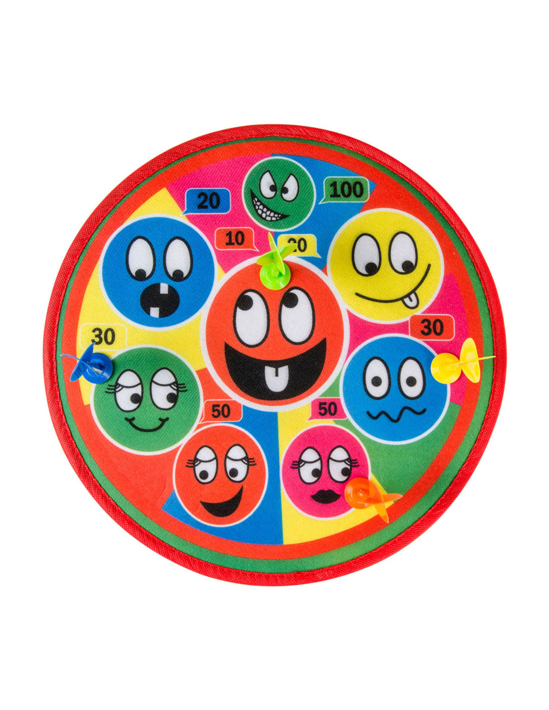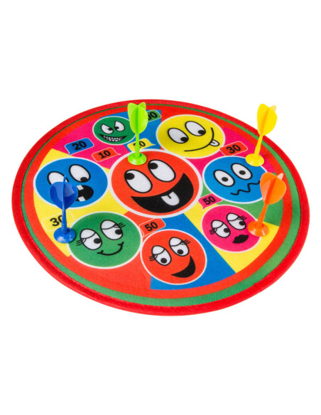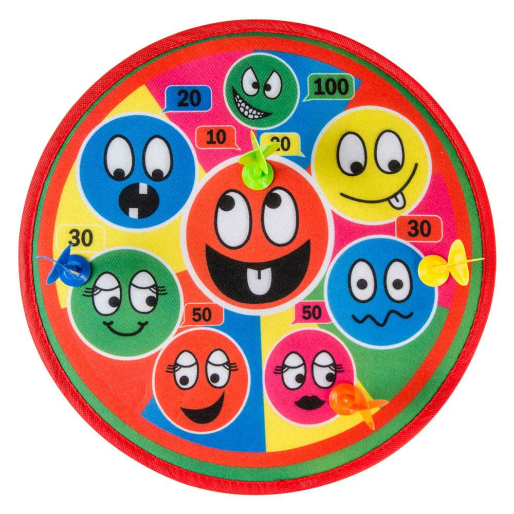 Klittenband dartspel met print van lachgezichten. Het dartboard heeft een diameter van 36 centimeter en wordt geleverd met 4 pijlen. Geschikt vanaf 3 jaar.