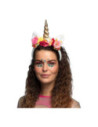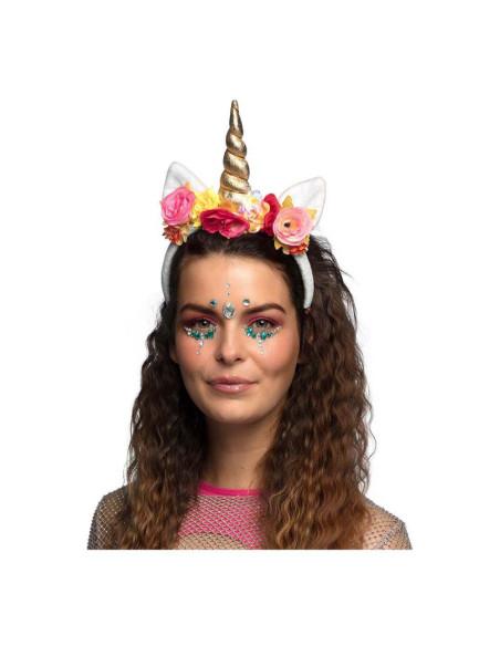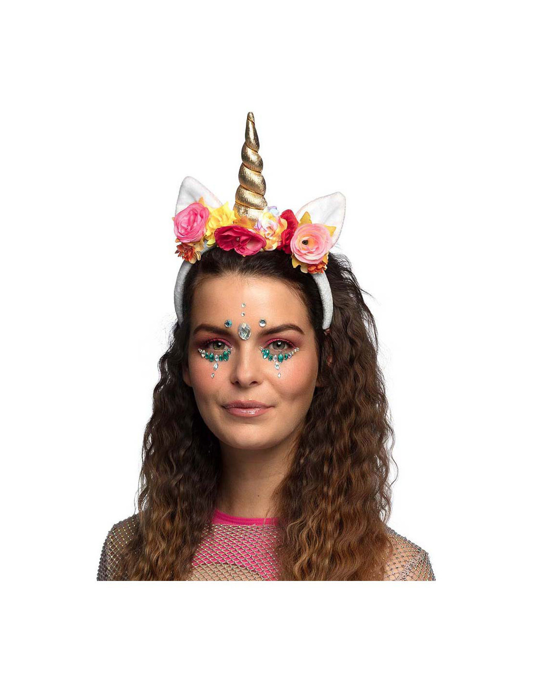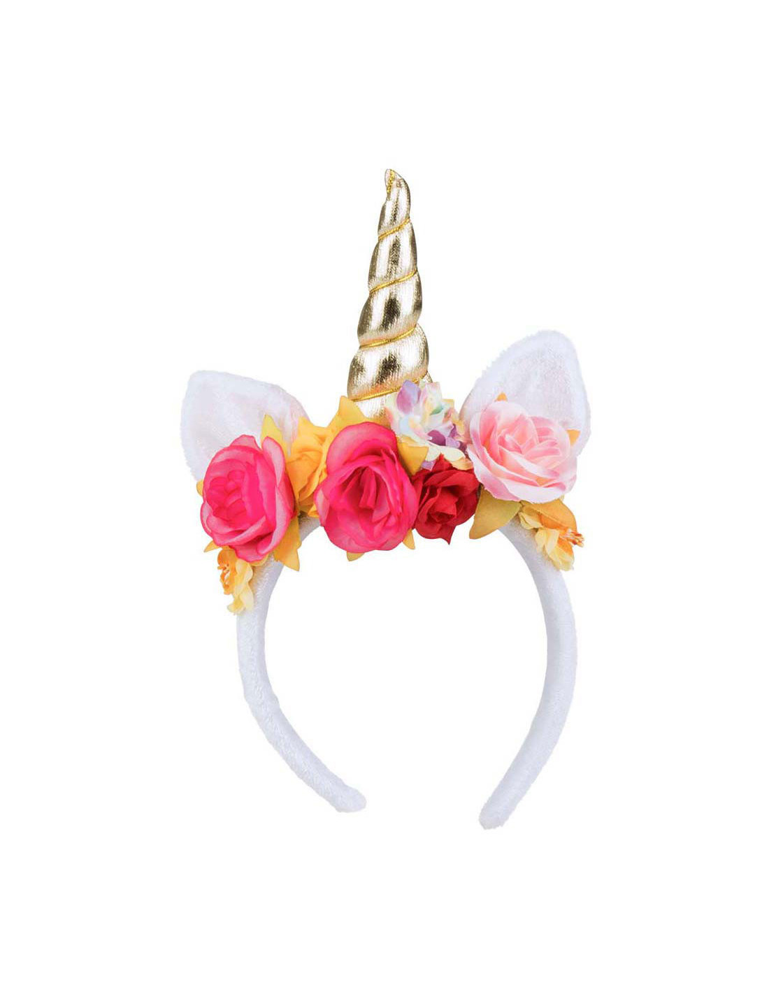 Eenhoorn haarband met glanzende hoorn, oortjes en bloemen, gemaakt van 91% polyester en 9% polypropyleen. Hoofdomtrek circa 59 cm. Geschikt vanaf 14 jaar.