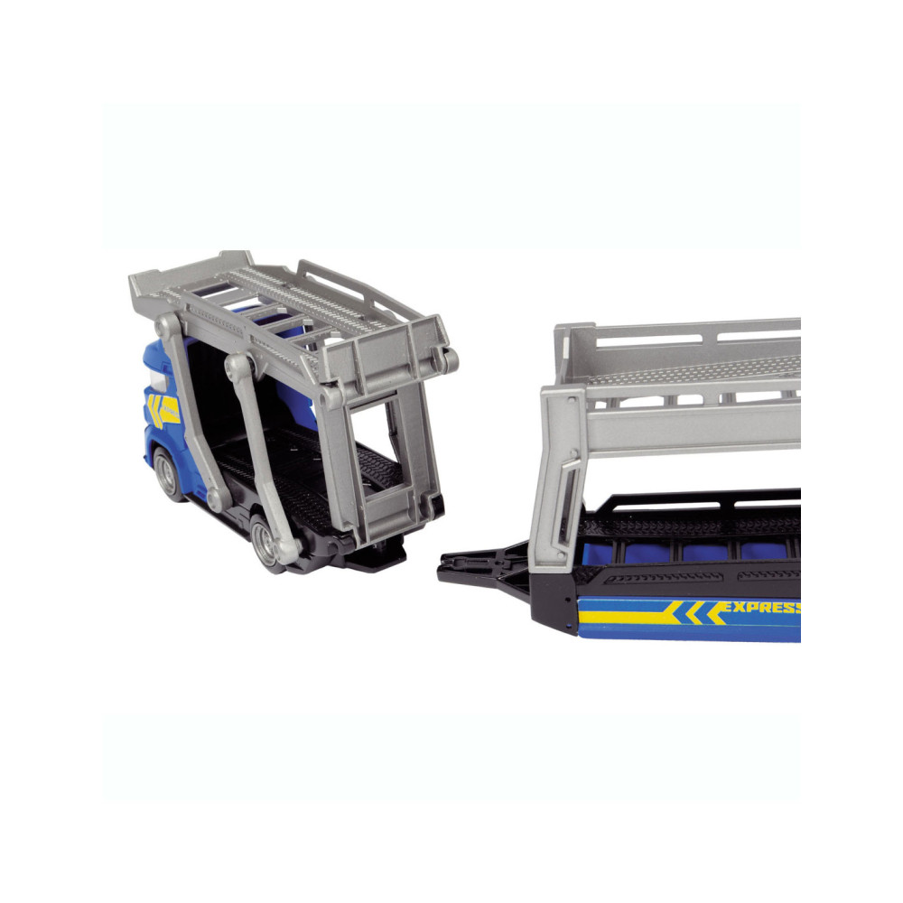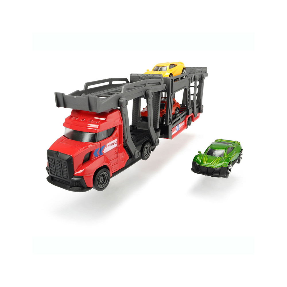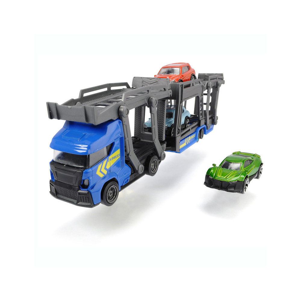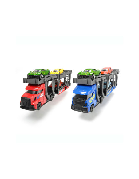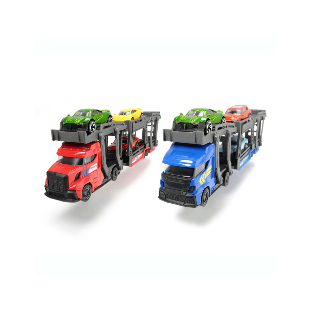Breng de gloednieuwe auto’s naar de garage met deze stoere auto Dickie Auto Transporter. Koppel de trailer los, klap de laadbaan naar beneden en rijd de glanzende auto’s op de transporter. De speelset wordt geleverd inclusief 3 metalen auto's. Geschikt vanaf 3 jaar.