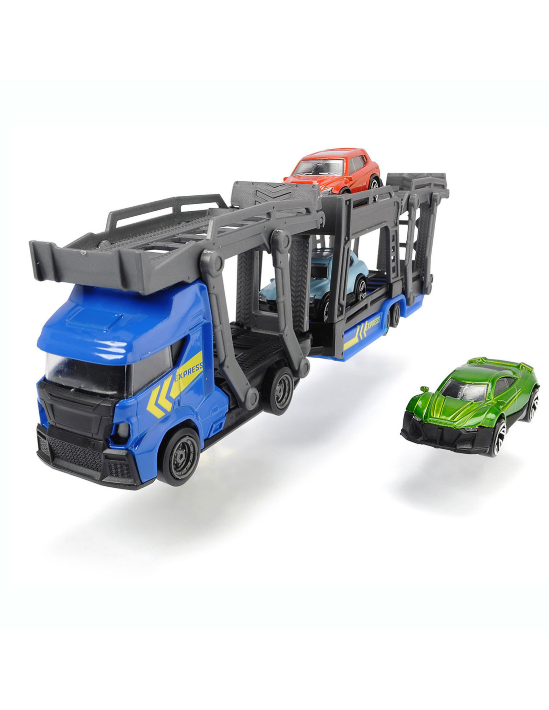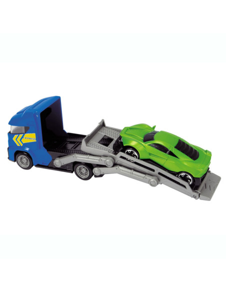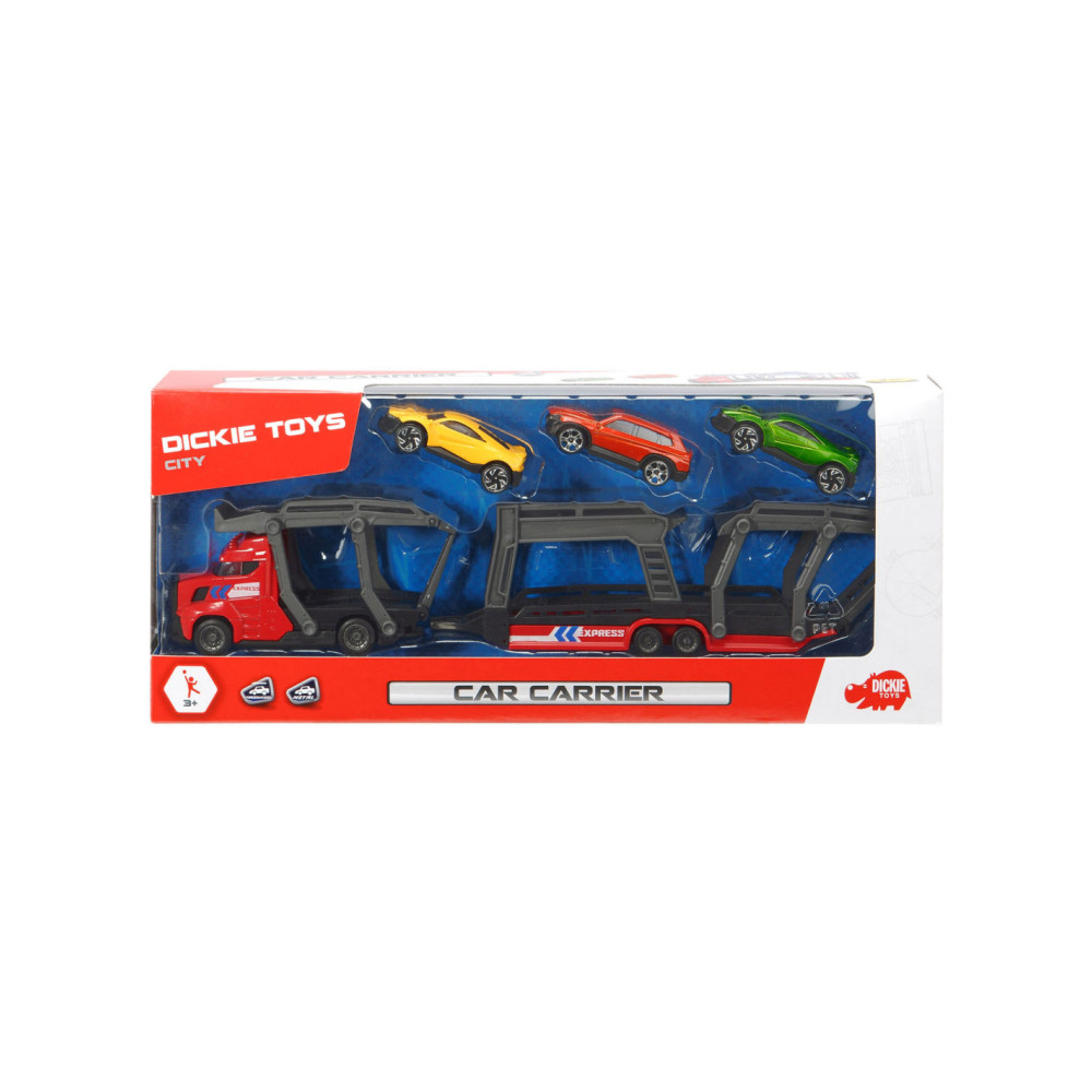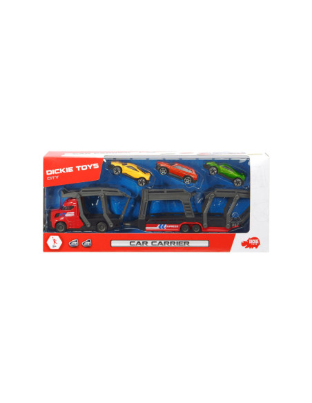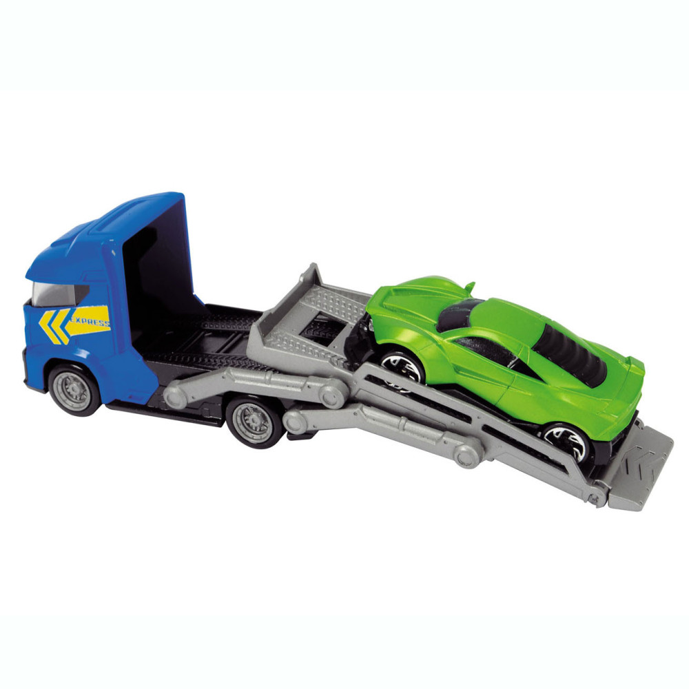 Breng de gloednieuwe auto’s naar de garage met deze stoere auto Dickie Auto Transporter. Koppel de trailer los, klap de laadbaan naar beneden en rijd de glanzende auto’s op de transporter. De speelset wordt geleverd inclusief 3 metalen auto's. Geschikt vanaf 3 jaar.