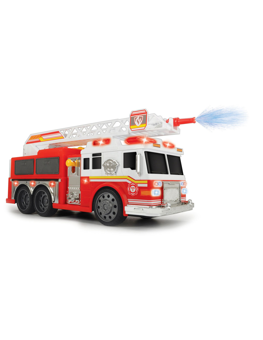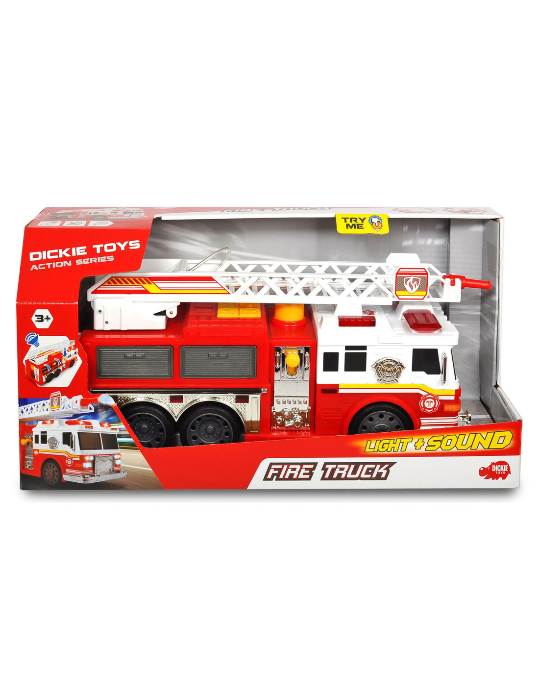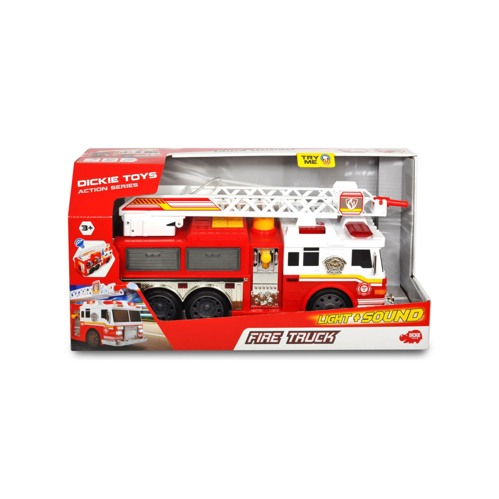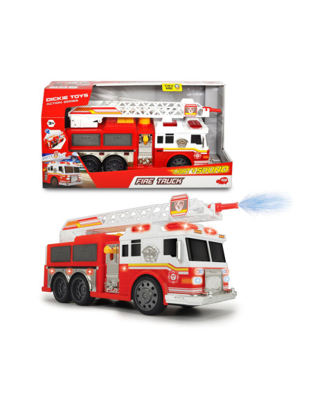 Tatu, tatu... Daar komt de Dickie Brandweerwagen met Licht en Geluid aan! Hij racet in snel tempo richting de brand. Daar aangekomen, komen de brandweermannen in actie. Ze zetten de brandweerladder omhoog en laten water uit de spuit stromen! Klaar met de klus, dan wordt de Dickie Brandweerwagen met Licht en Geluid ergens anders opgeroepen. Tatu, tatu! Daar gaat hij weer! Werkt op 3 AA batterijen (niet inbegrepen).