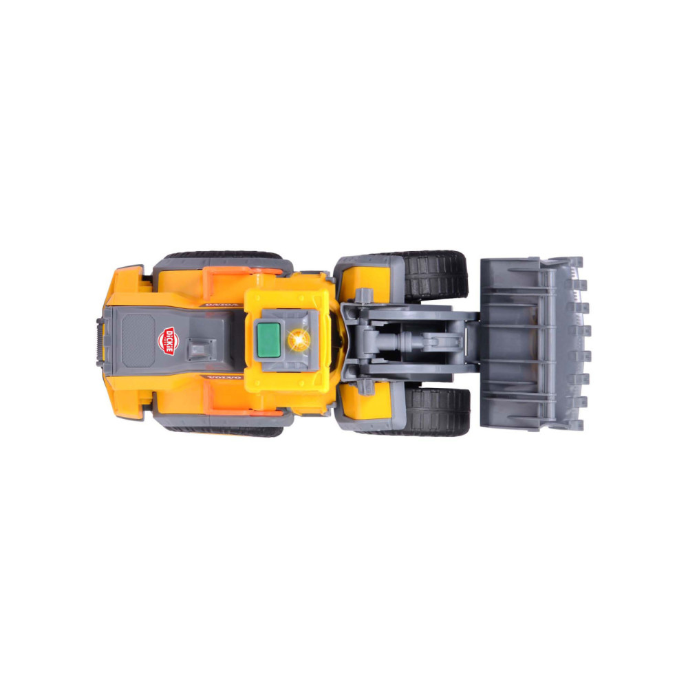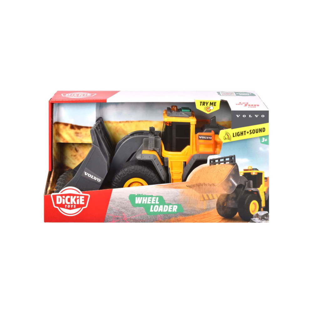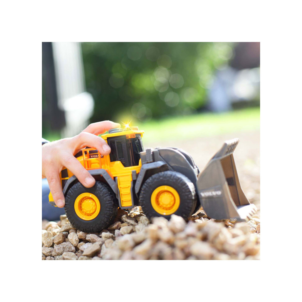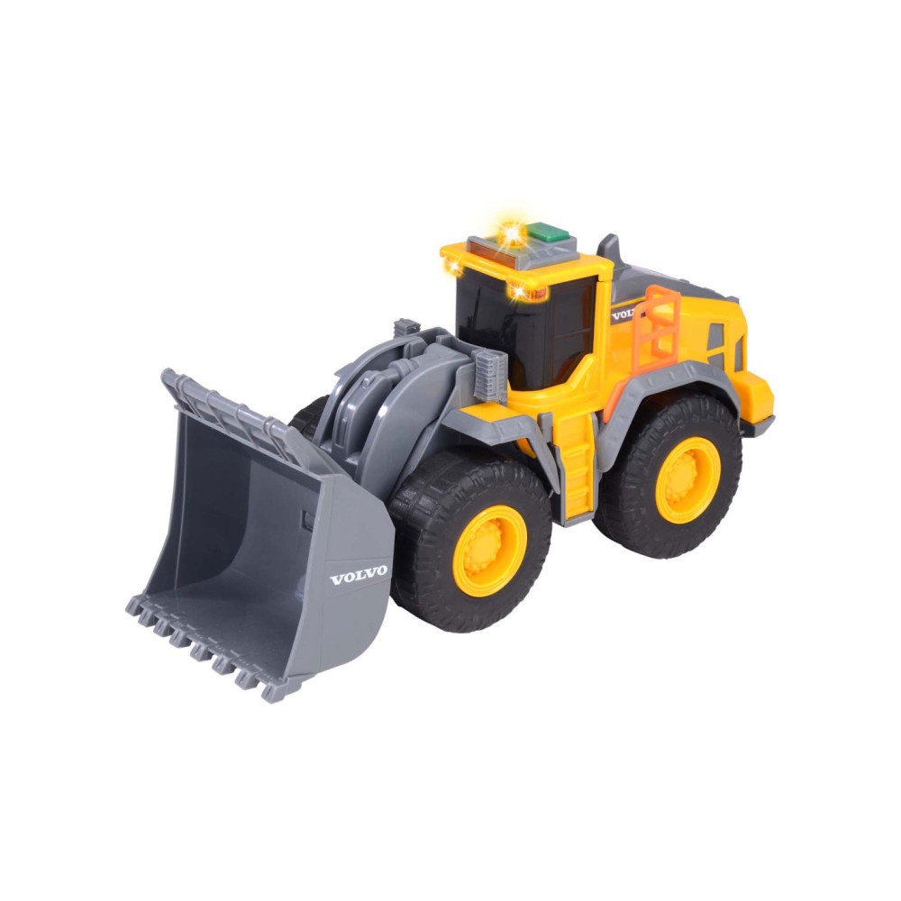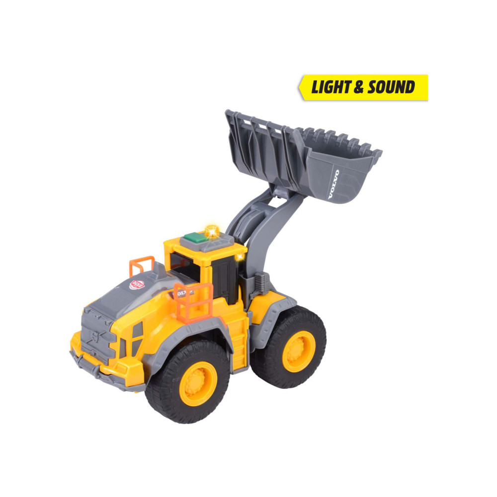 Volvo wiellader van Dickie Toys met licht, geluid en beweegbare laadschop. Stevig ontwerp, geschikt voor kinderen vanaf 3 jaar.