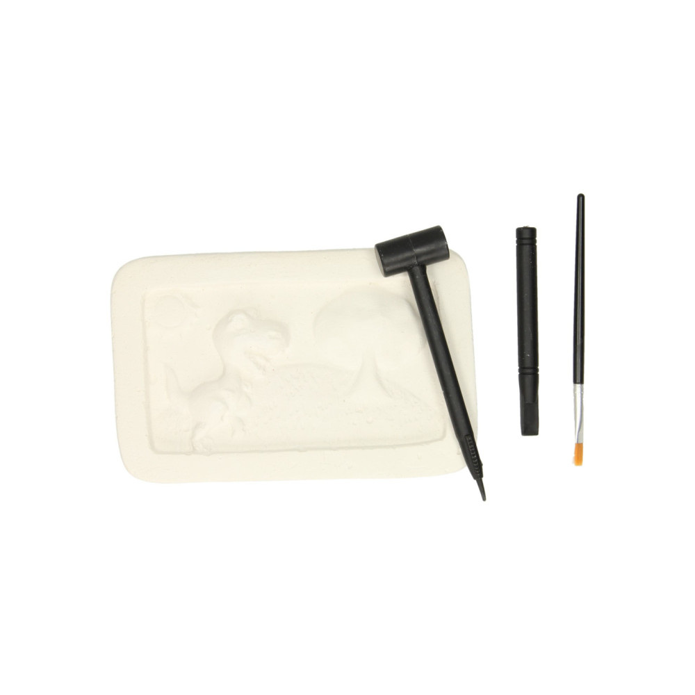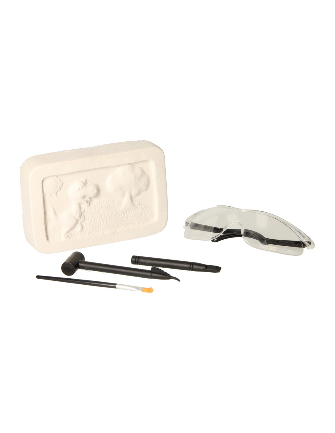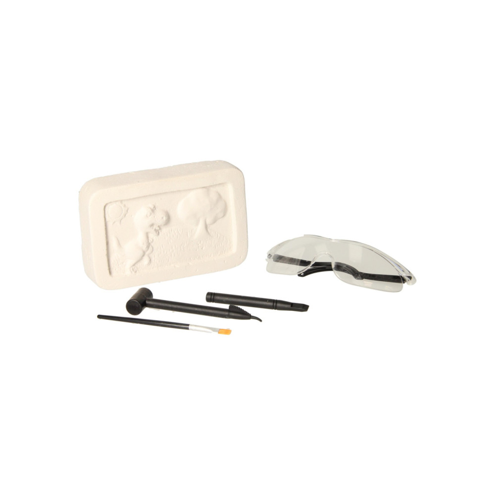 Set waarmee dinosaurusfossielen opgegraven kunnen worden. In de verpakking zit een in het gips begraven dinosaurusfossiel. Met een hamer, beitel, kwast en waterpompje verwijder je voorzichtig het fossiel uit het gips. In de verpakking zit één gipsblok, hamer, beitel, kwast, waterpompje en veiligheidsbril.