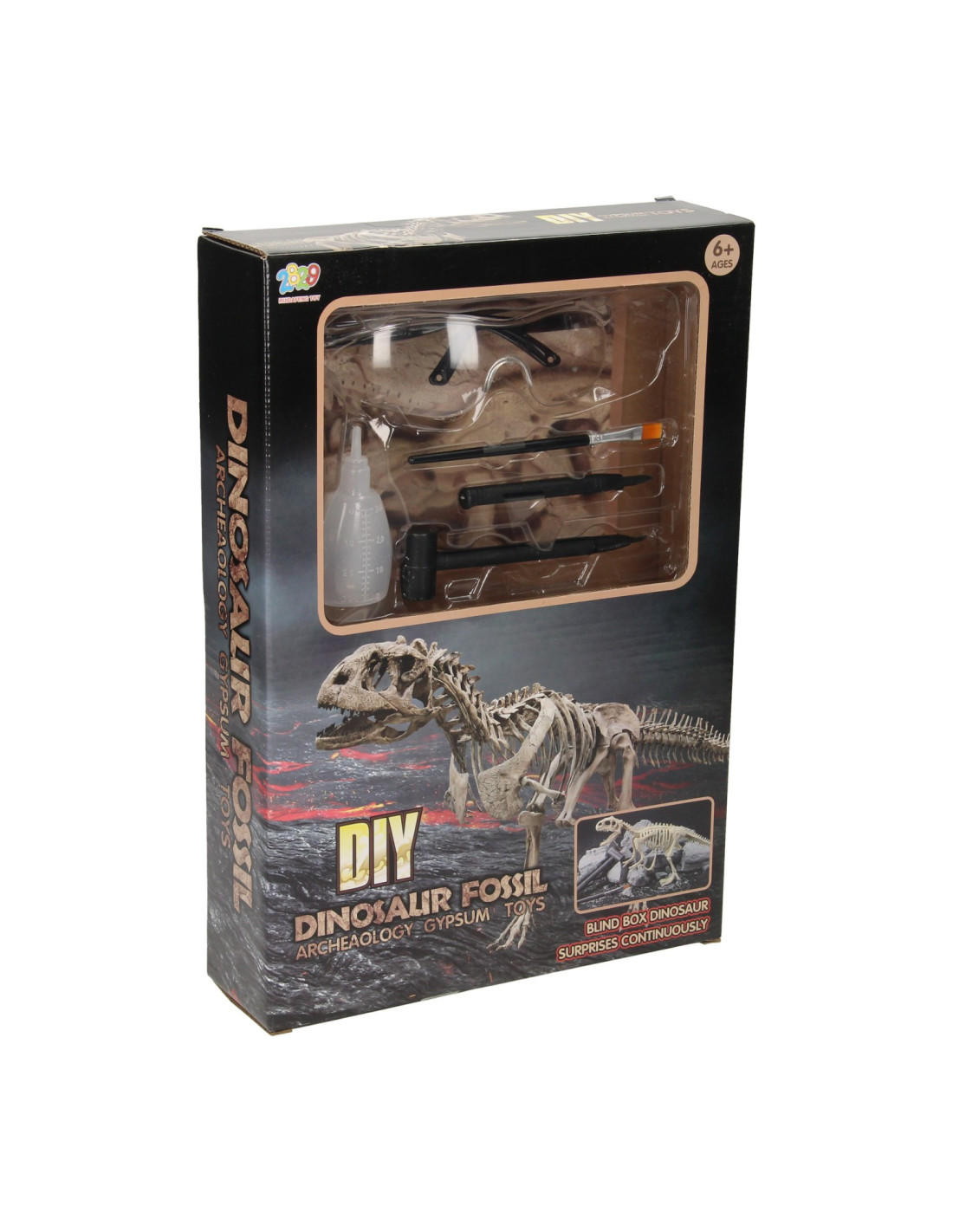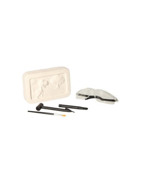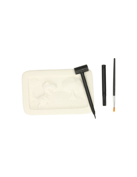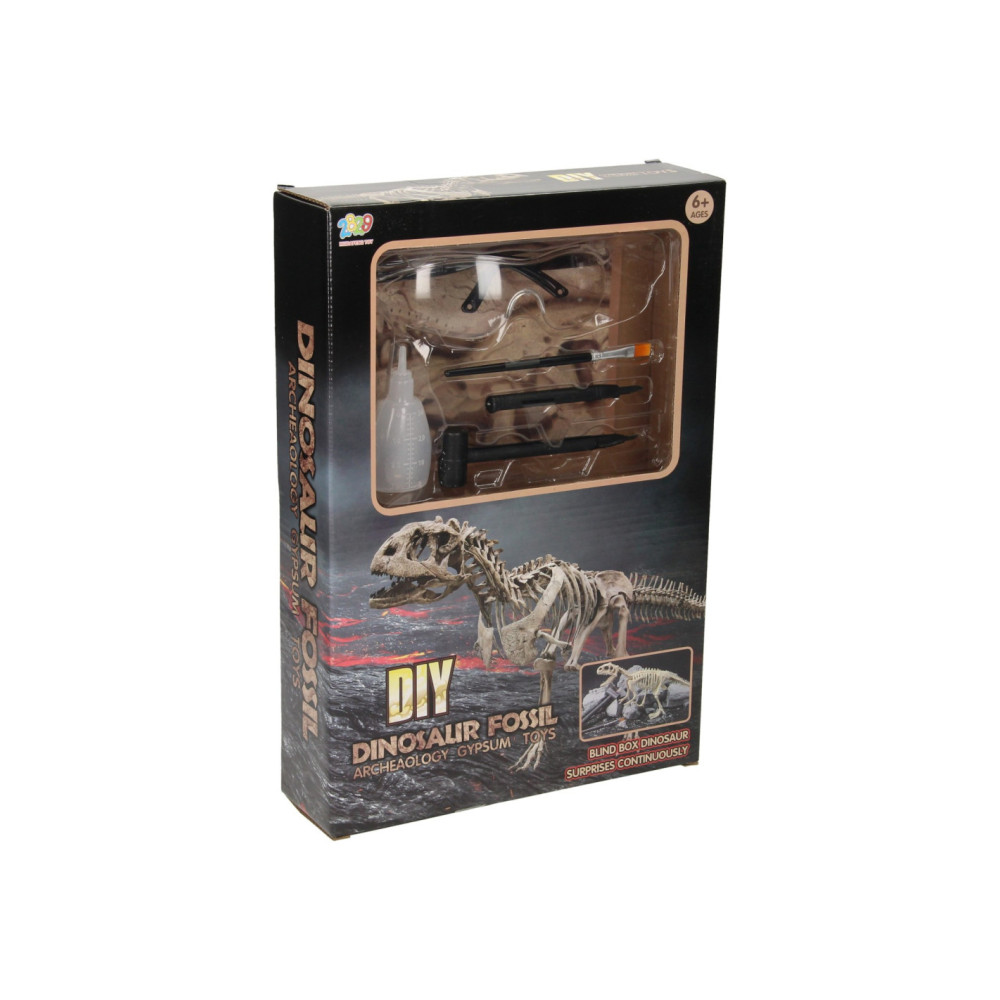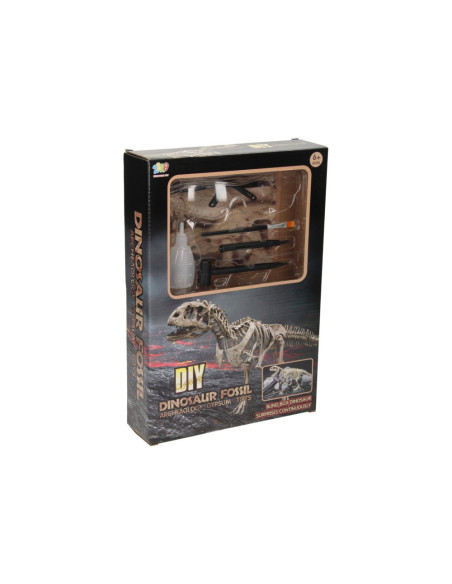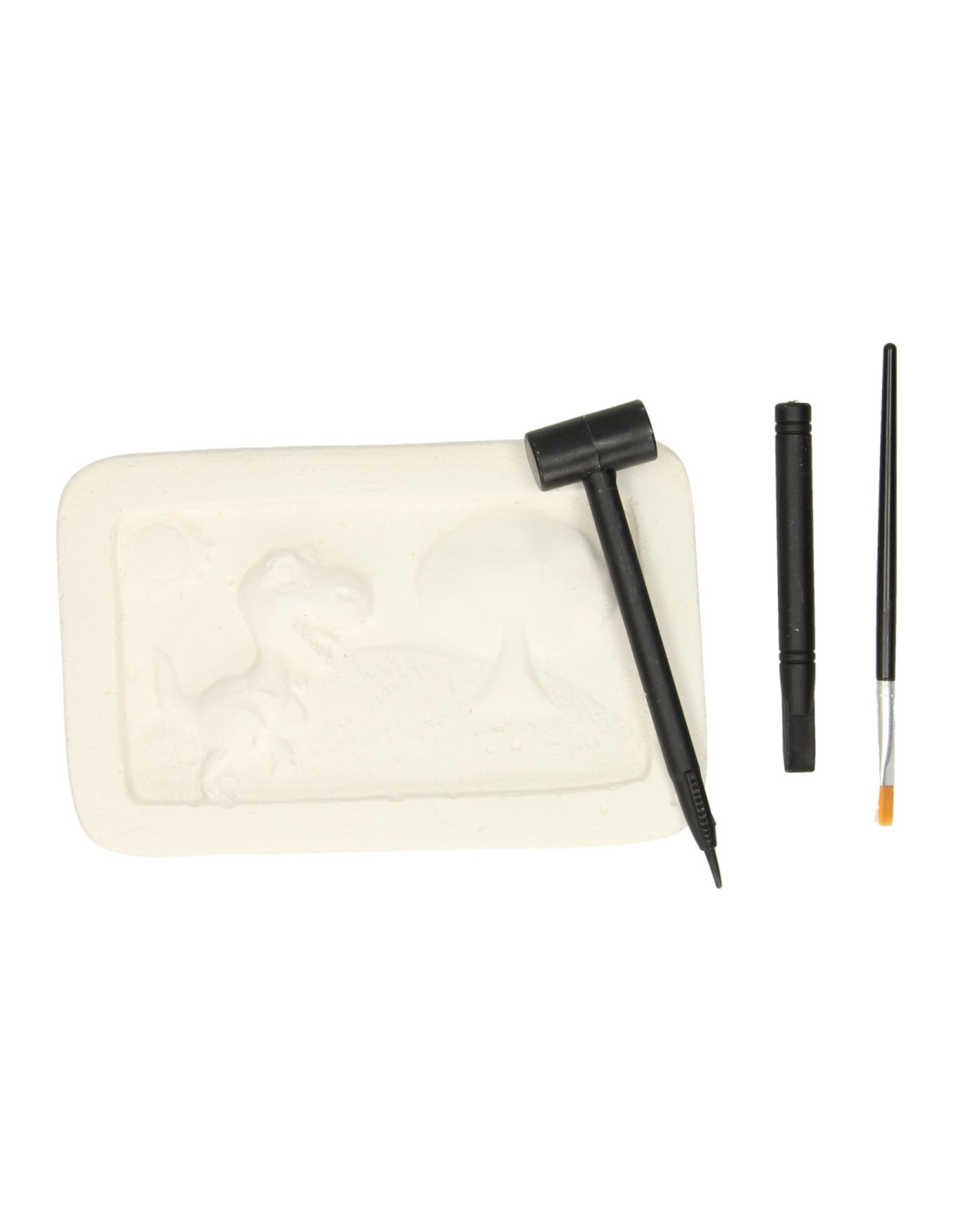 Set waarmee dinosaurusfossielen opgegraven kunnen worden. In de verpakking zit een in het gips begraven dinosaurusfossiel. Met een hamer, beitel, kwast en waterpompje verwijder je voorzichtig het fossiel uit het gips. In de verpakking zit één gipsblok, hamer, beitel, kwast, waterpompje en veiligheidsbril.