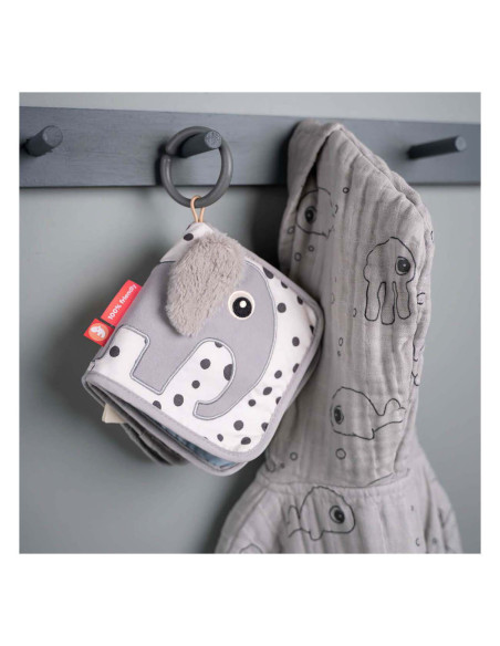 • Het Elphee activiteitenboek in grijs is gevuld met kleurrijke elementen en contrasterende patronen die de zintuigen van uw kind stimuleren