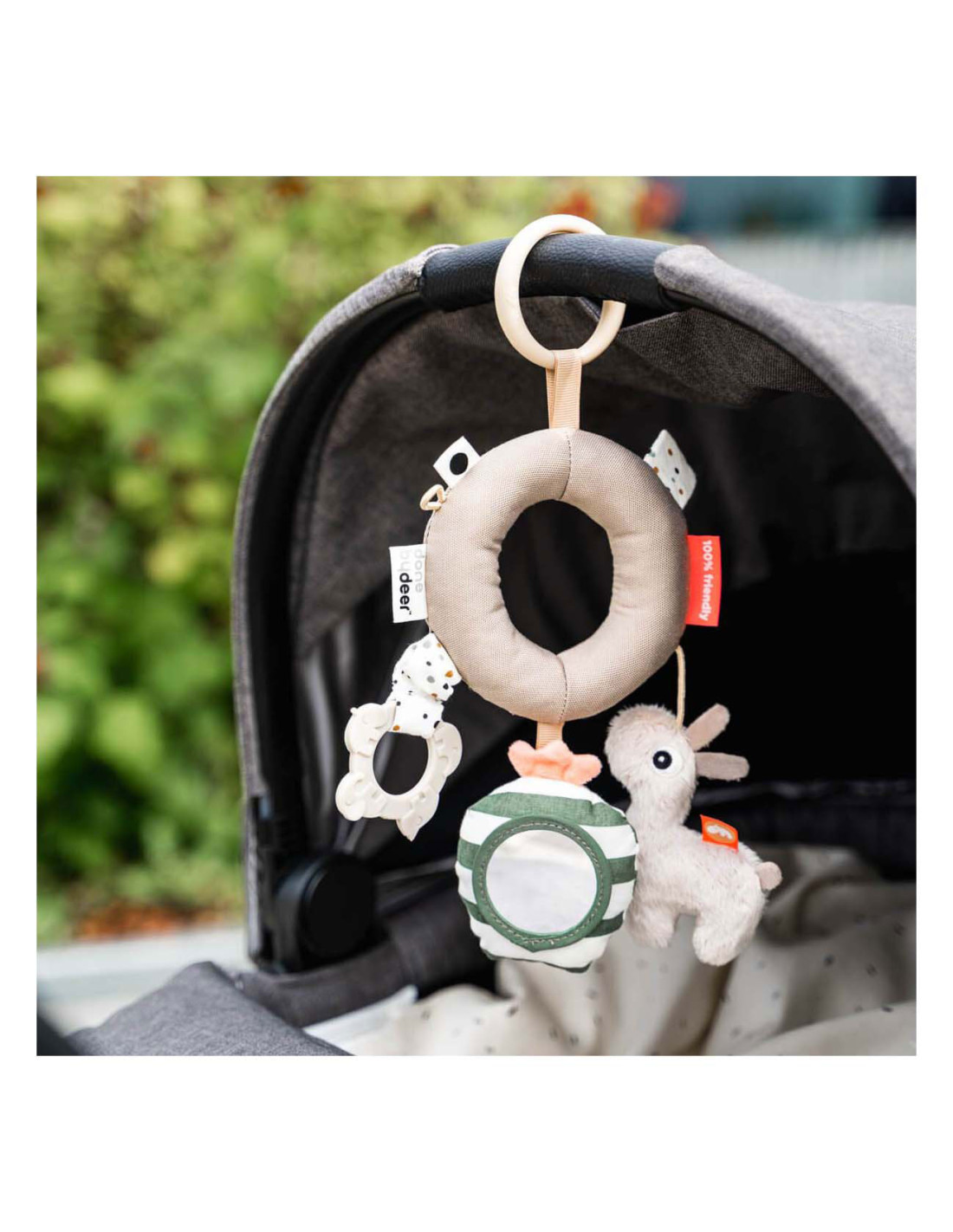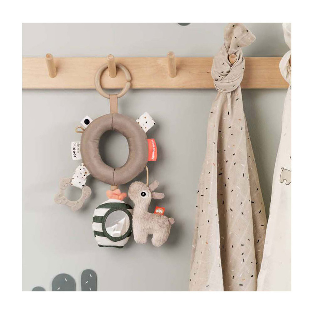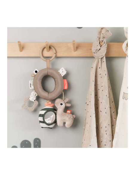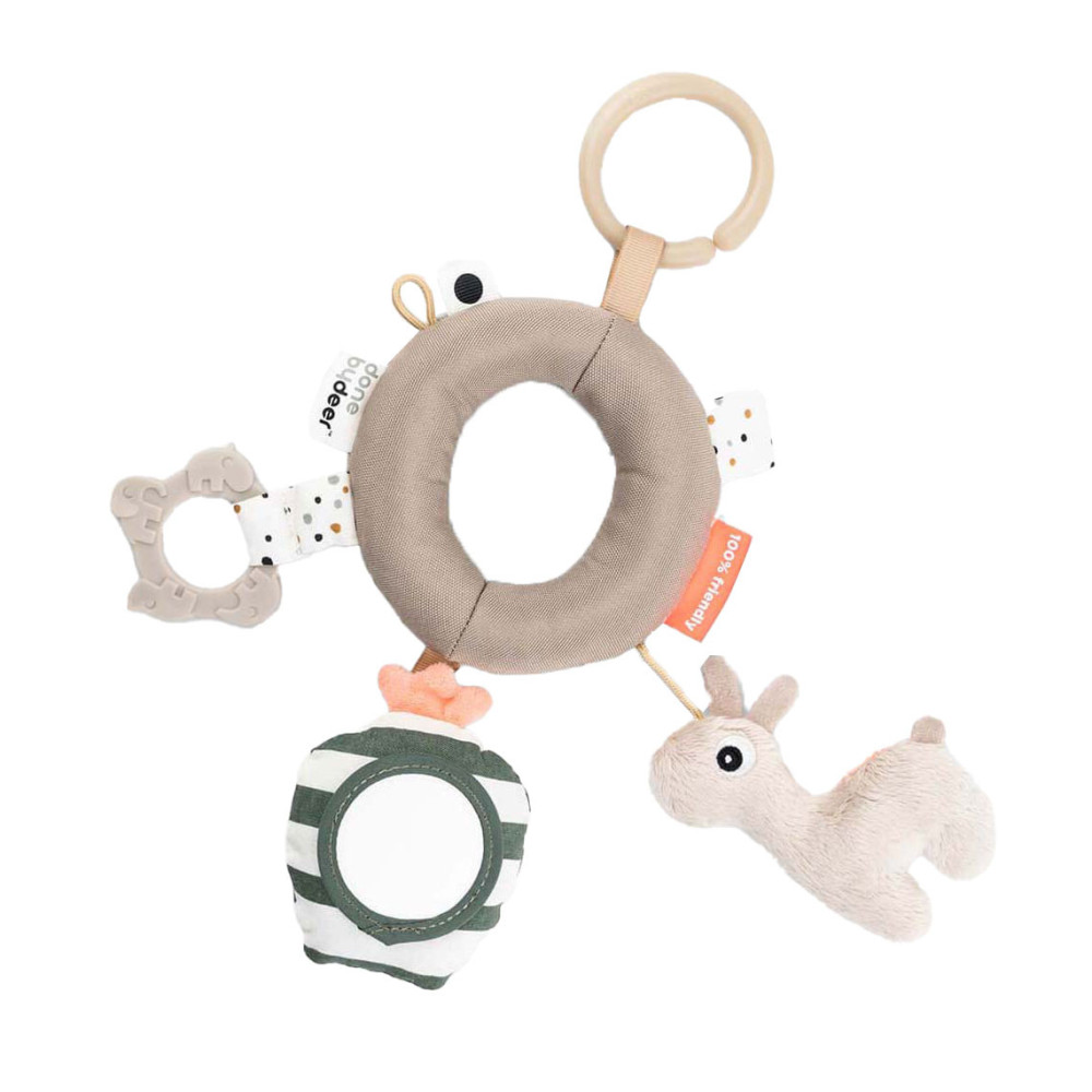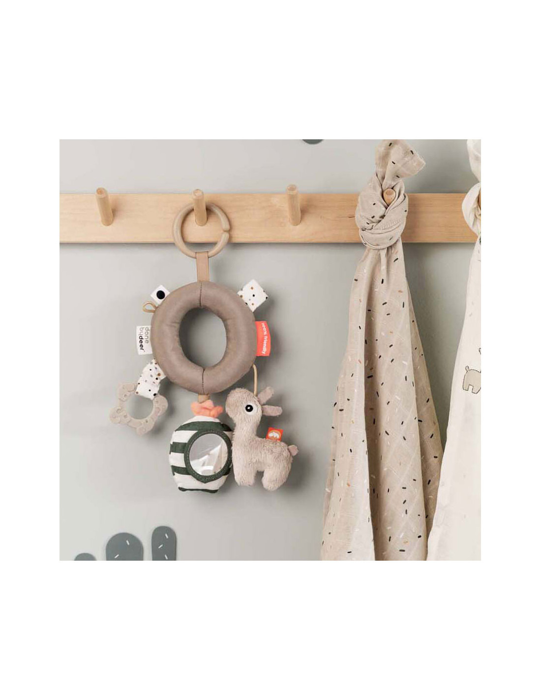 De activiteitenring stimuleert de nieuwsgierigheid van baby's en stimuleert het onderzoeken van de sensorische kenmerken: een zachte bijtring voor jeukend tandvlees, een spiegel met rammelaar, een zacht getextureerde Lalee, knisperende geluiden en leuke labels.