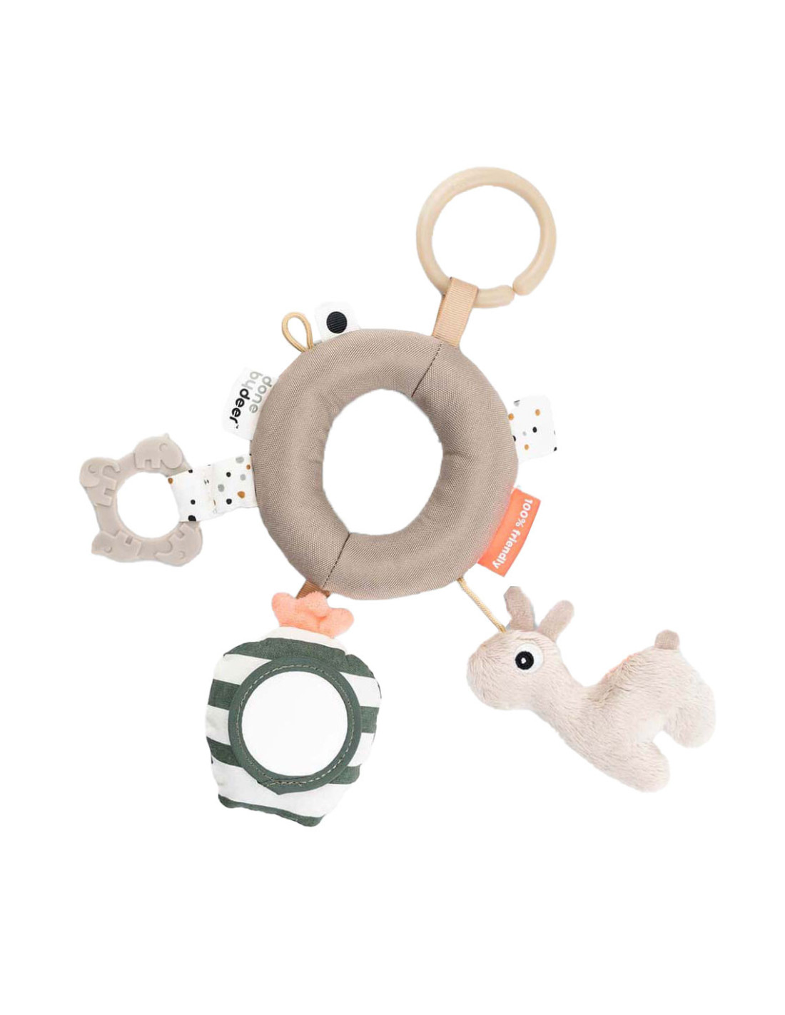 • Een zachte bijtring voor jeukend tandvlees, een spiegel met rammelaar, een zacht getextureerde hertenvriend, knisperende geluiden en leuke labels