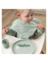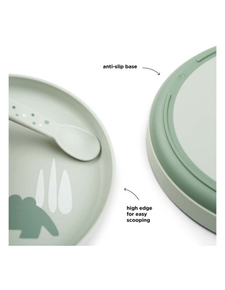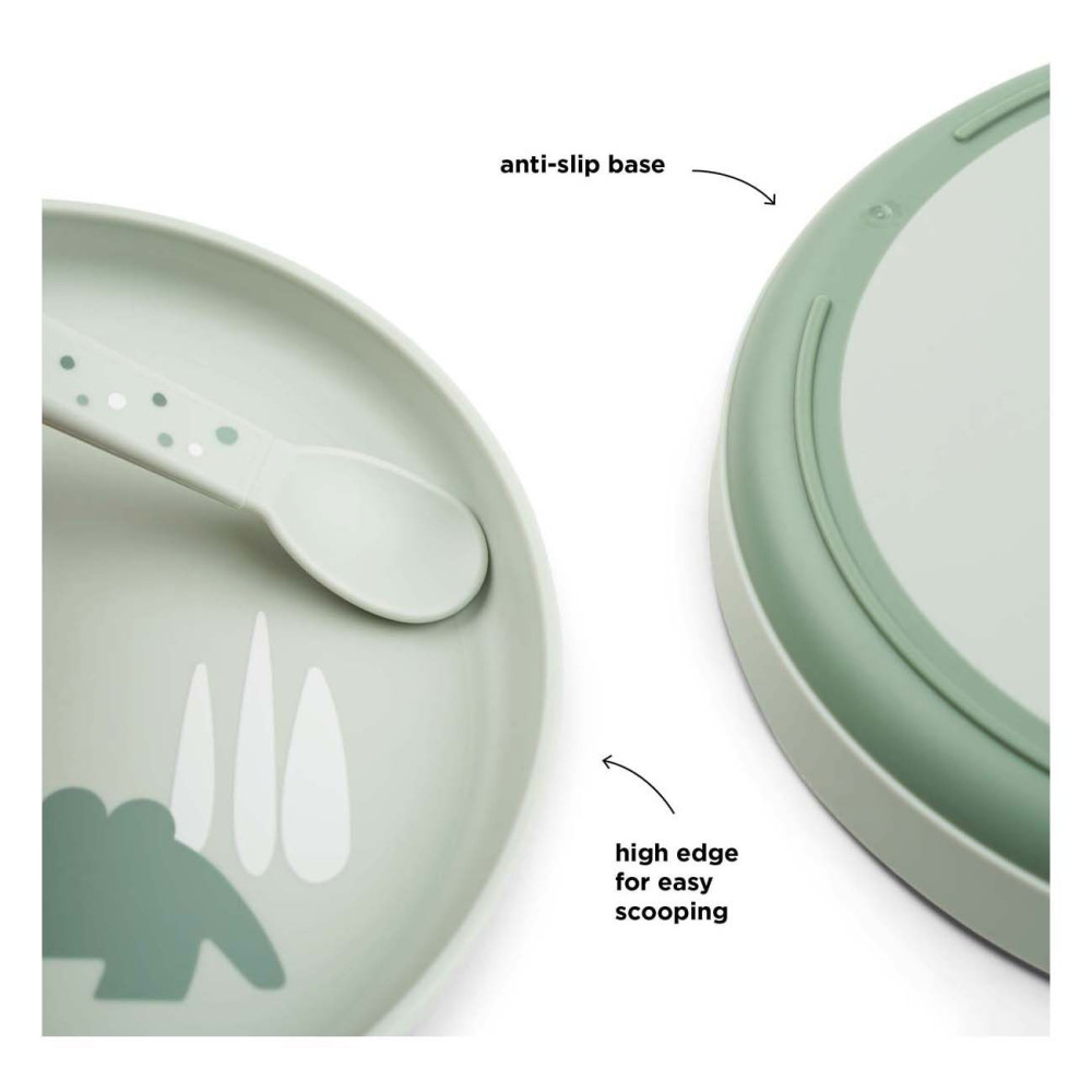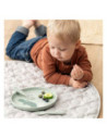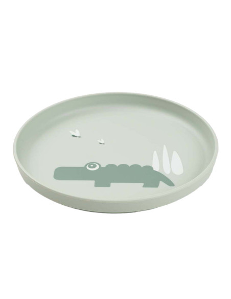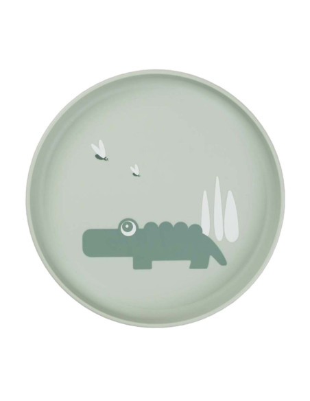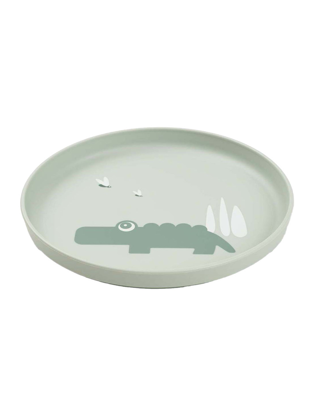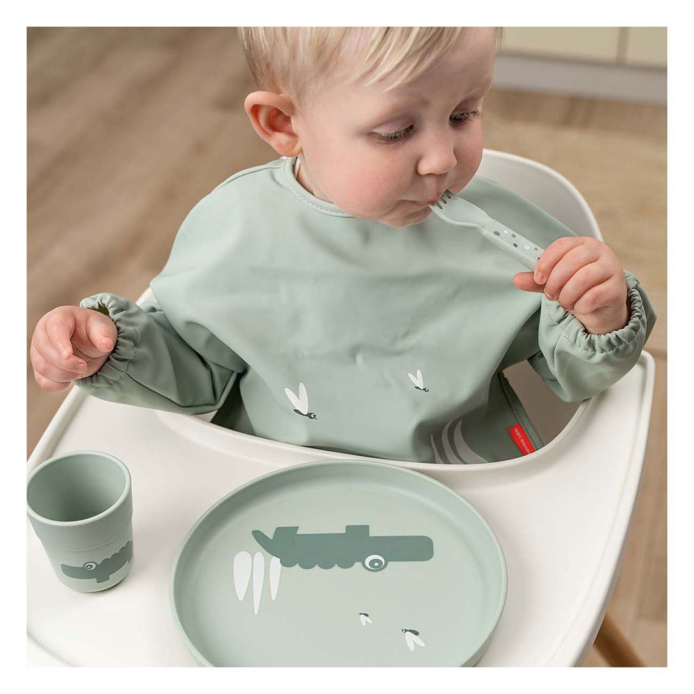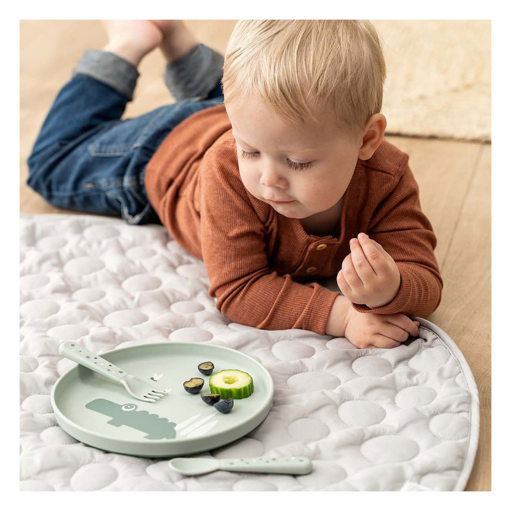 Het groene bord is bedrukt met een cool motief van de hartelijke krokodil Croco die naar een paar vuurvliegjes staart. Croco's nieuwsgierigheid zal uw kind inspireren om het eten op het bord te verkennen. Het donkerdere groen van de basis voegt een leuk tweekleurig detail toe.