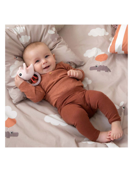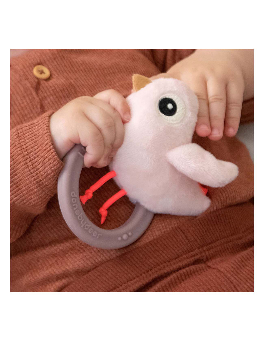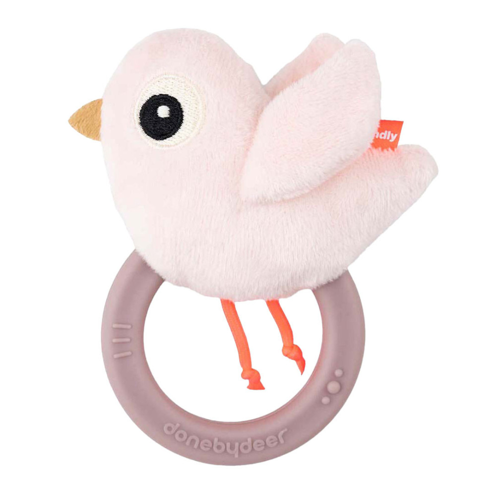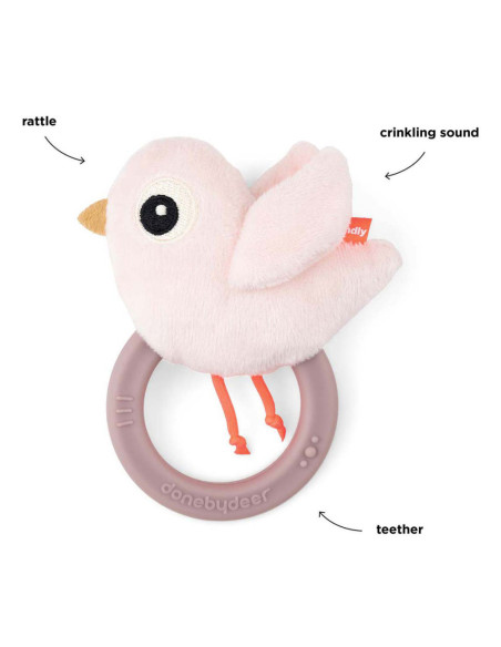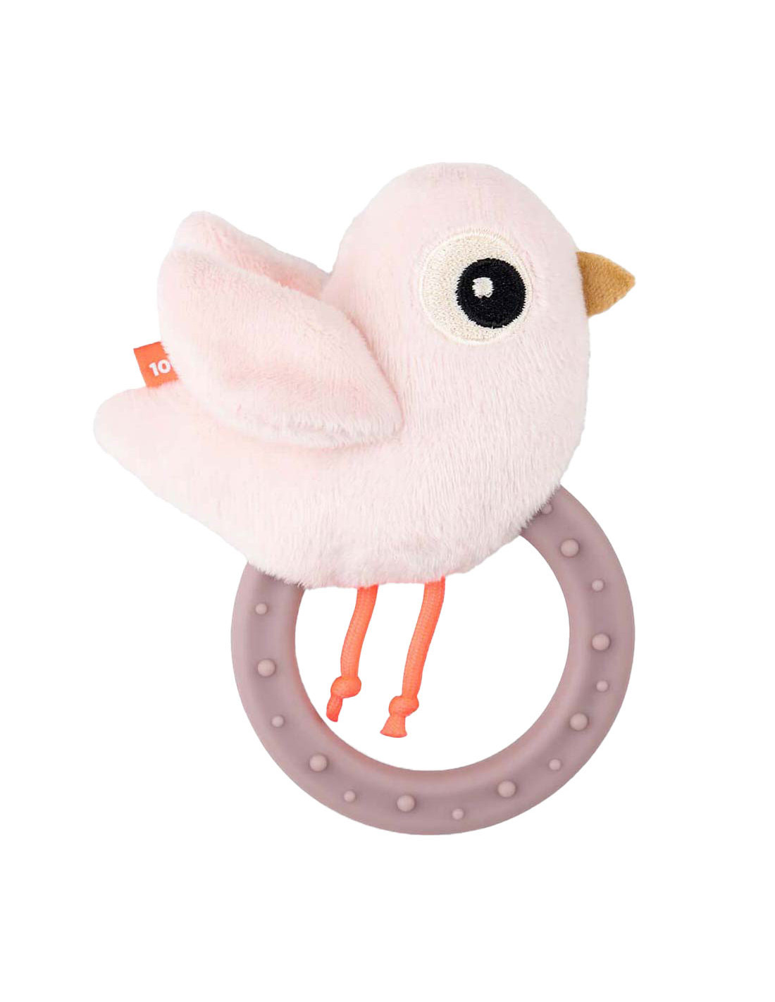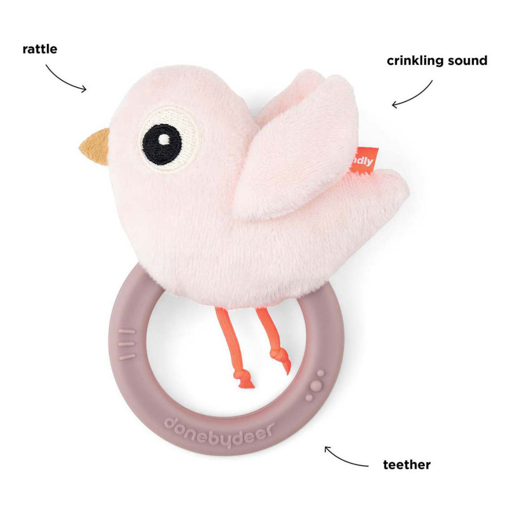 Een schattige, roze Birdee sensorische rammelaar met bijtring is een goede metgezel voor je kleintje met pijnlijk tandvlees. De sensorische rammelaar heeft een schattig rammelgeluid, verschillende texturen om te ontdekken en de vleugels maken een leuk knisperend geluid bij aanraking!