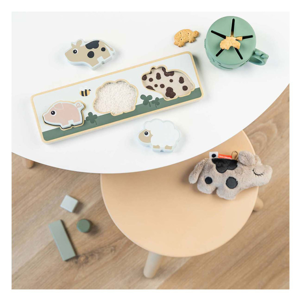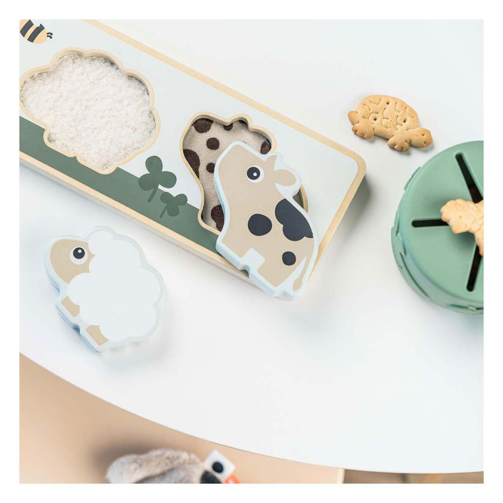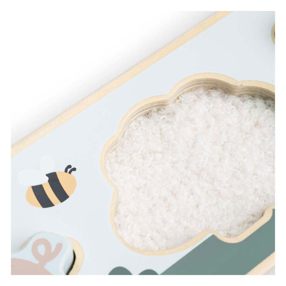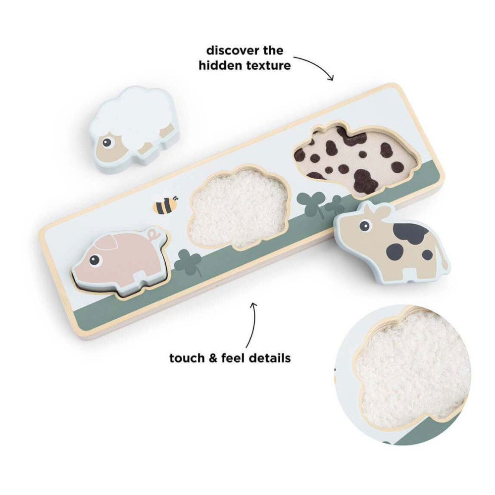 Deze eenvoudige sensorische puzzel zit vol spannende texturen en patronen die je kleintje kan ontdekken. Het helpt bij het trainen van de logica en de fijne motoriek als ze de stukjes op elkaar leggen, terwijl het fantasierijk spelen aanmoedigt met verhaaltjes en dierengeluiden.