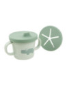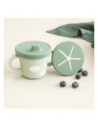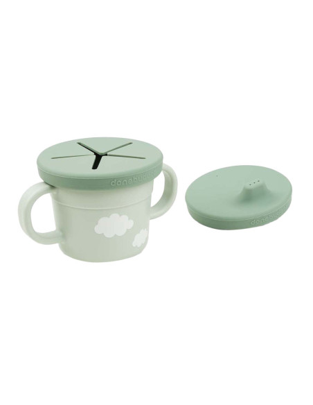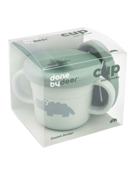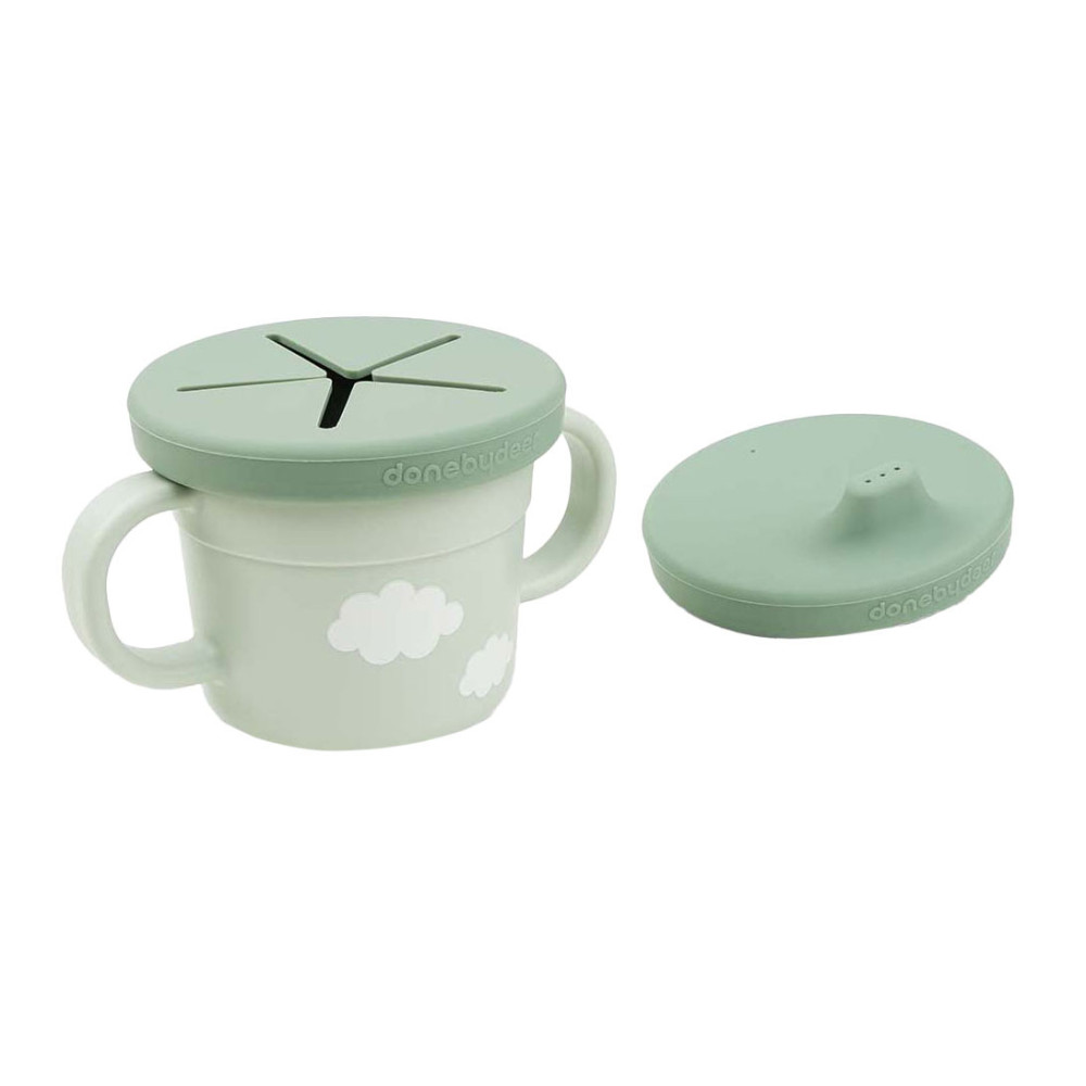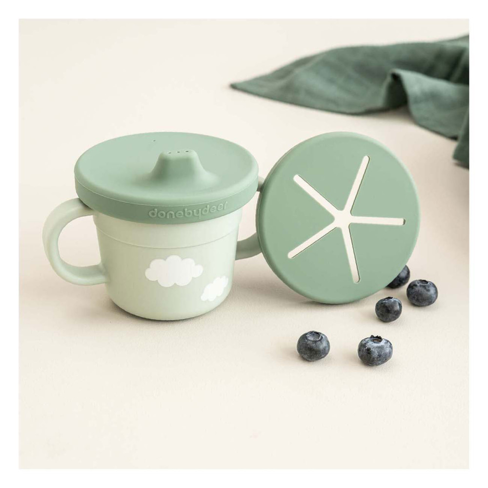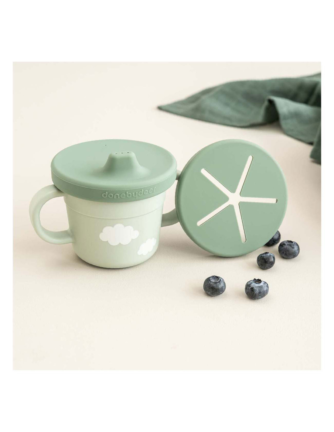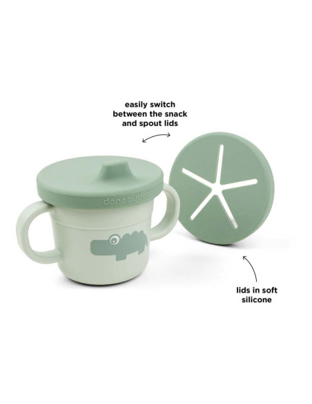 De coole groene tuit en snackbeker zijn bedrukt met de warmhartige krokodil, Croco aan de ene kant en wolken aan de andere kant. Het donkerdere groen van de tuitdeksels voegt een leuk tweekleurig detail toe.