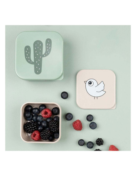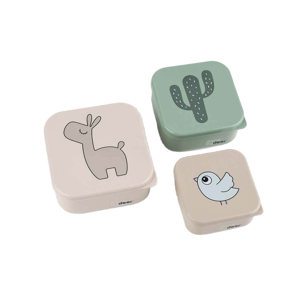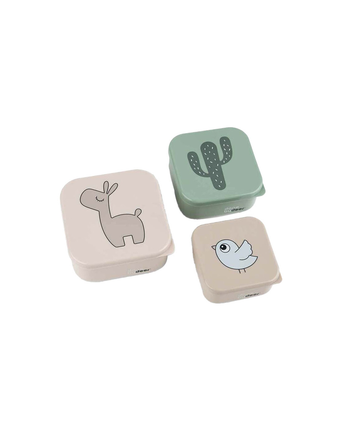 Een schattige set van drie dozen, een zandkleurige box versierd met Lalee, een groene versierd met een grote cactus en een zandkleurige box met de kleine Birdee.