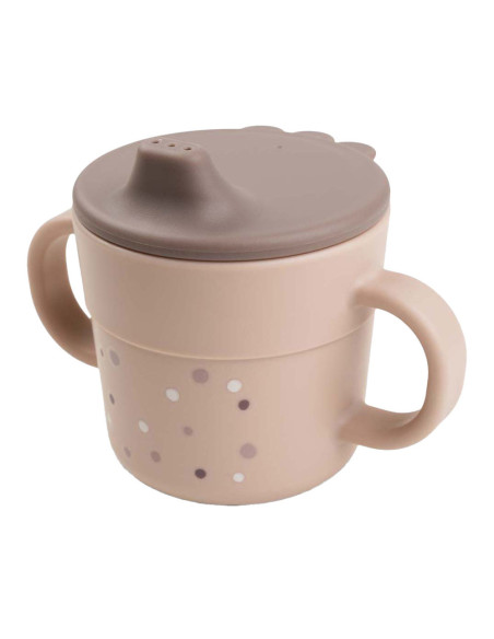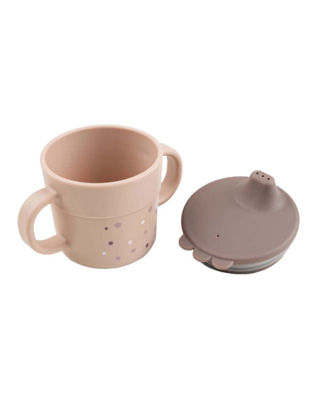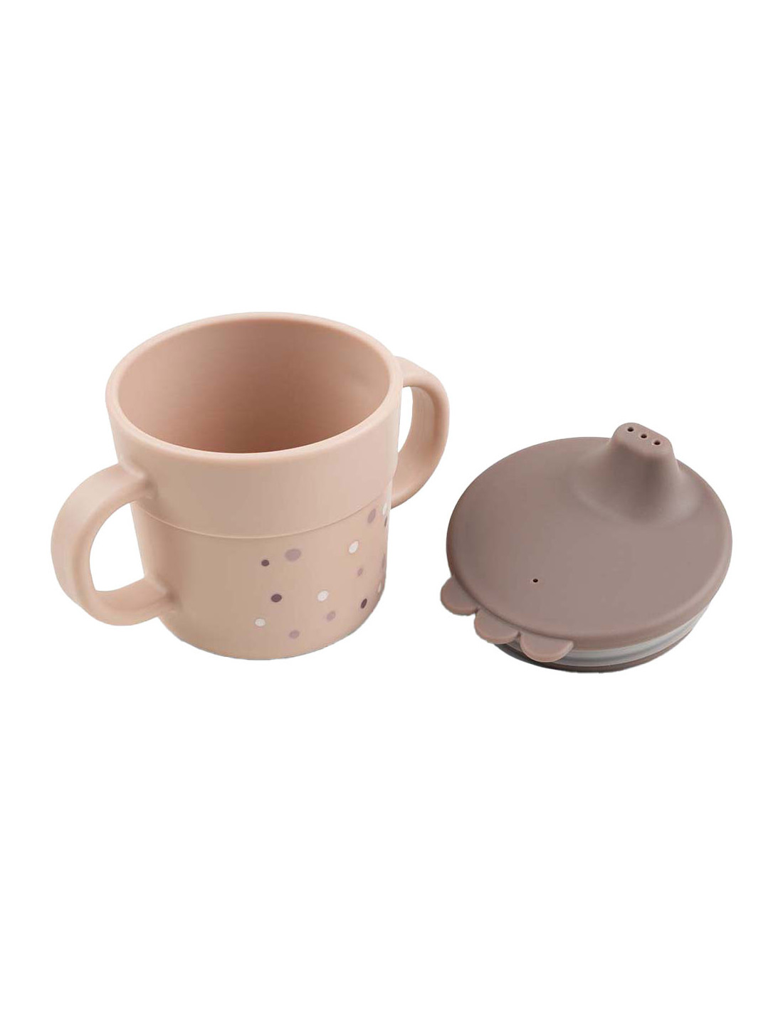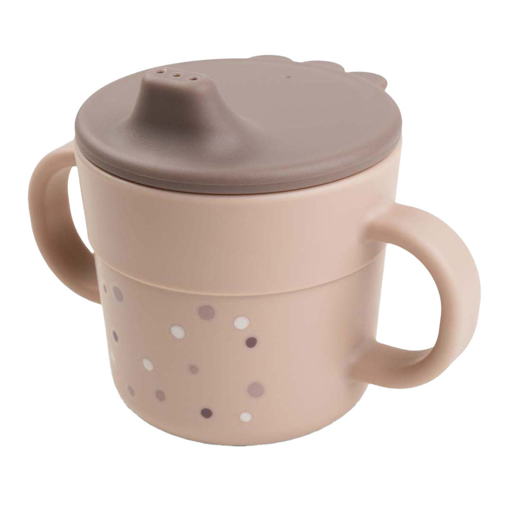 De schattige beker in pastelkleur en speelse Happy dots vrolijkt elke maaltijd op. De donkere poederkleur op het deksel voegt een leuk tweekleurig detail toe.