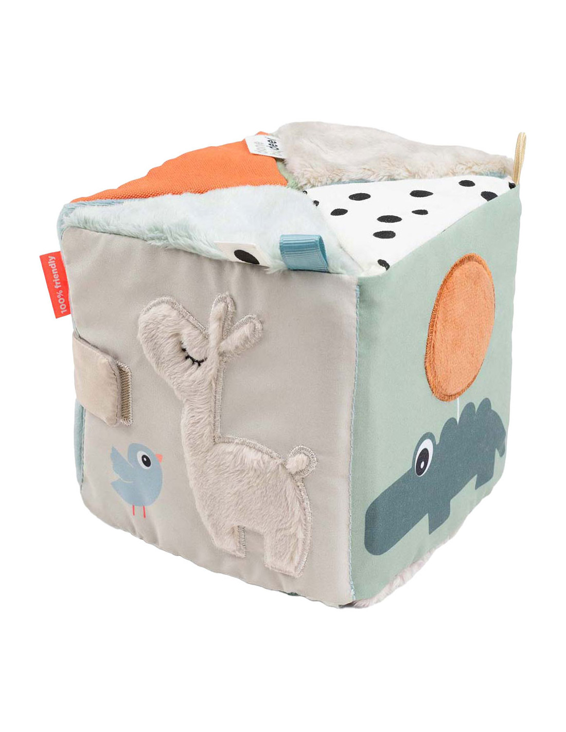 Onze Deer friends uitvouwbare sensorische kubus is een boeiend speeltje voor nieuwsgierige kleintjes, die alle zintuigen stimuleert. De verschillende texturen, de speelse Deer friends, kleurrijke prints, vormen en tags inspireren tot verkenning. Levendige kleuren en contrasten versterken de visuele stimulatie en het kreukelpapier zorgt voor intrigerende geluiden.