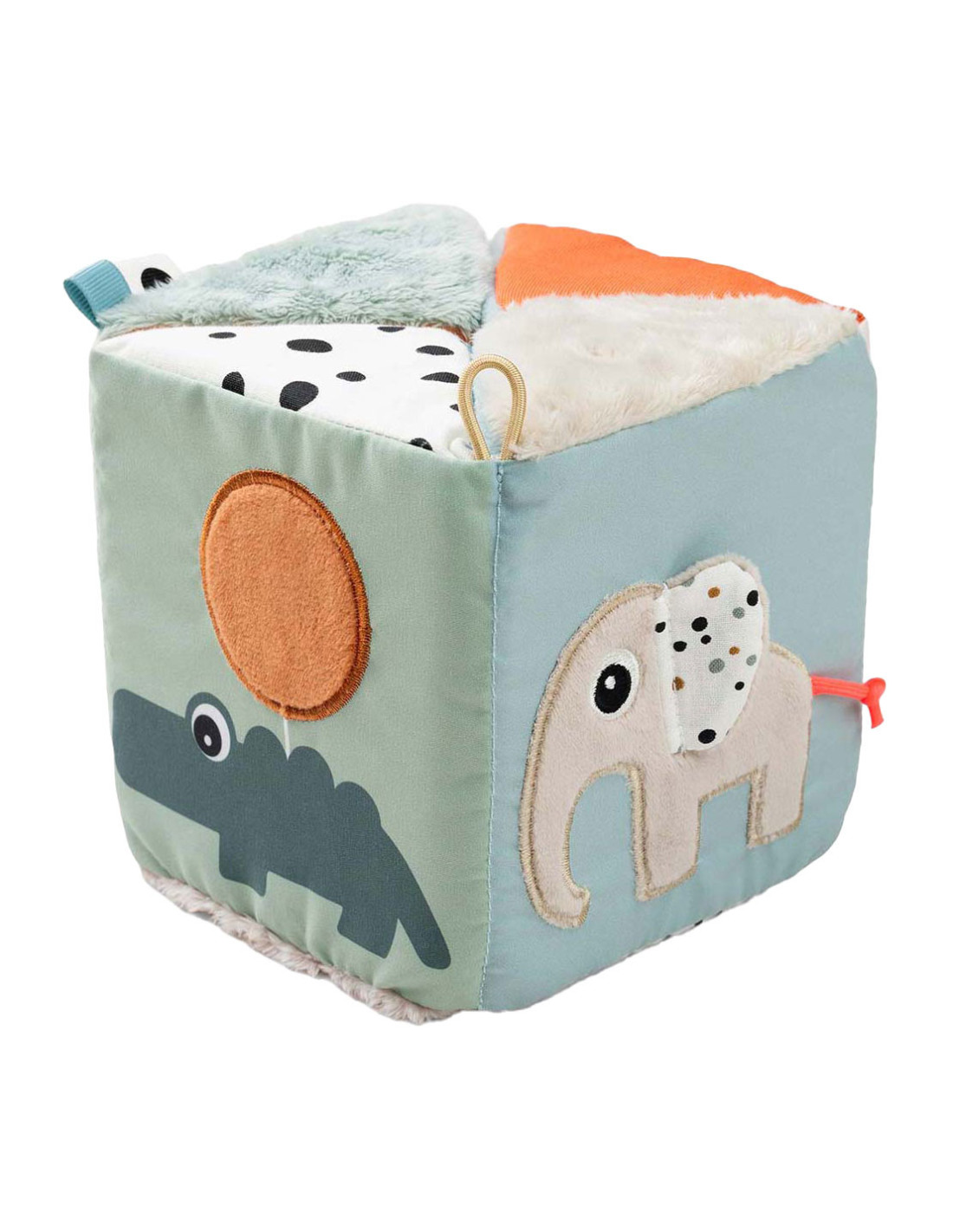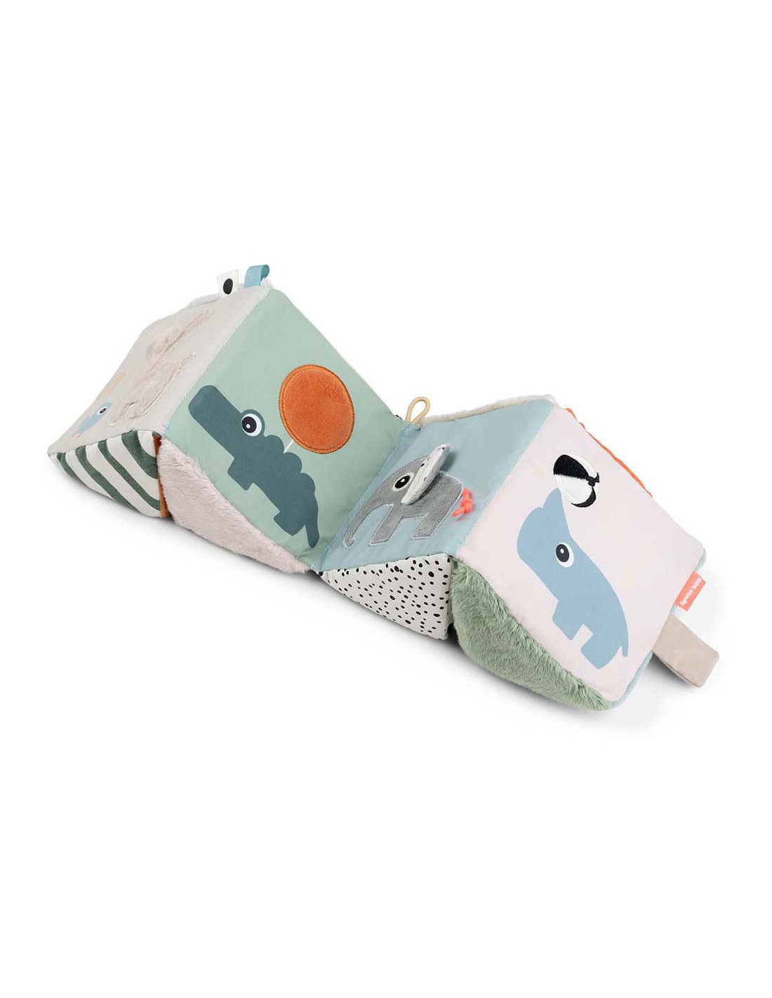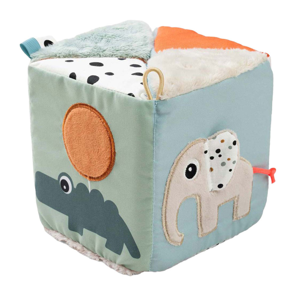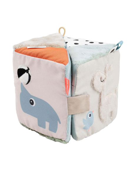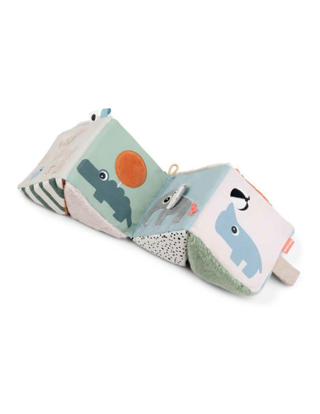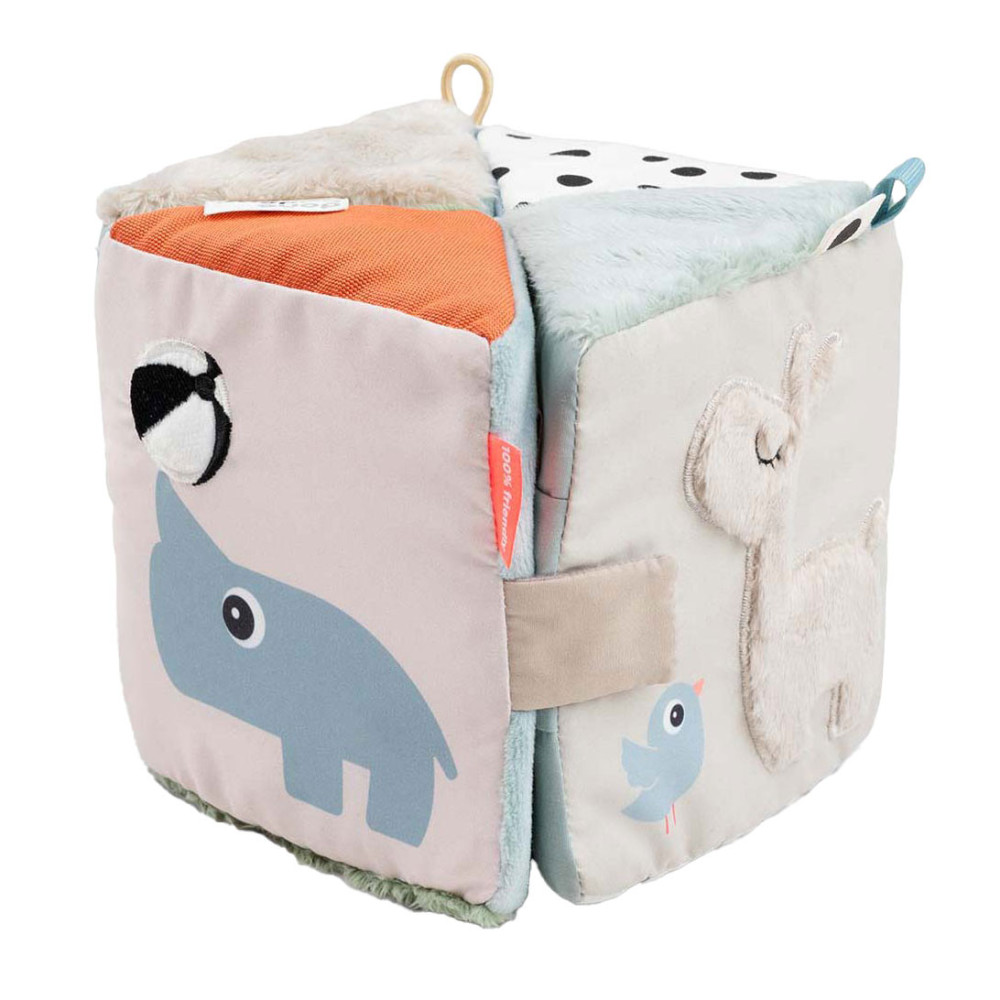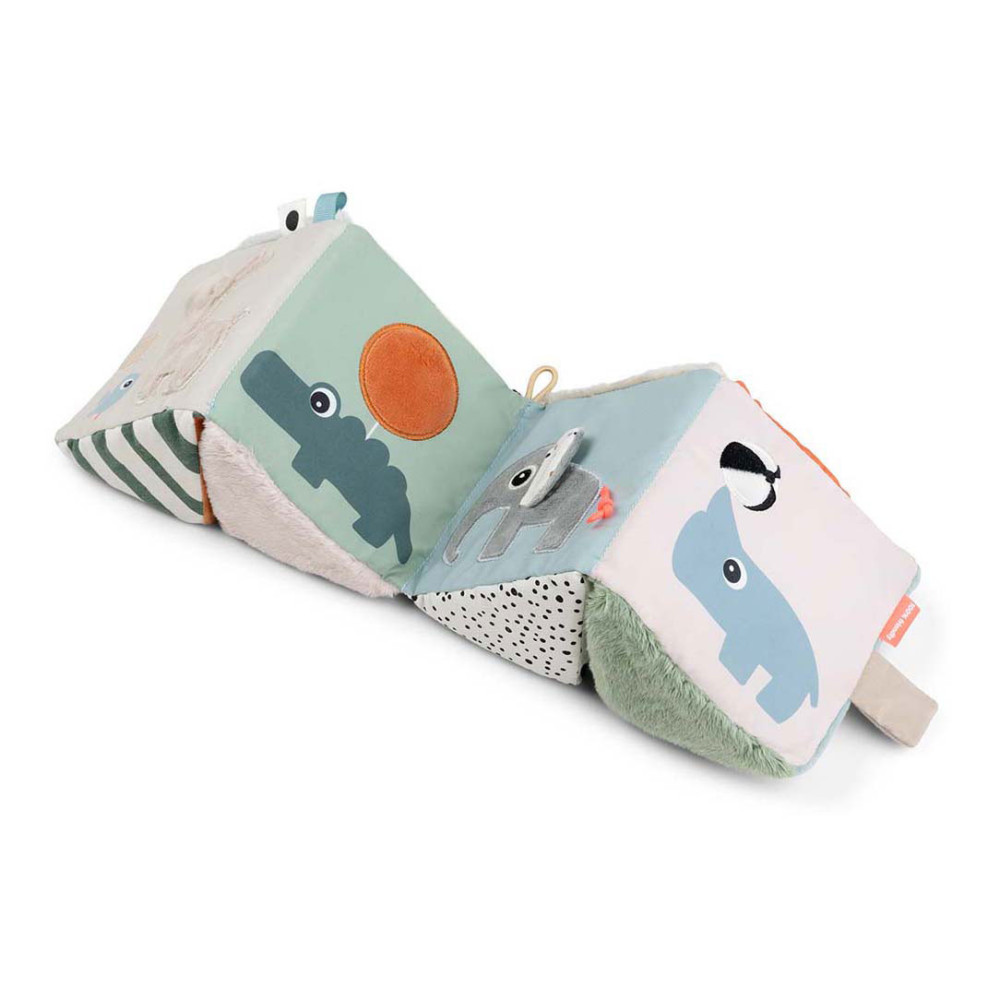 Het uitvouwbare sensorische boek kan worden gebruikt voor buikligging, kruipoefeningen of zittend spelen. Gebruik de klittenbandsluiting om de kubus te sluiten en er een motiverende dobbelsteen van te maken. Met een elastische lus voor eenvoudige bevestiging aan een kinderwagen of activiteitengym met behulp van een speelgoedkoppeling, combineert deze kubus entertainment en ontwikkelingsvoordelen voor de verkenning en groei van uw baby.