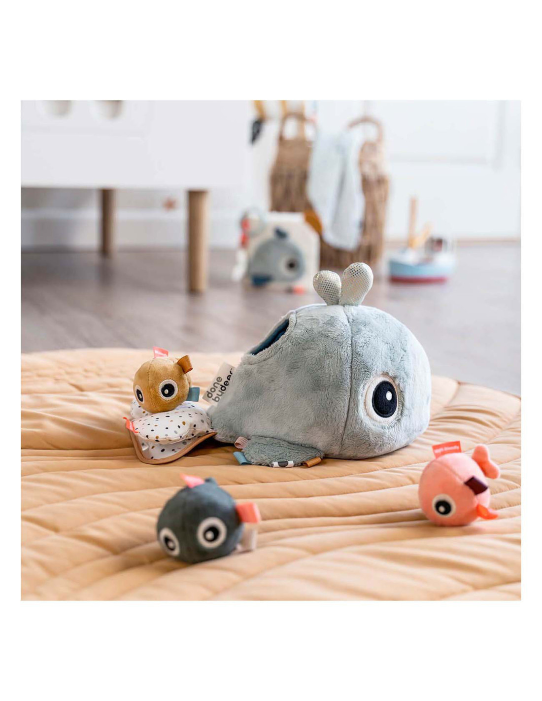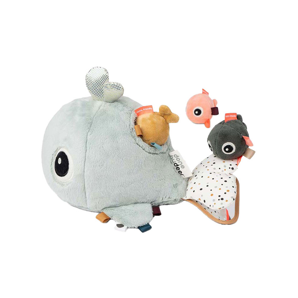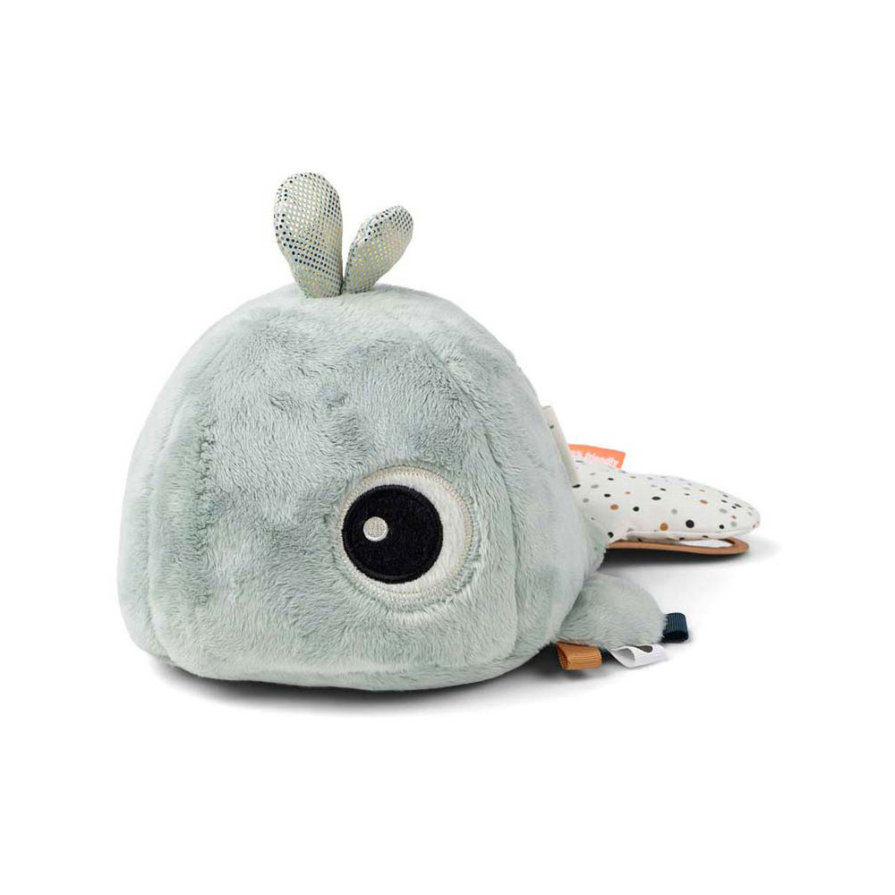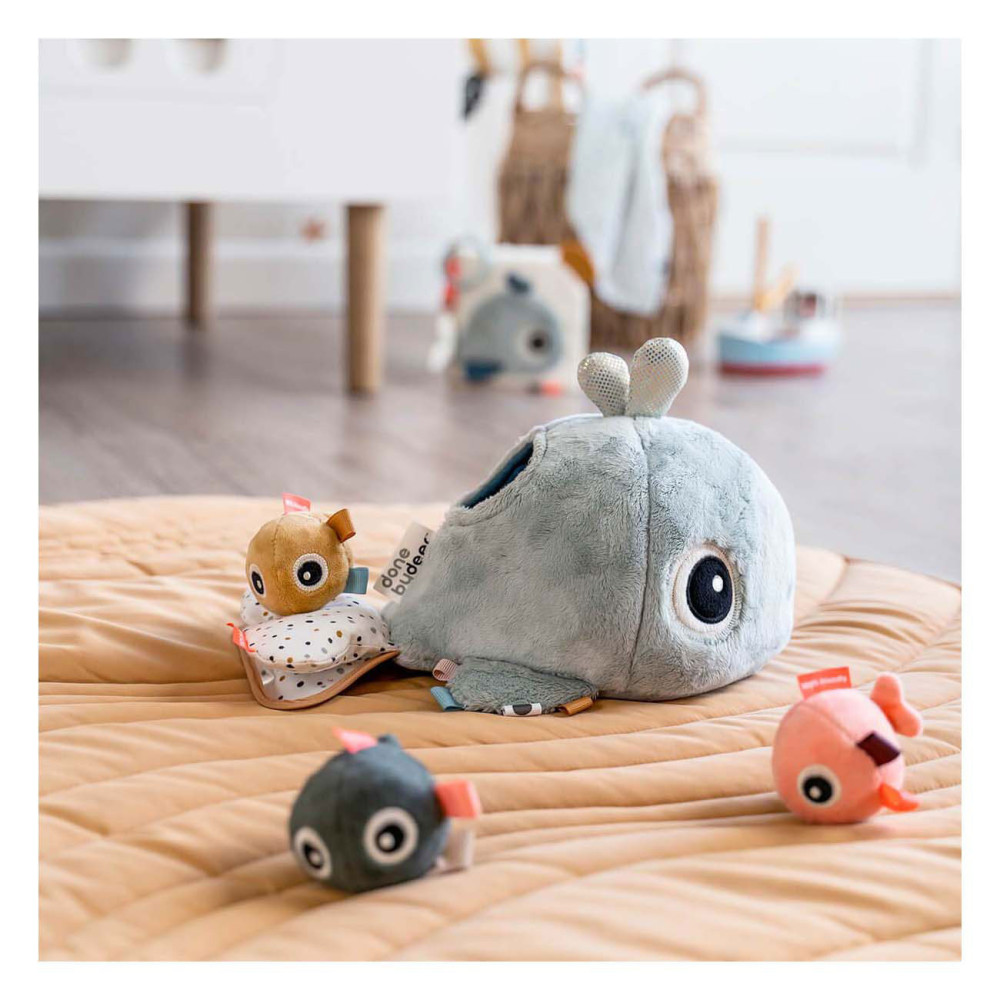 • Mooie blauwe kleuren en verschillende texturen op de schattige walvis stimuleren de zintuigen van uw kind