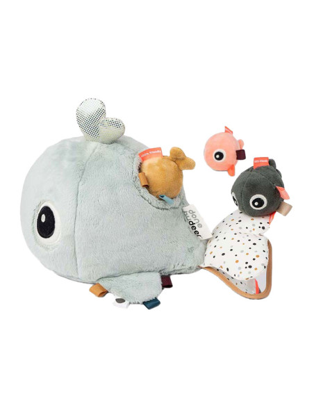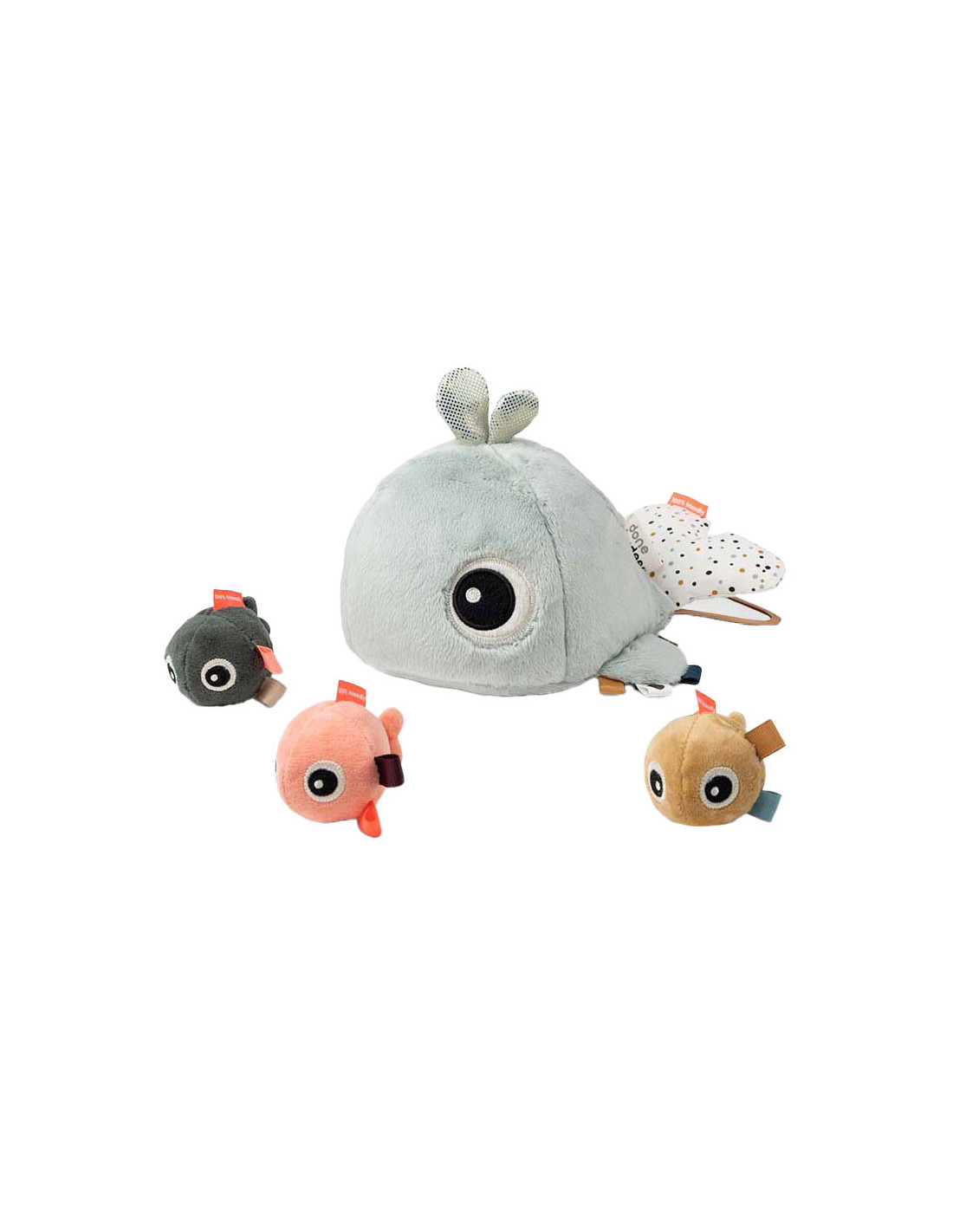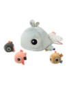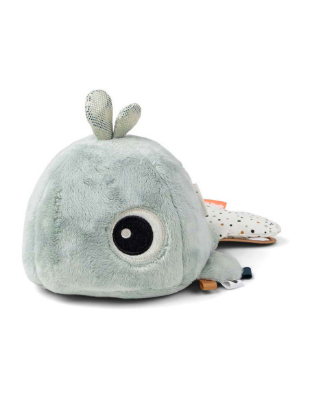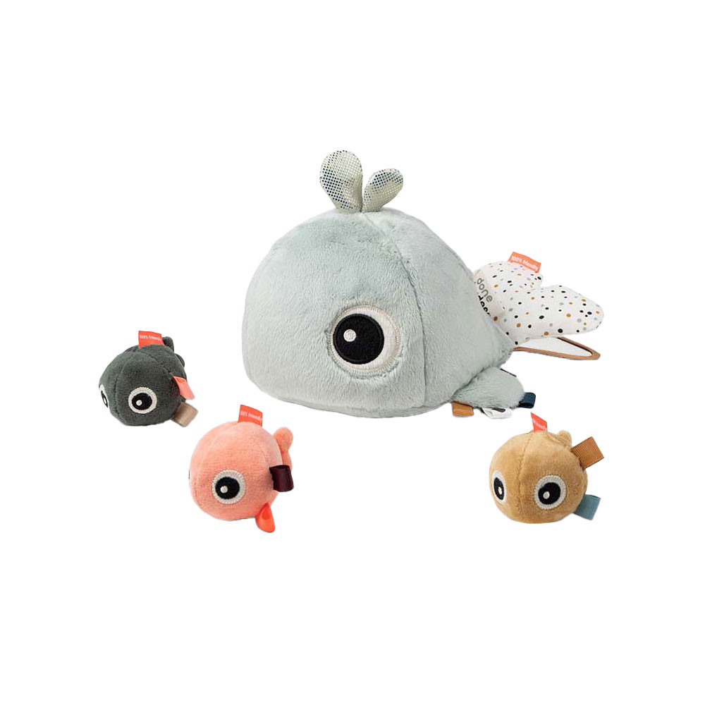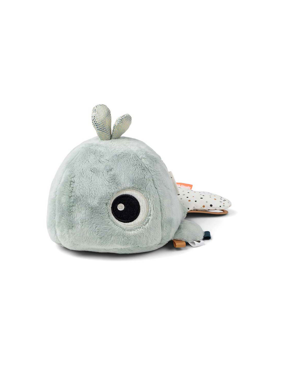 • Mooie blauwe kleuren en verschillende texturen op de schattige walvis stimuleren de zintuigen van uw kind