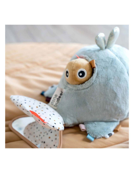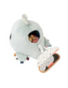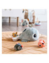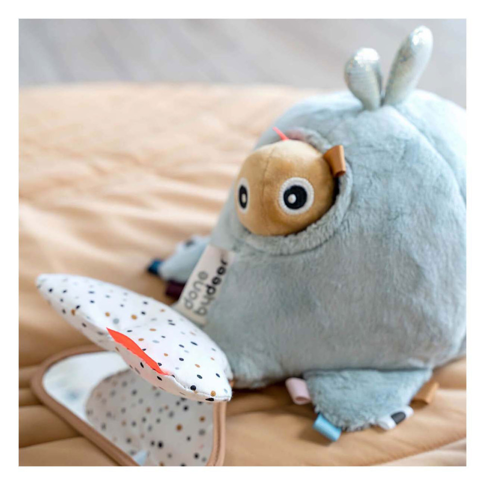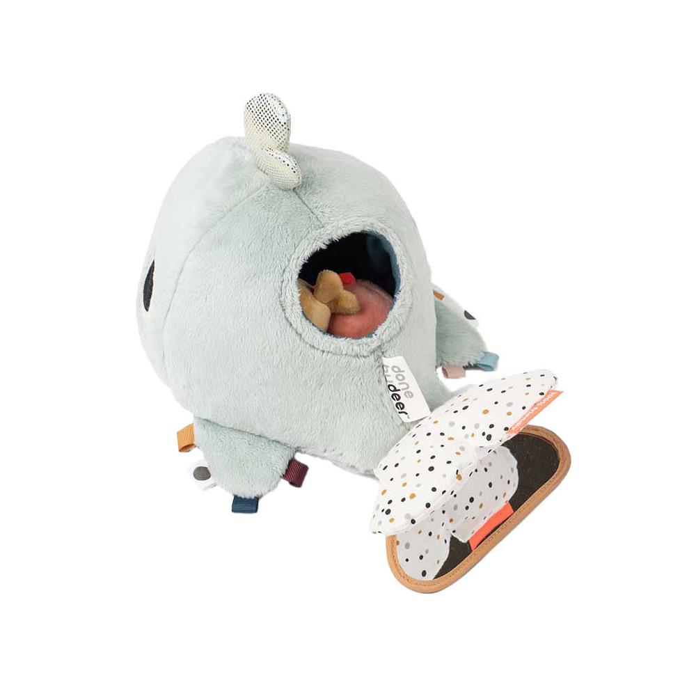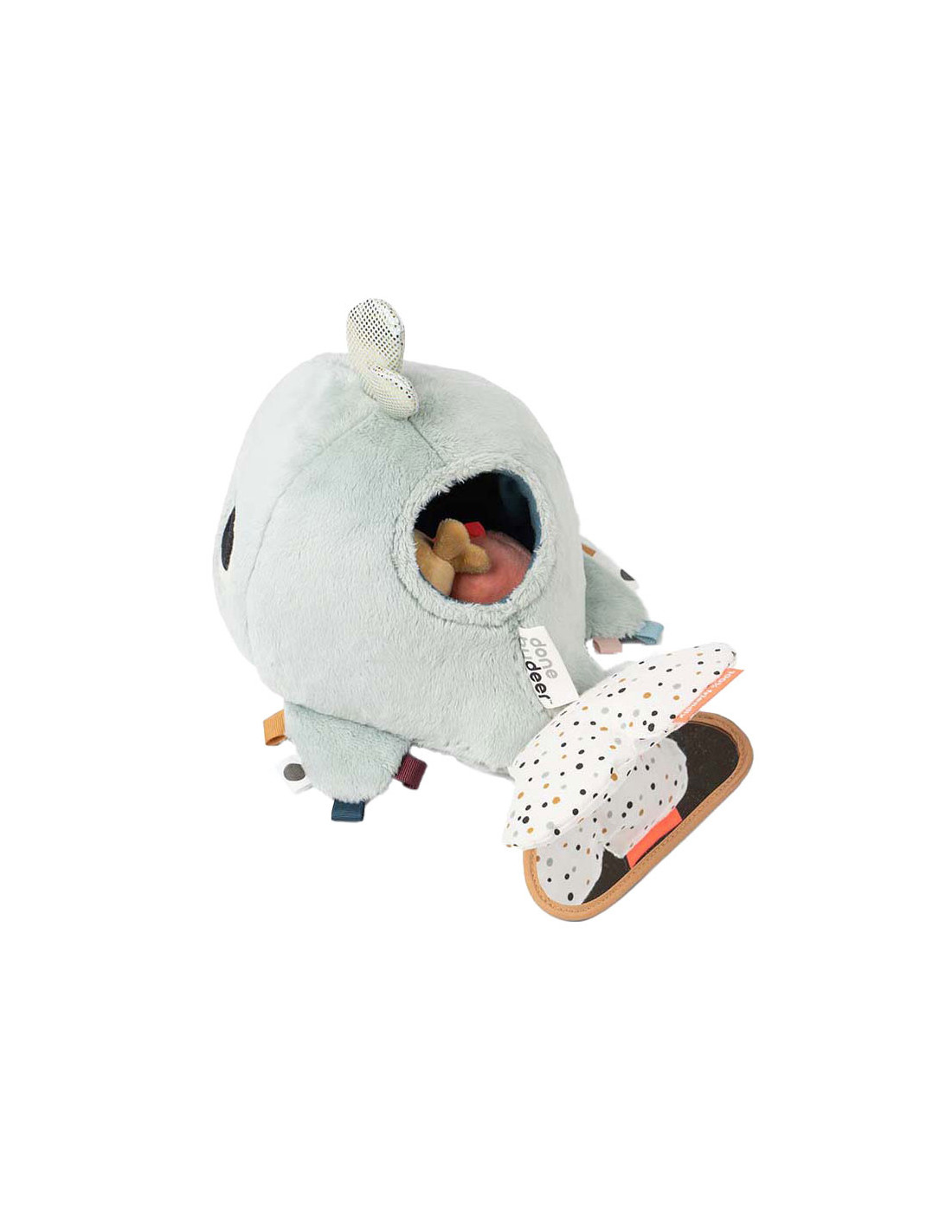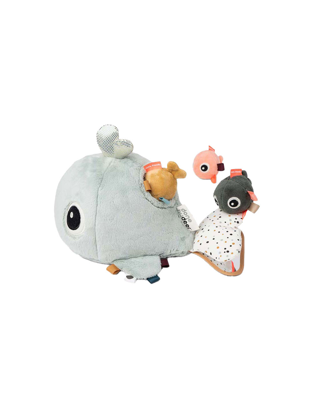 • Mooie blauwe kleuren en verschillende texturen op de schattige walvis stimuleren de zintuigen van uw kind