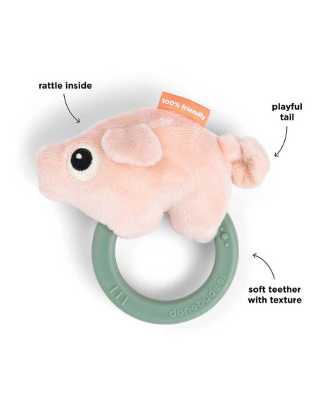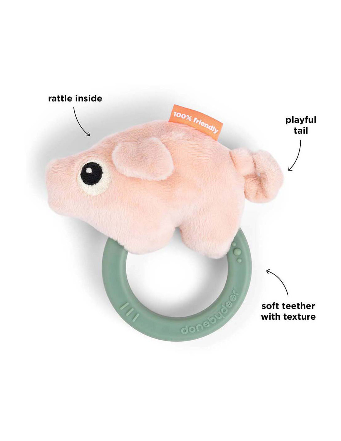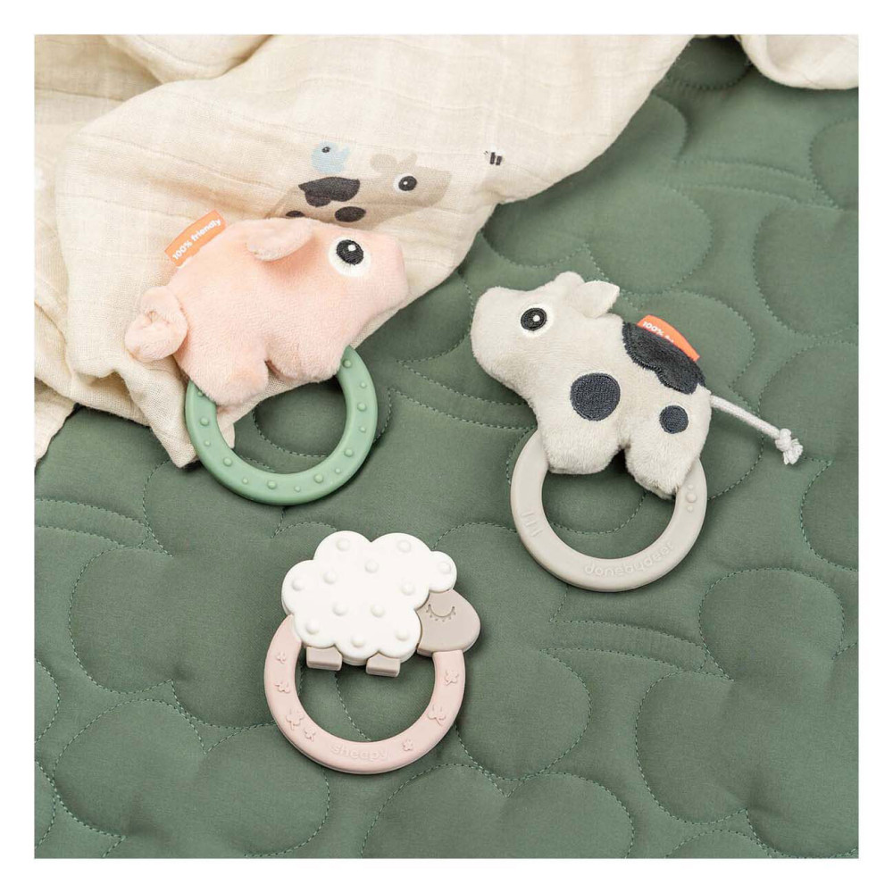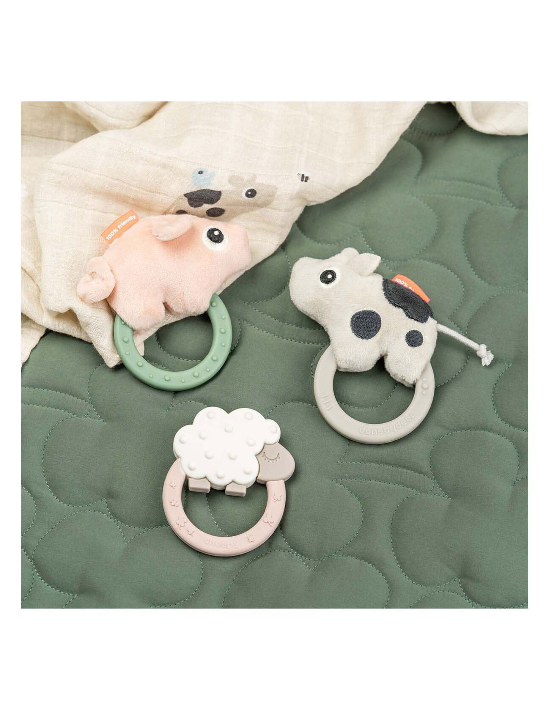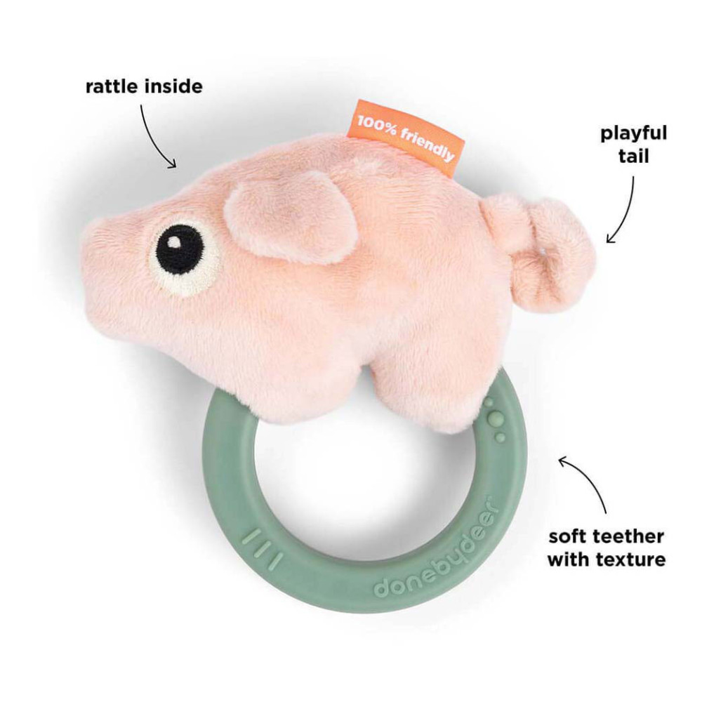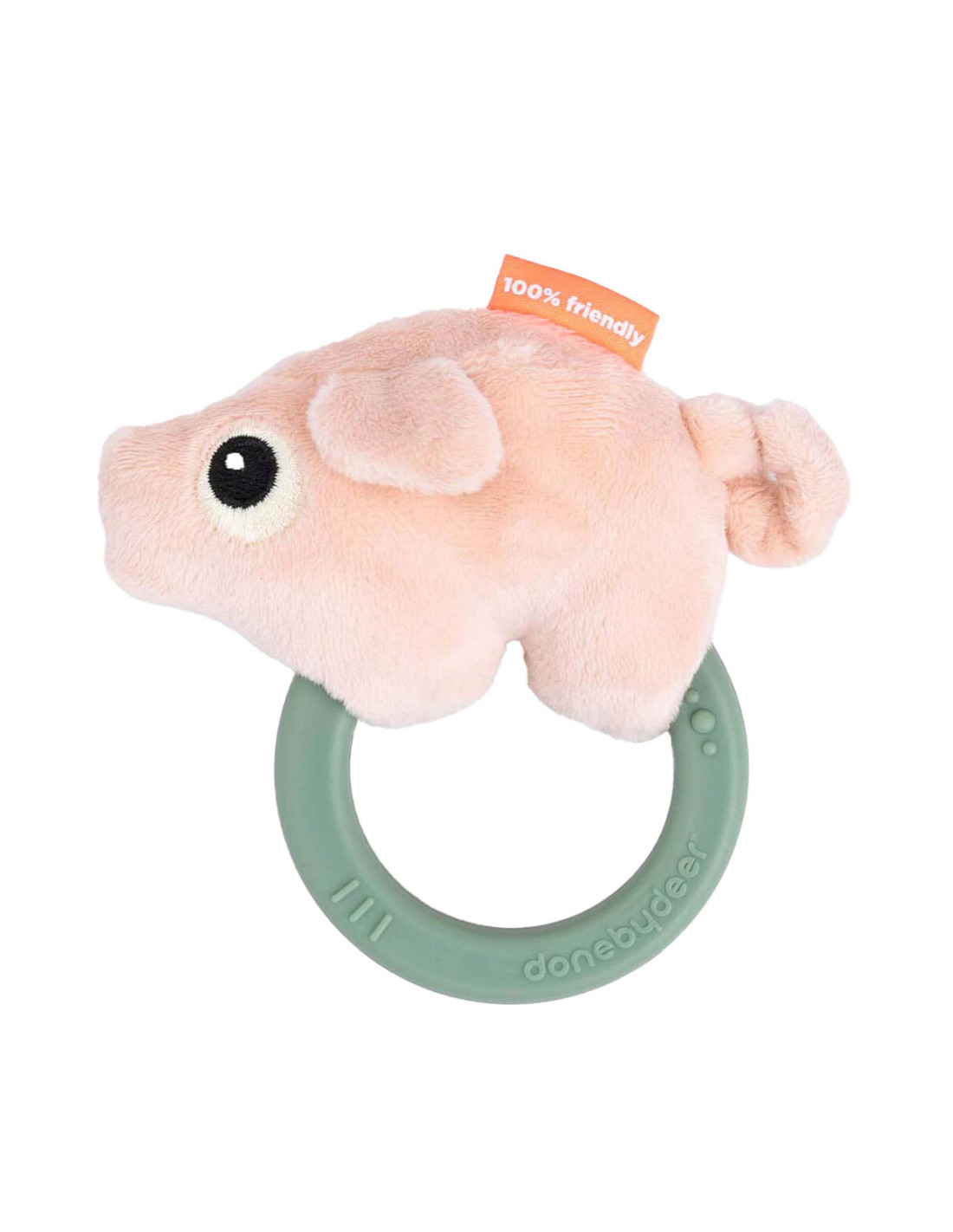 Deze sensorische rammelaar is ontworpen om je baby te sussen en te vermaken. De bijtring is perfect om pijnlijk tandvlees te kalmeren en te stimuleren tijdens het doorkomen van de tandjes, terwijl de kleurrijke elementen je kleintje visueel stimuleren. Deze rammelaar met Pigee en zijn krullende staartje is ideaal voor het verkennen van de zintuigen en het doorkomen van de tandjes van je baby!