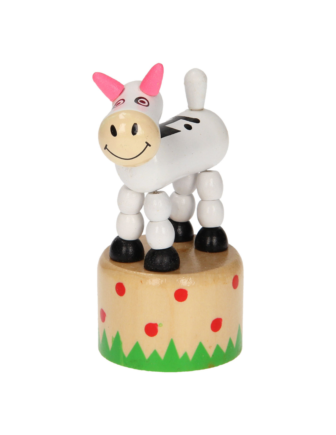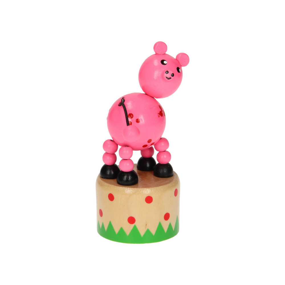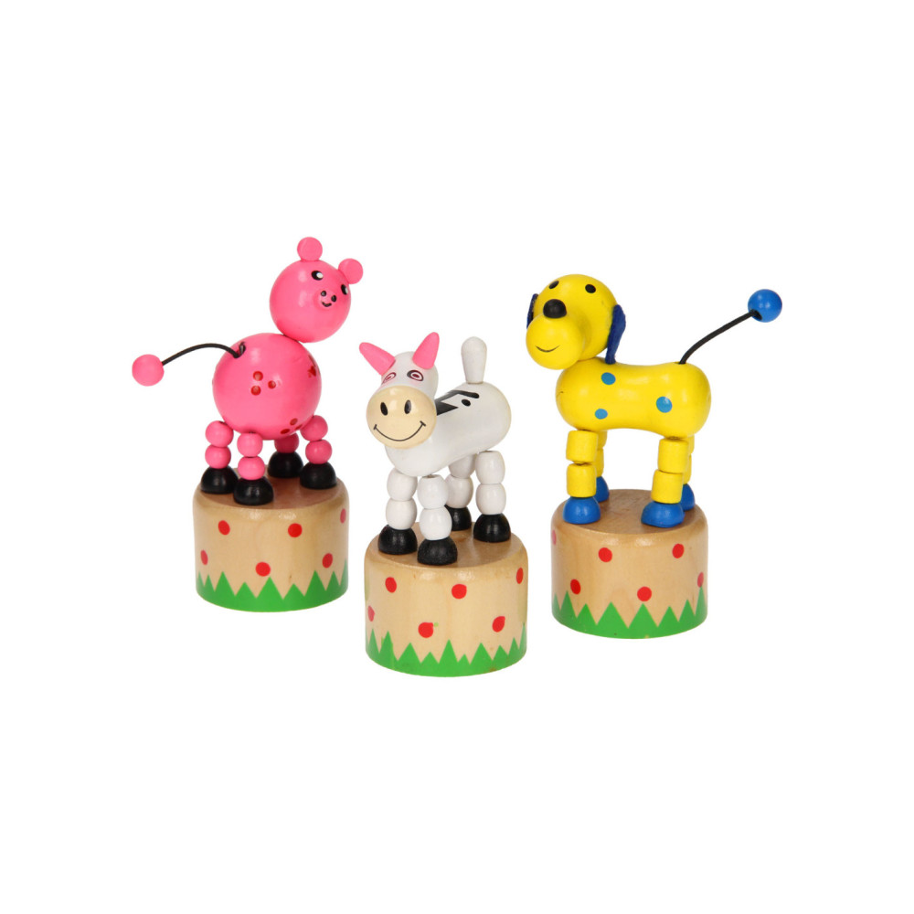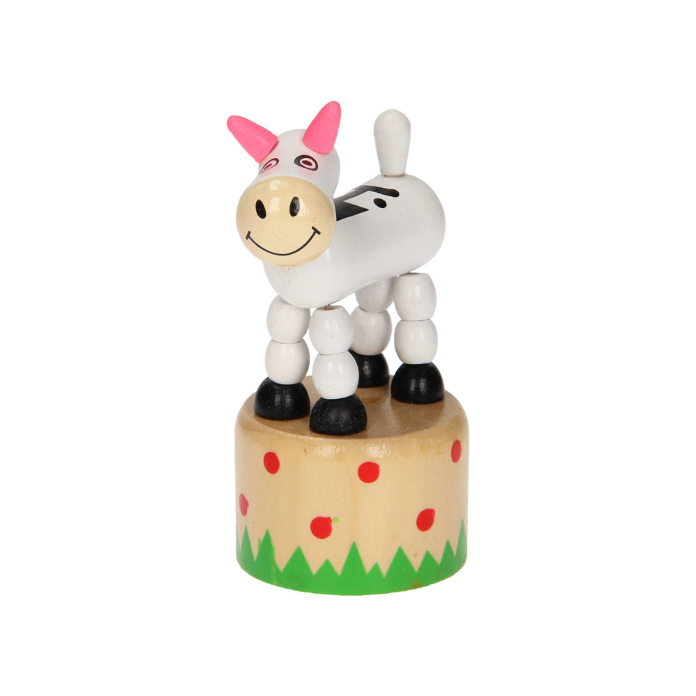 Leuk houten drukfiguur in de vorm van een boerderijdier. Druk aan de onderkant van het dier en het gaat allemaal grappige kunstjes doen.
