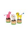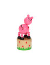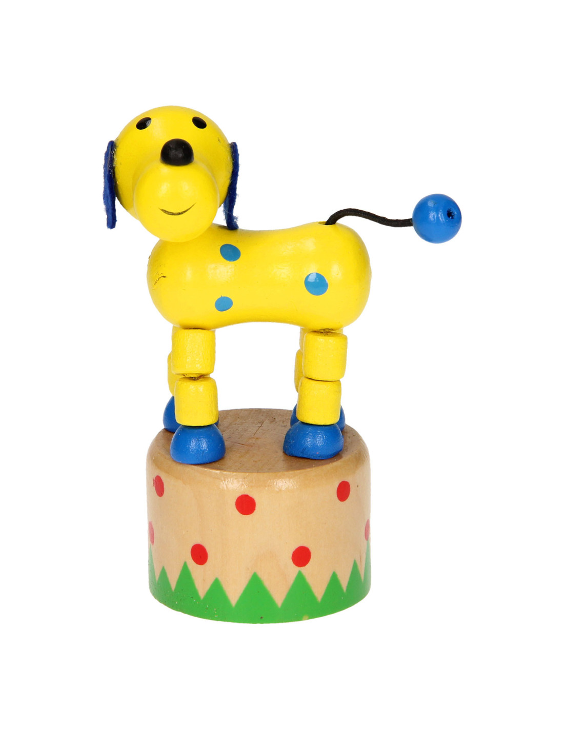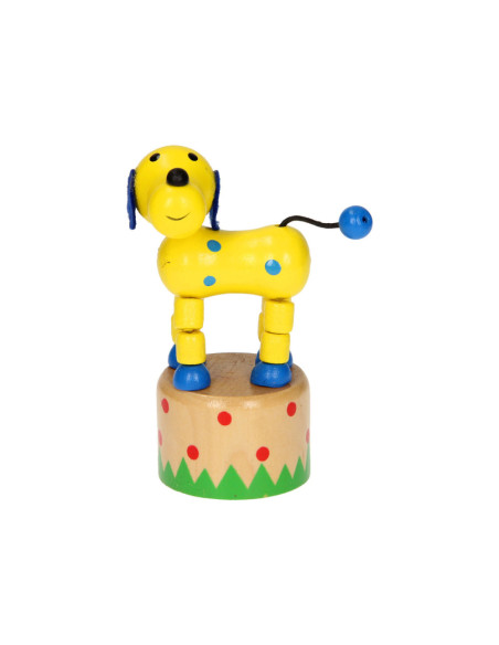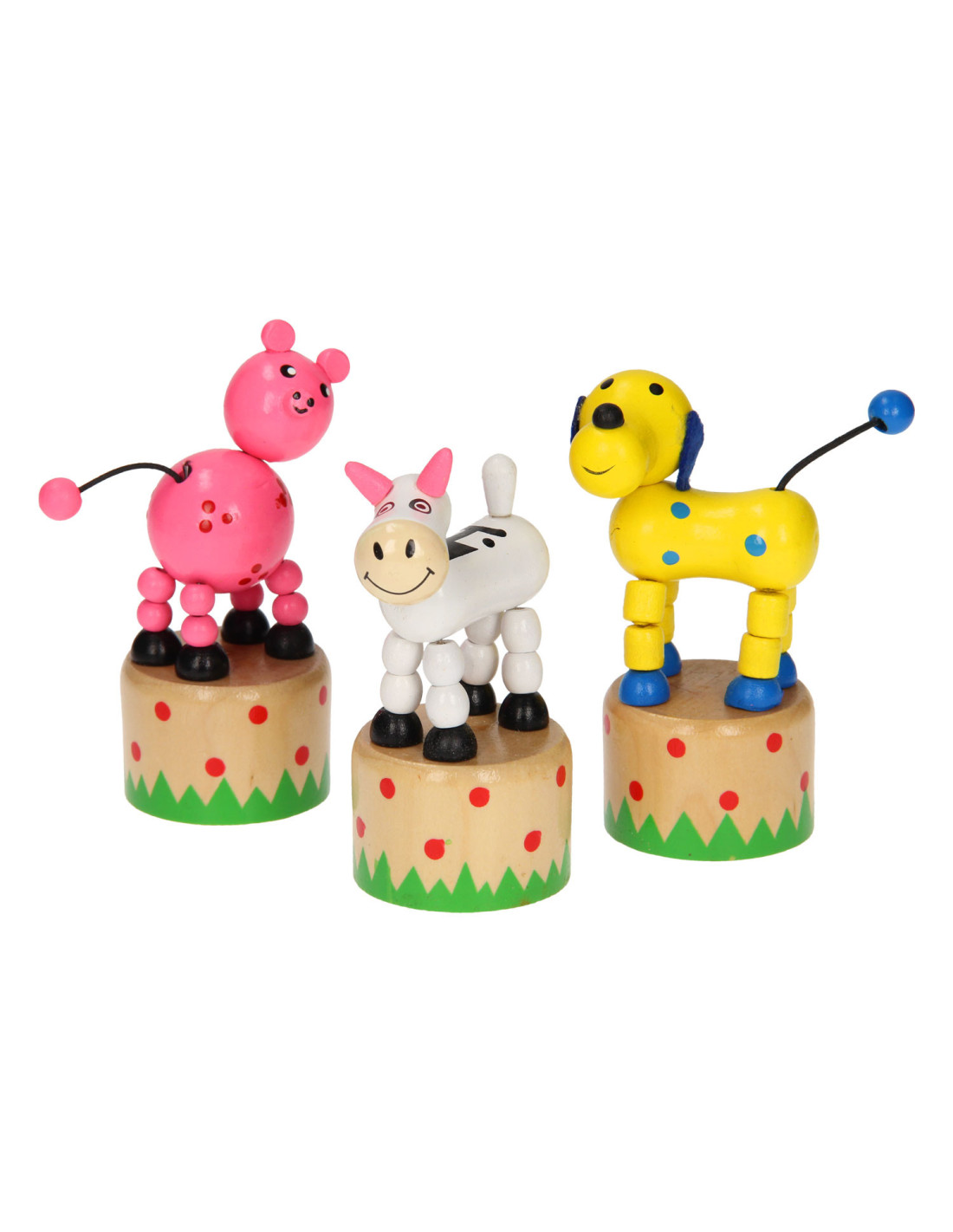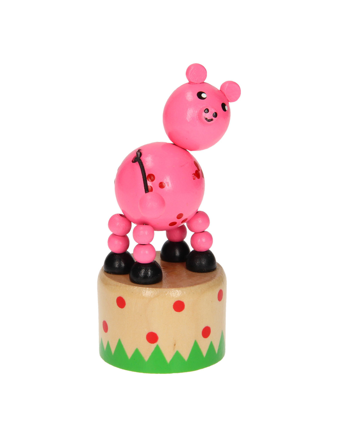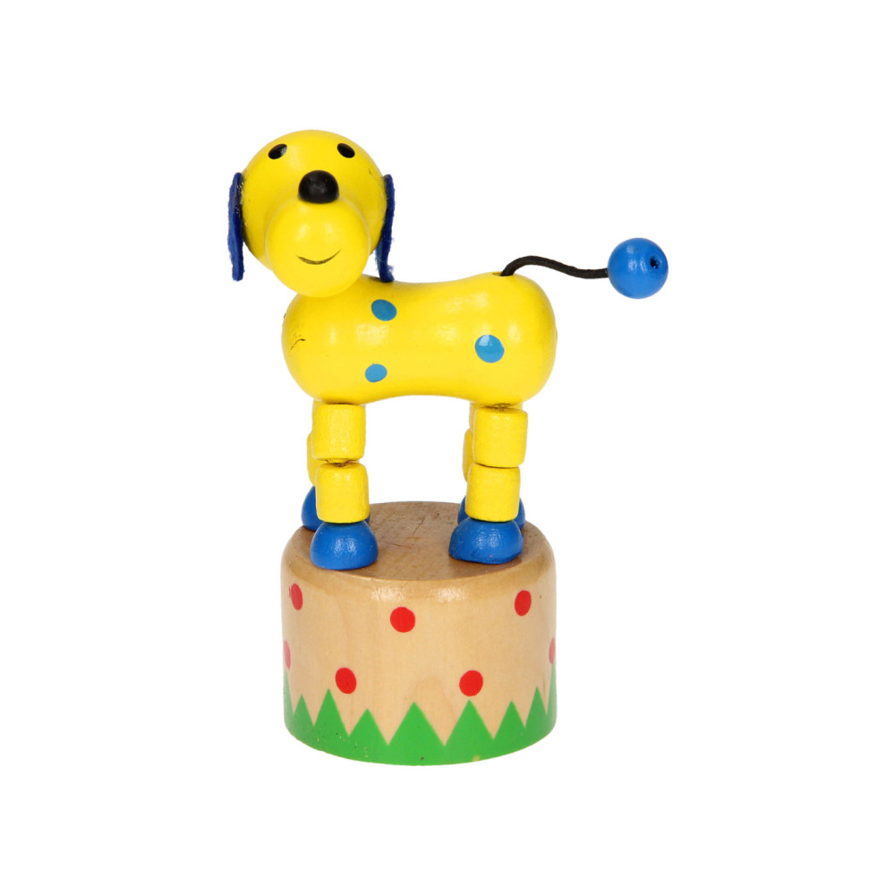 Leuk houten drukfiguur in de vorm van een boerderijdier. Druk aan de onderkant van het dier en het gaat allemaal grappige kunstjes doen.