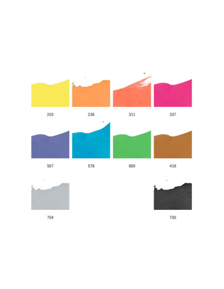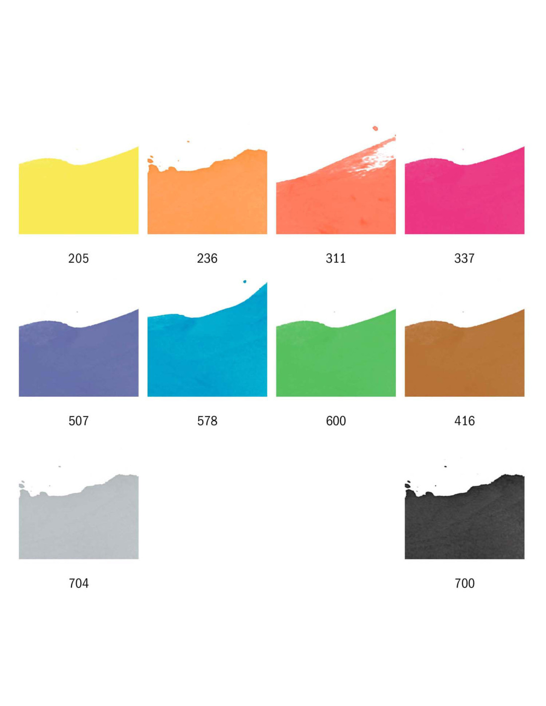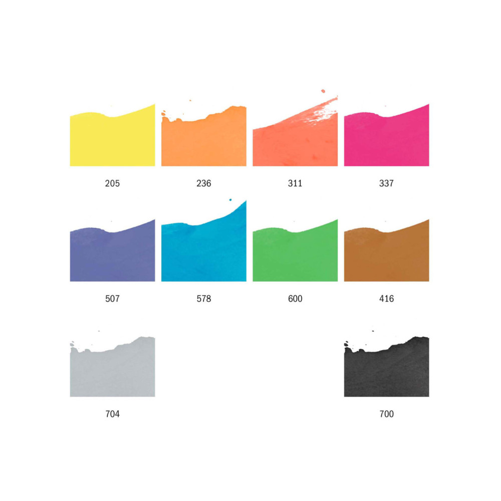 Inhoud: 10x30ml flesjes (205 Citroengeel (Primair) - 236 Licht Oranje - 311 Vermiljoen - 337 Magenta - 507 Ultramarijn Violet - 578 Hemelsblauw (Cyaan) - 600 Groen - 416 Sepia - 704 Grijs - 700 Zwart).