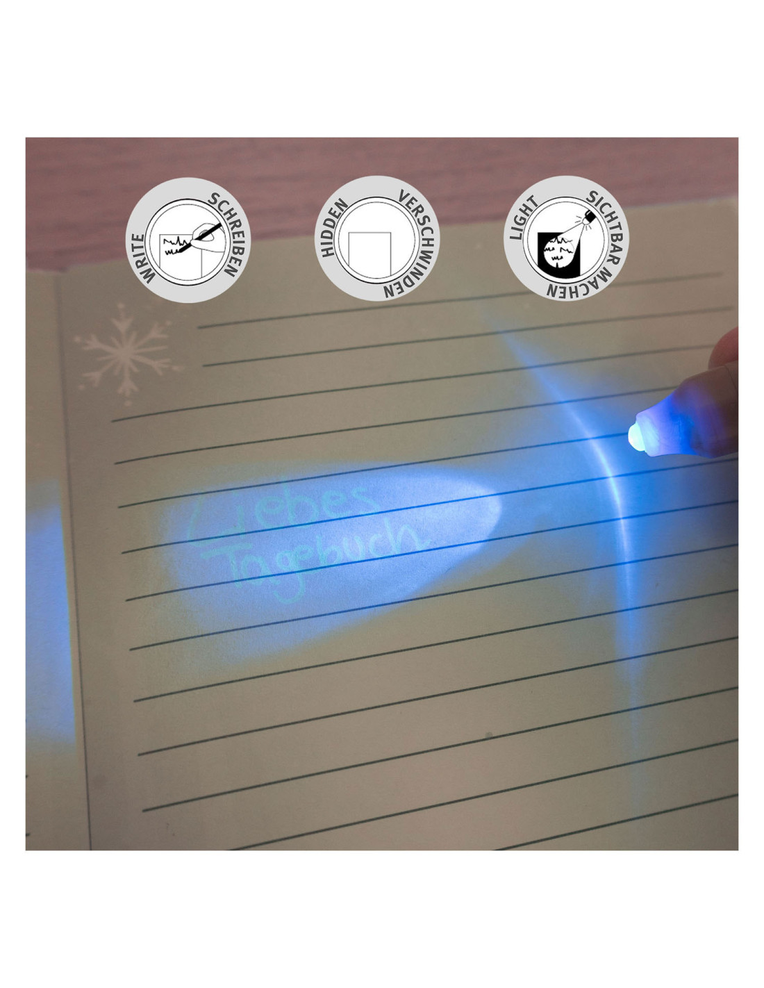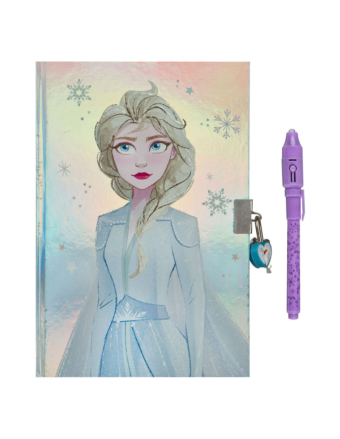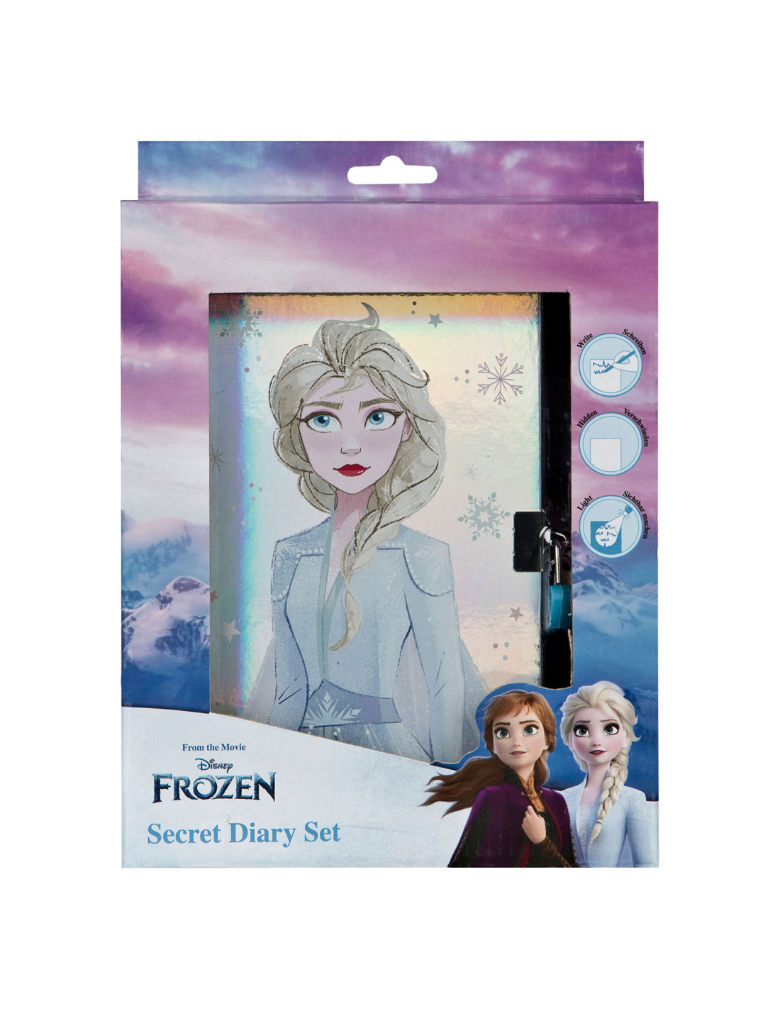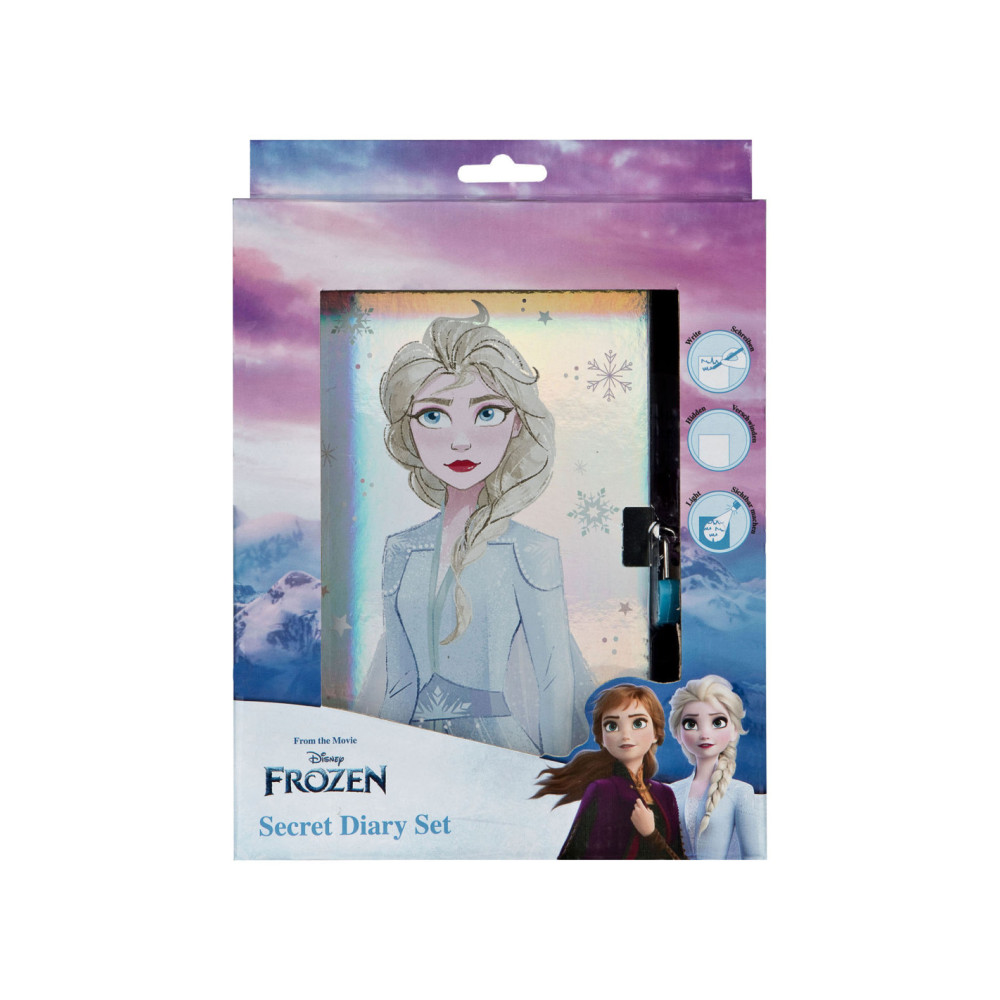 Inhoud: 1 Frozen-dagboek met slot en sleutel, 1 geheimschriftpen met licht.