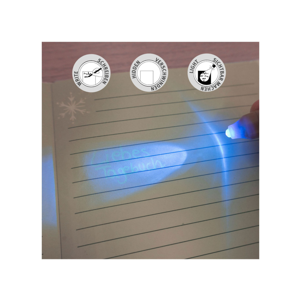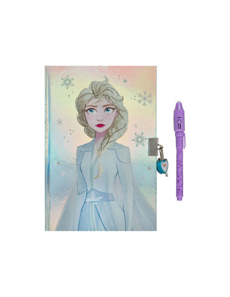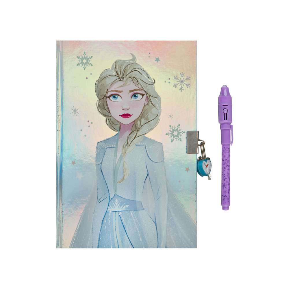 Met dit Frozen-dagboek weet je echt 100% zeker dat je geheimen veilig zijn. Ze staan namelijk niet alleen achter slot en grendel van het hartvormige slotje, maar je kunt ze ook opschrijven met de speciale geheimschrift pen! Wat je opschrijft, is onzichtbaar en alleen te lezen met het licht van de speciale pen. Aan Elsa kun je al je geheimen en dromen kwijt!