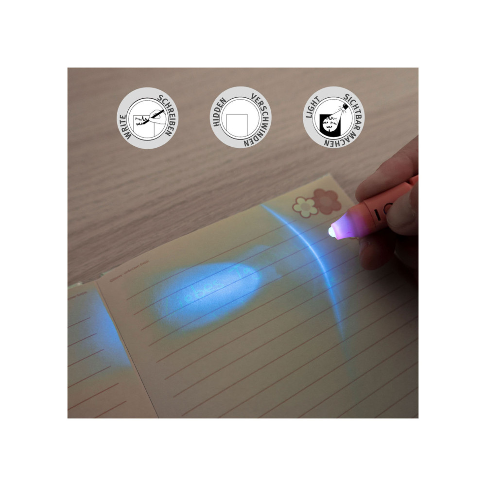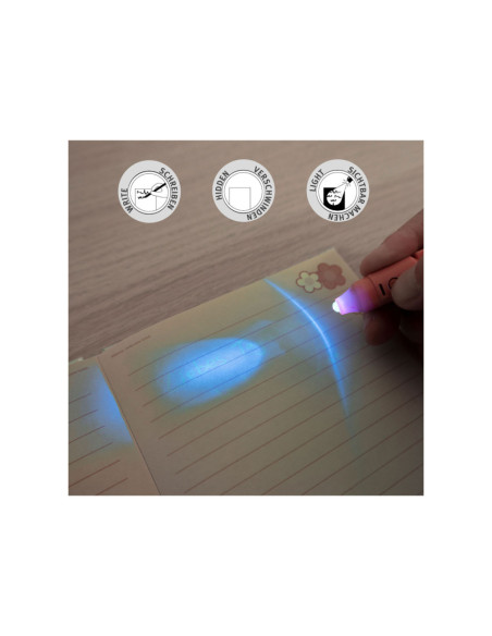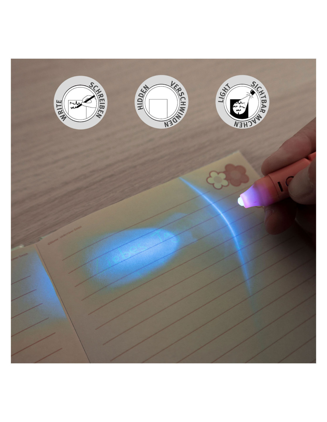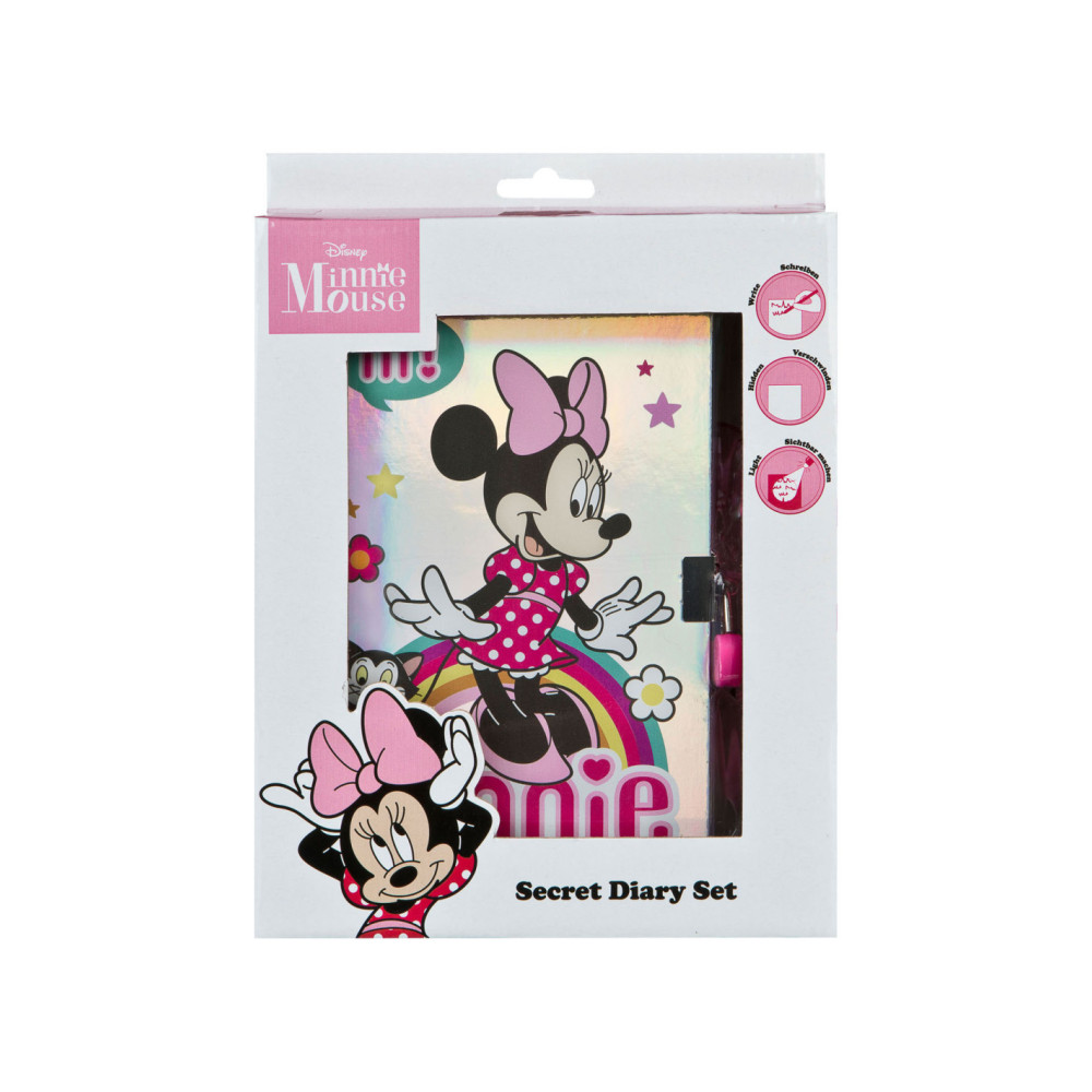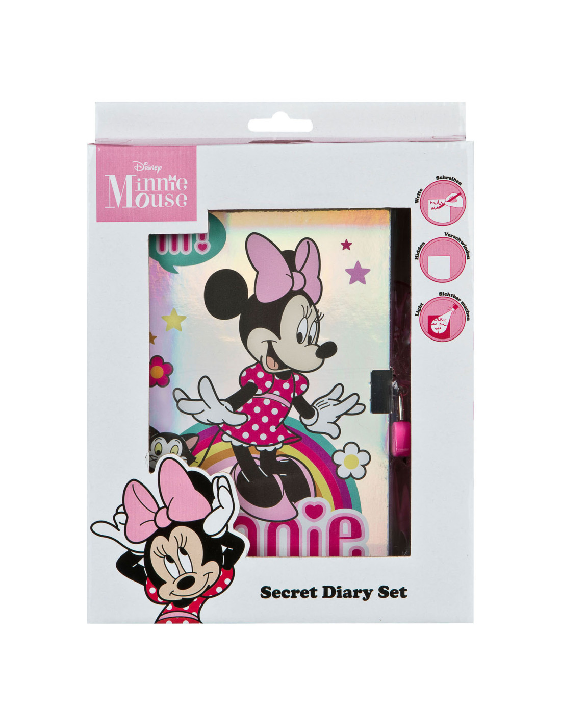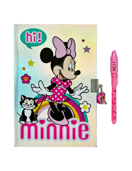 Dagboek van Minnie Mouse met slot + sleutel en een geheimschriftpen met speciaal UV-licht. Afmetingen: 20 x 25 centimeter. Geschikt voor kinderen vanaf 3 jaar.