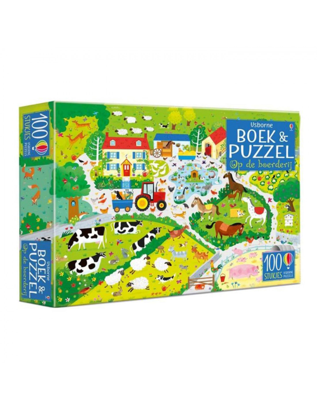 Samen in een kleurige, stevige doos: een levendige puzzel van 100 stukjes met een afbeelding van een boerderij waar van alles gebeurt, en een kleurig puzzelboekje van 24 pagina’s. De puzzel is 59 x 40 cm groot en zowel de puzzel als het puzzelboek staat vol dingen om te ontdekken en over te praten. Zie je een koe met een bel, vijf vossen, een plastic eendje, en nog veel meer?