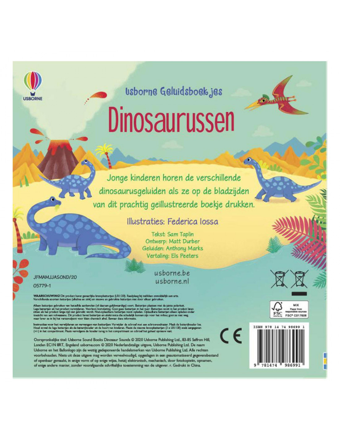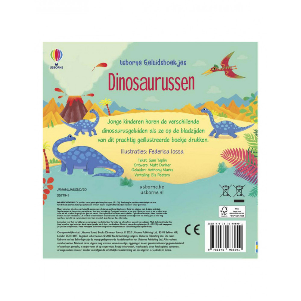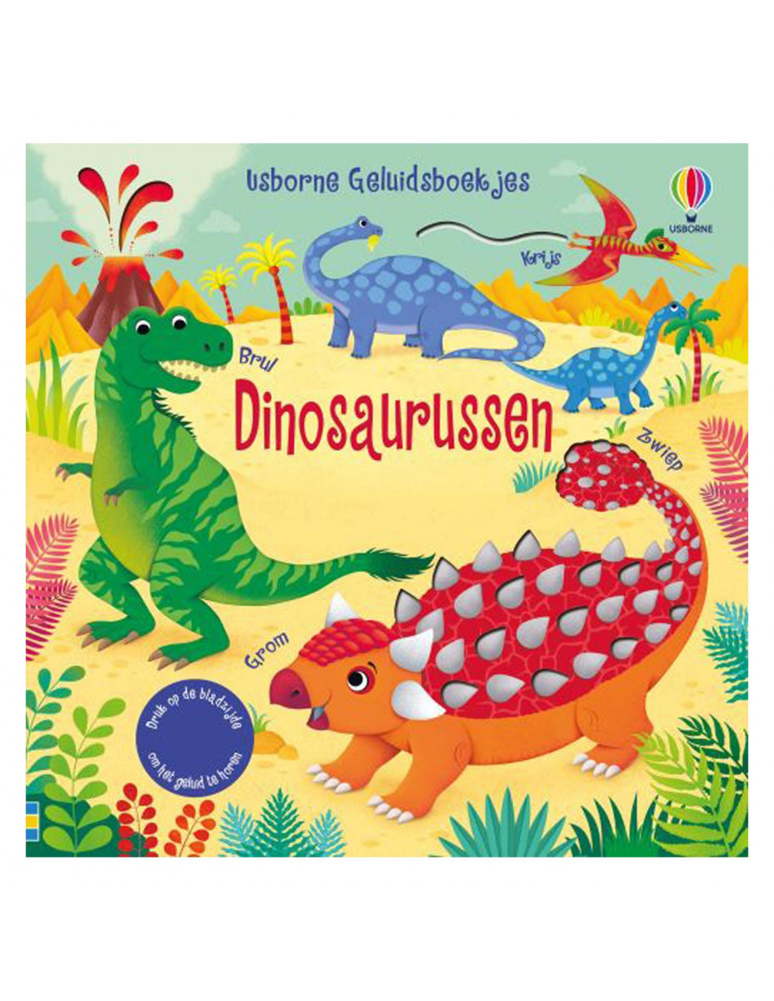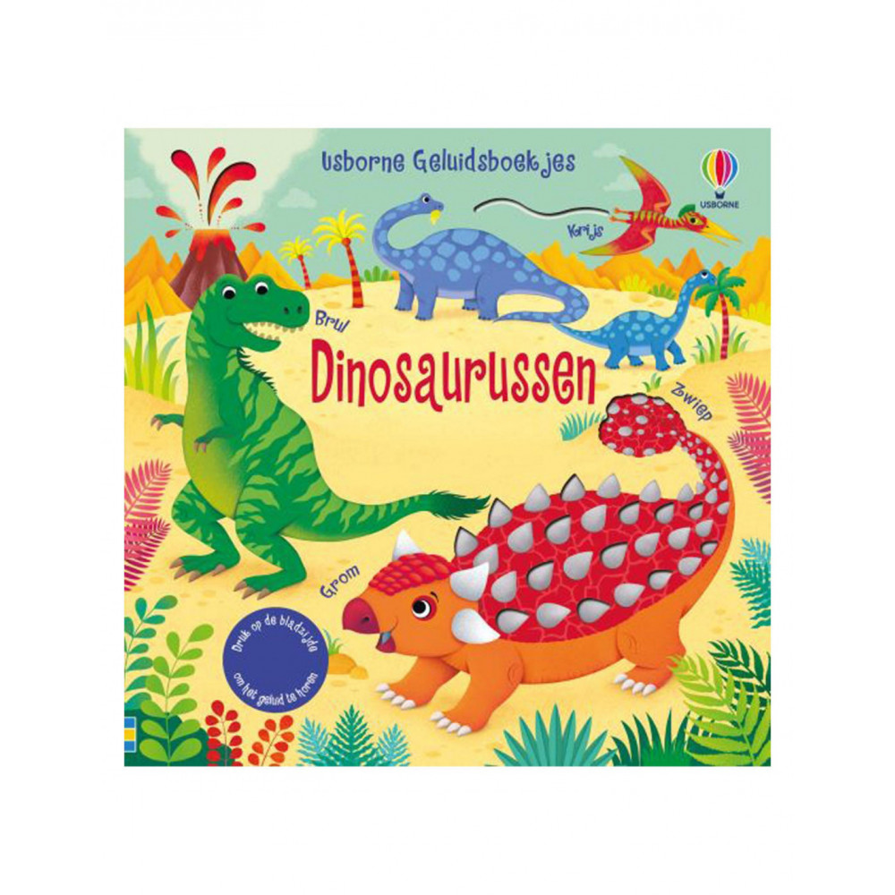 Jonge kinderen horen de verschillende dinosaurusgeluiden als ze op de bladzijden van dit prachtig geïllustreerde boekje drukken.