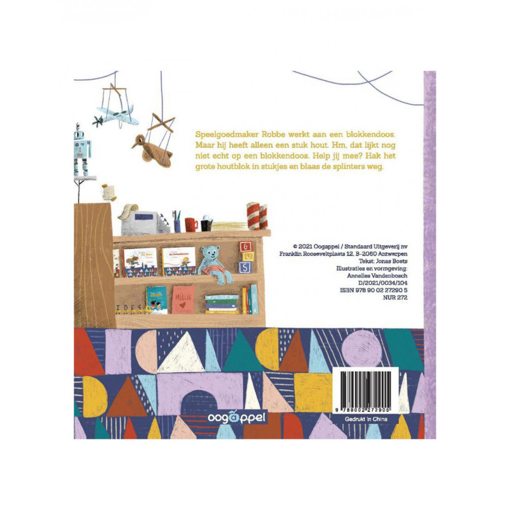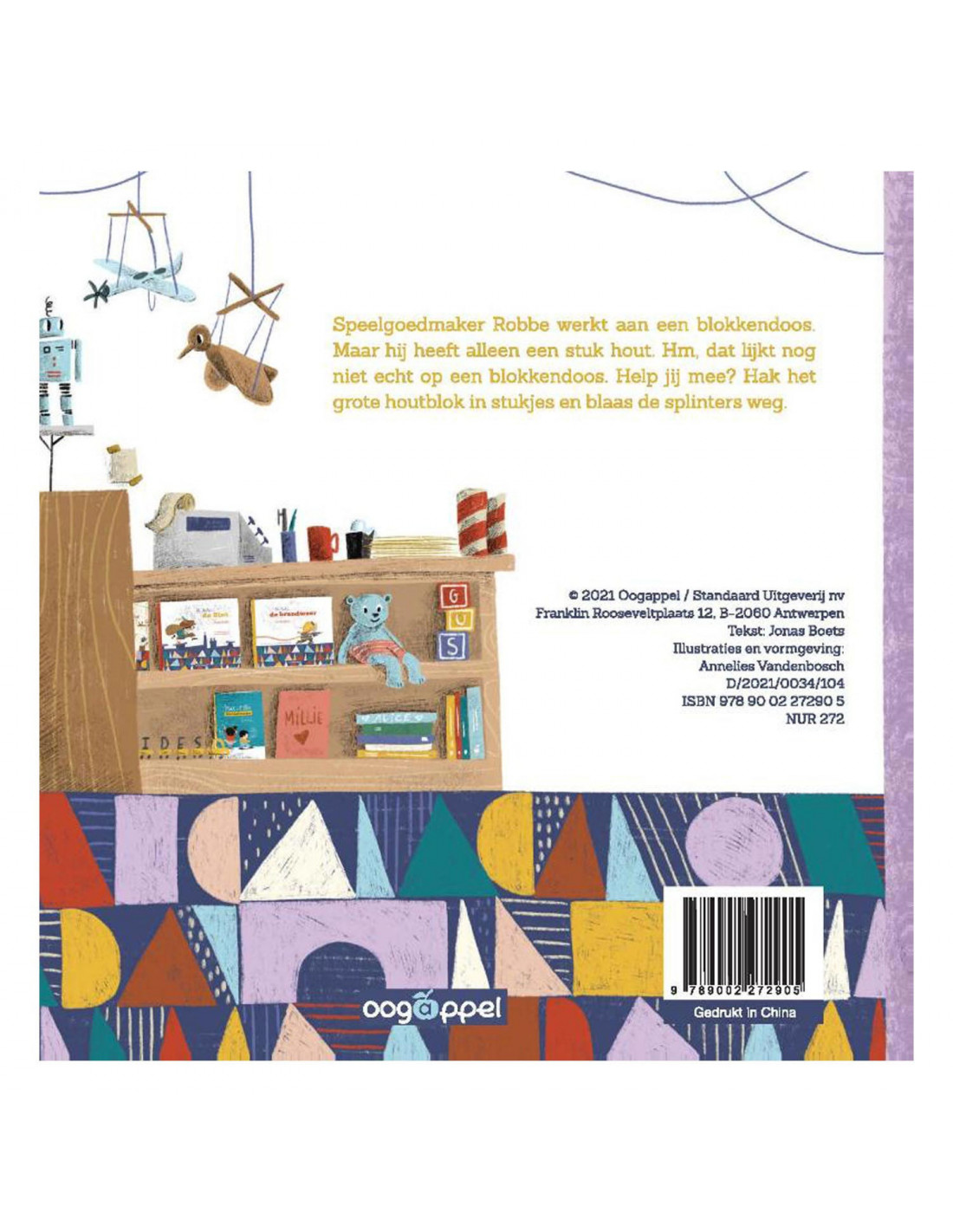 Speelgoedmaker Robbe werkt aan een blokkendoos. Maar hij heeft alleen een stuk hout. Hmm, dat lijkt nog niet echt op een blokkendoos. Help jij mee? Hak het grote houtblok in stukjes en blaas de splinters weg. Ik help… de speelgoedmaker is het derde boek in de reeks Ik help…. Stuk voor stuk originele doeboeken die op speelse wijze leesplezier stimuleren.