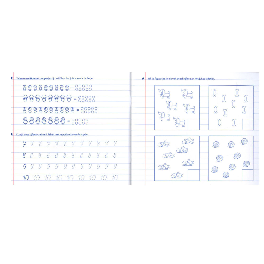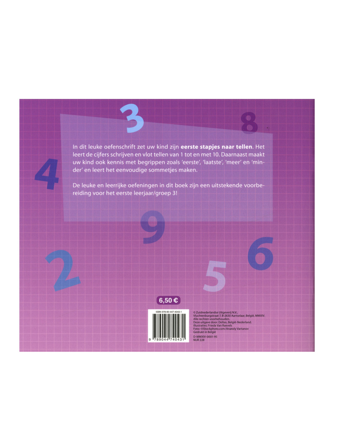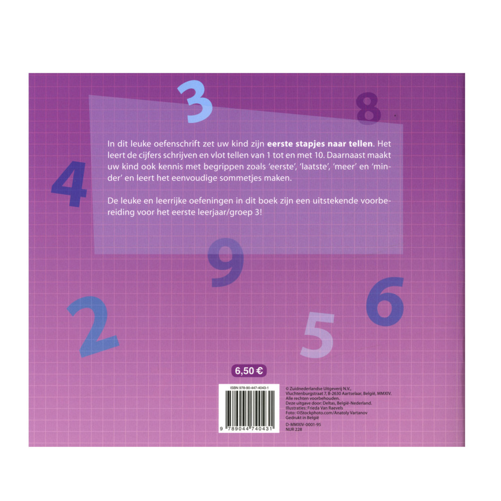 In dit leuke oefenschrift zet uw kind zijn eerste stapjes naar tellen. Het leert de cijfers schrijven en vlot tellen van 1 tot en met 10. Daarnaast maakt uw kind ook kennis met begrippen zoals eerste, laatste, meer en minder en leert het eenvoudig sommetjes maken.