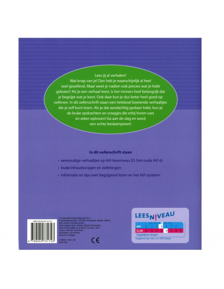 Ga aan de slag en word een echte leeskampioen! In dit oefenschrift staan: *eenvoudige verhaaltjes op leesniveau AVI E5 (het oude AVI 6) *leuke inhoudsvragen en oefeningen *informatie en tips over begrijpend lezen en het AVI-systeem.