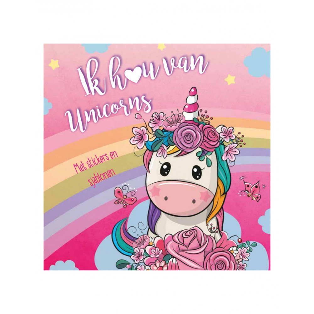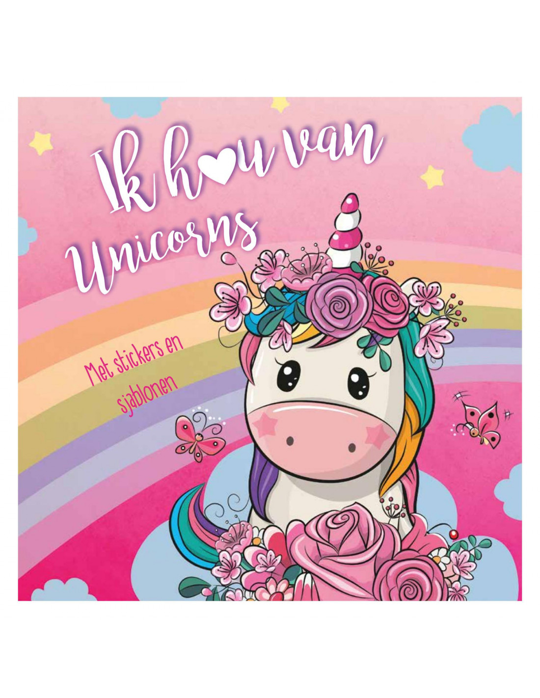Ik hou van unicorns! Sticker- en sjablonenboek met eenhoornthema, met spelletjes en kleurplaten. Met ringband. Geschikt voor kinderen van 3 tot 8 jaar oud.