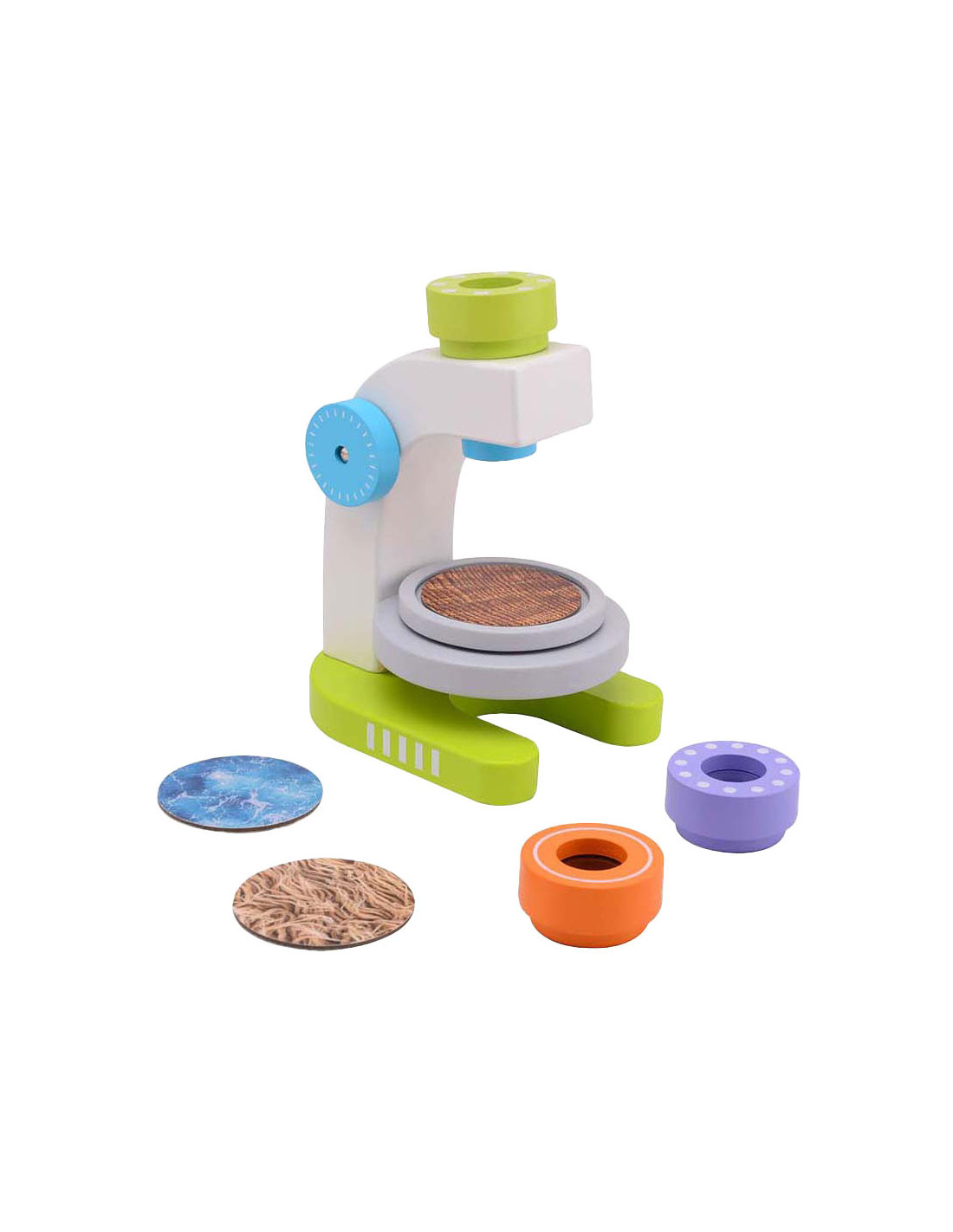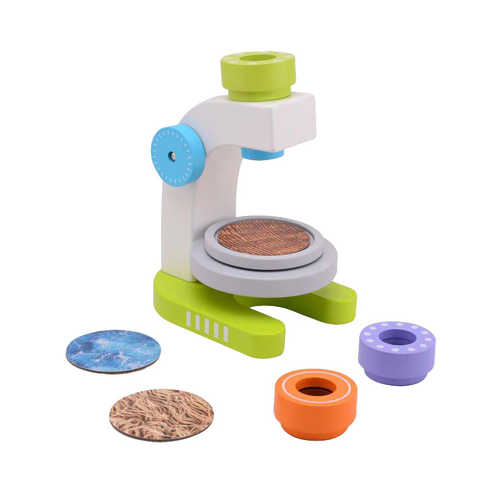 Houten microscoop met 3 lenzen en 3 schijven. Geschikt voor kinderen vanaf 3 jaar. De microscoop is 15,0 × 11,5 ×1 9,0 cm groot.